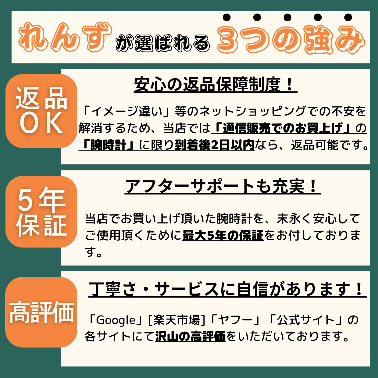 | 当店保証 / Our guarantee | 3年 ※保証についてはコチラ ※正常なご使用で生じた内部機械の自然故障に限ります |