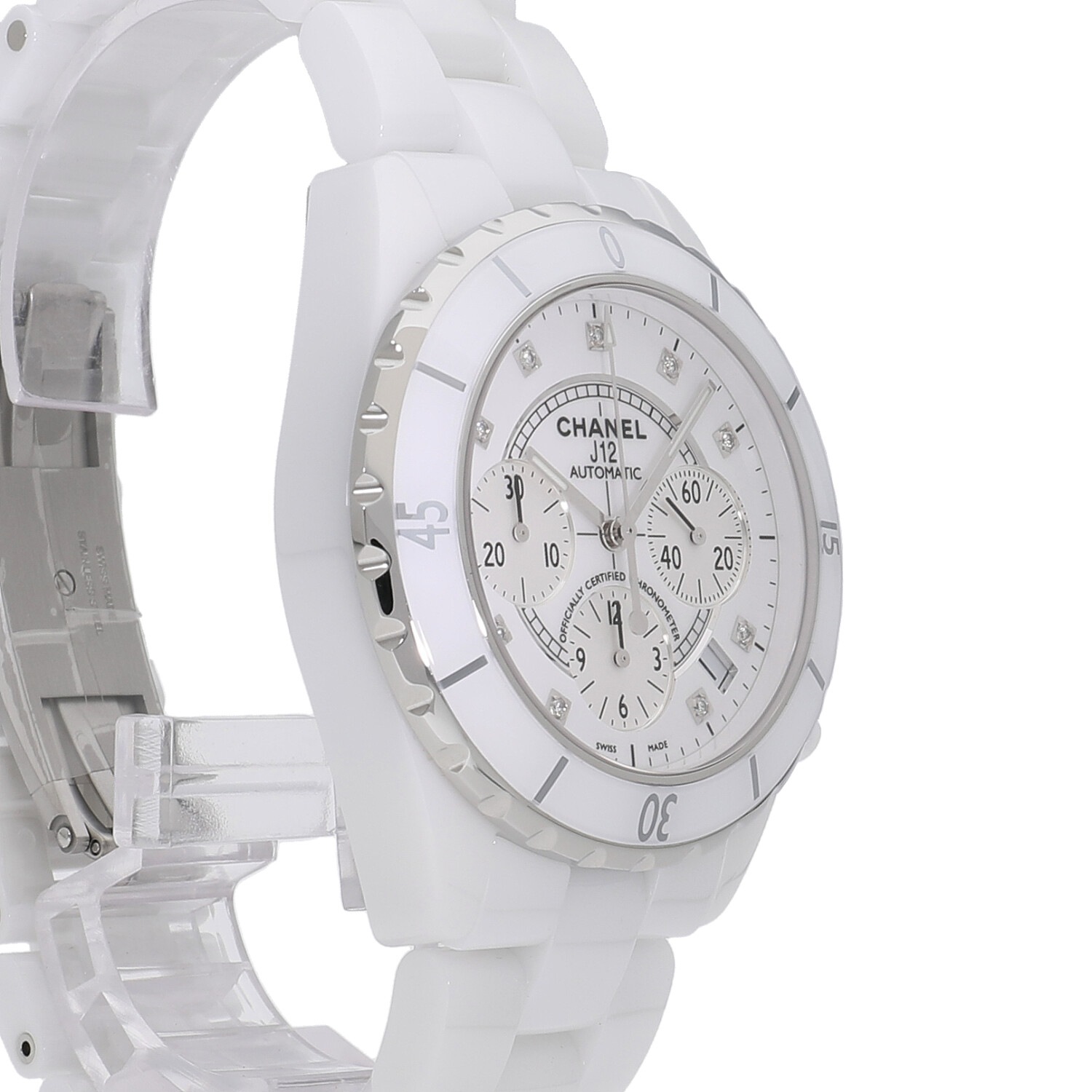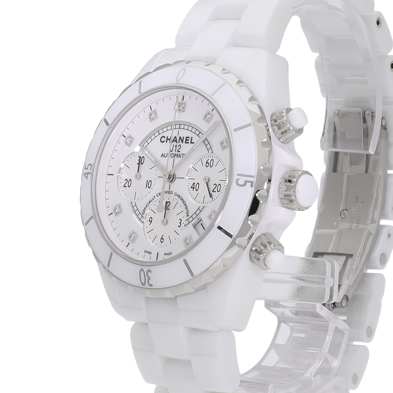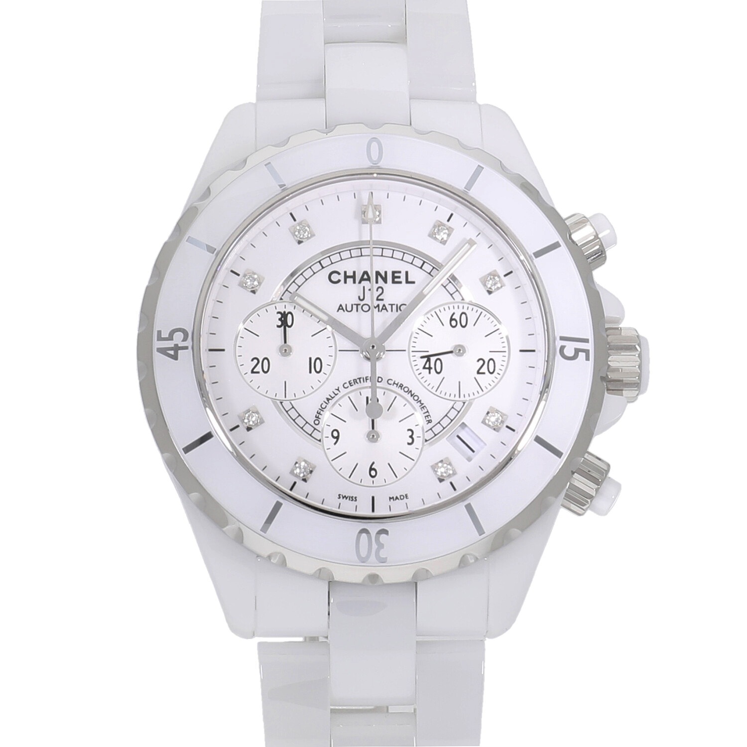 | モデルについて / Features | 2000年に発売されて以来、その人気が衰える事を知らないシャネルの”J12”。シャネルのアイコン的タイムピースです。今日、多くの時計にセラミックが使われることになった、きっかけとなったモデルと言っても過言ではありません。男性に人気の高いクロノグラフ機能を搭載し、文字盤のインデックスにはさりげなく9つのダイヤモンドがセットされています。夏の灼けた肌や秋冬のモノトーンコーディネートなど、シーンや季節を問わずご使用いただけるホワイトセラミックは人気が高いです。 |