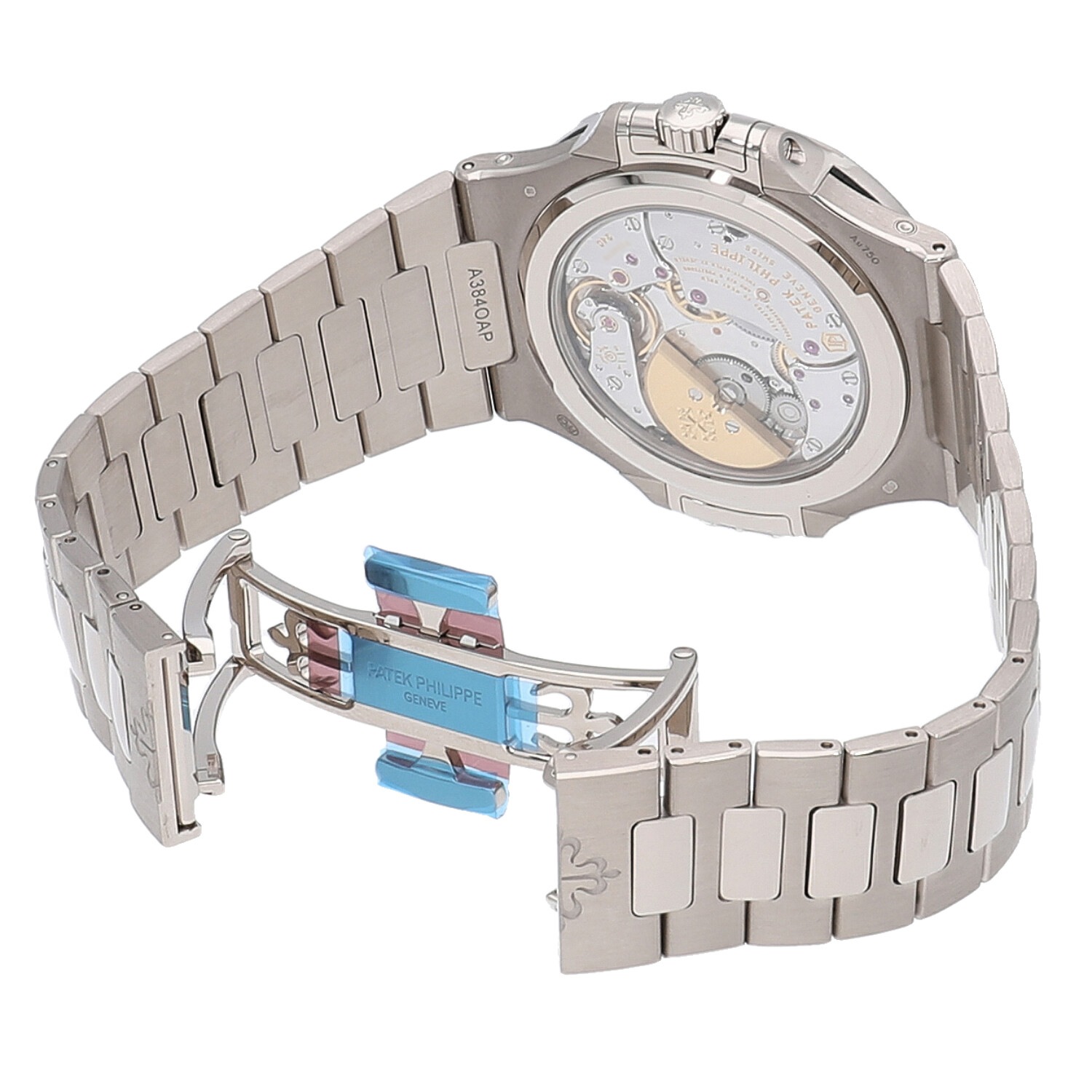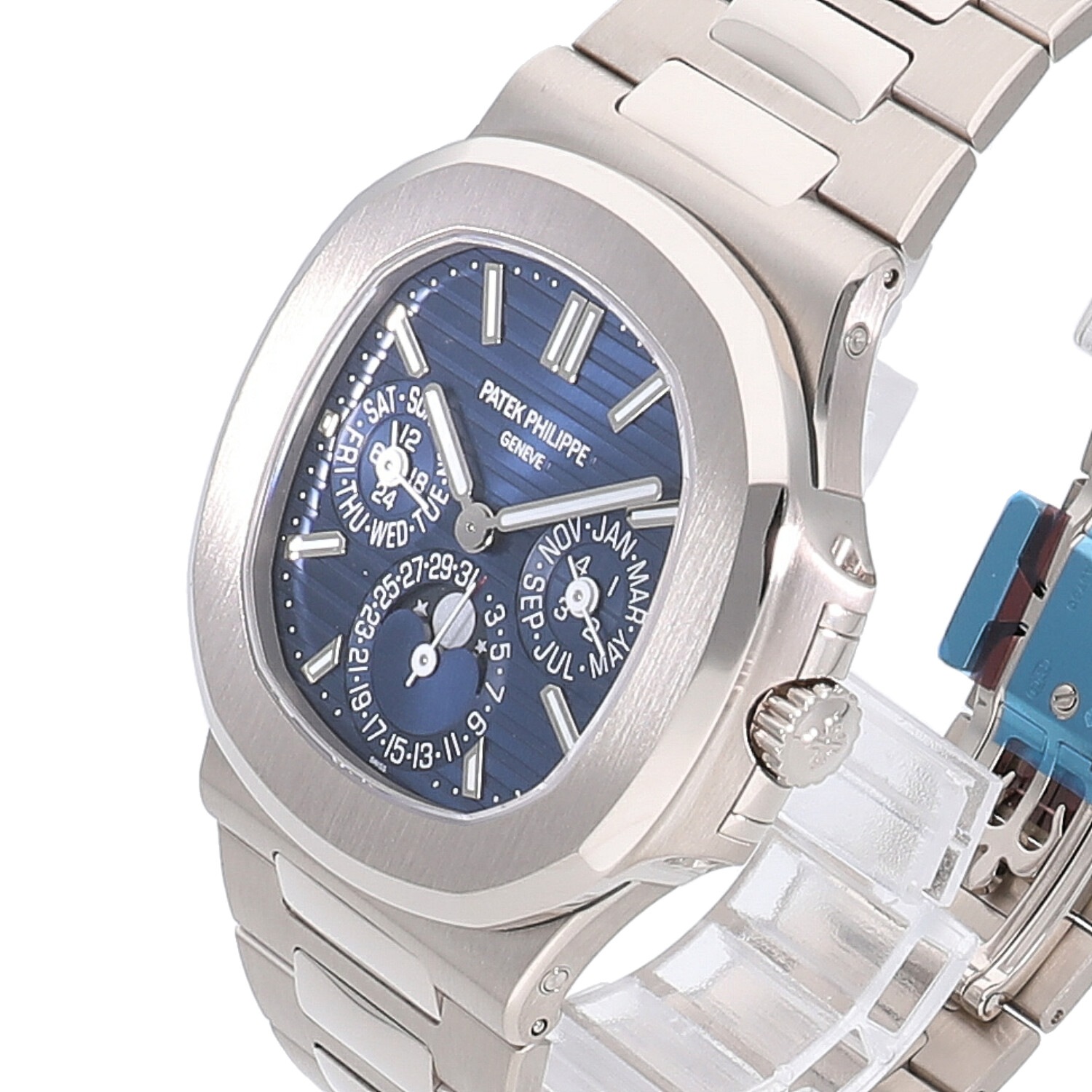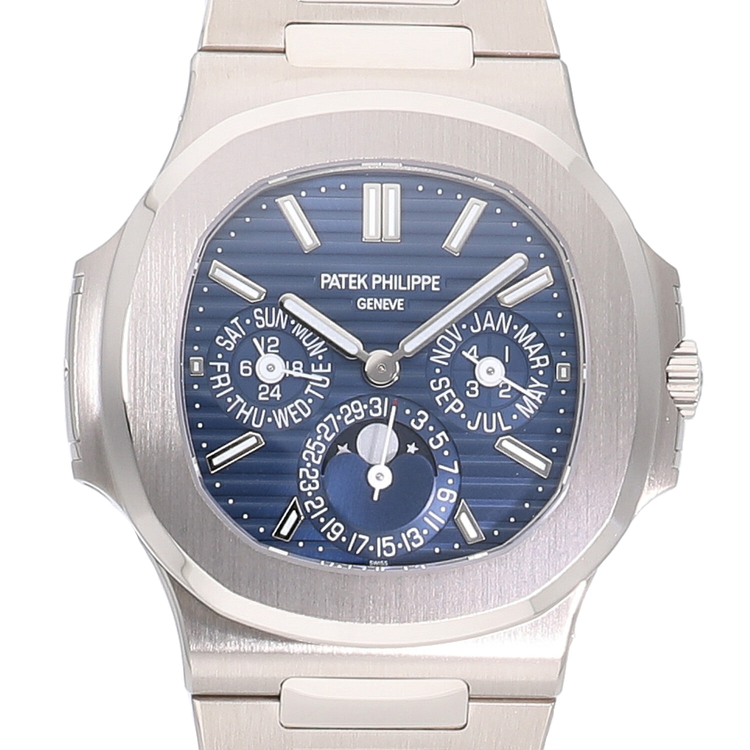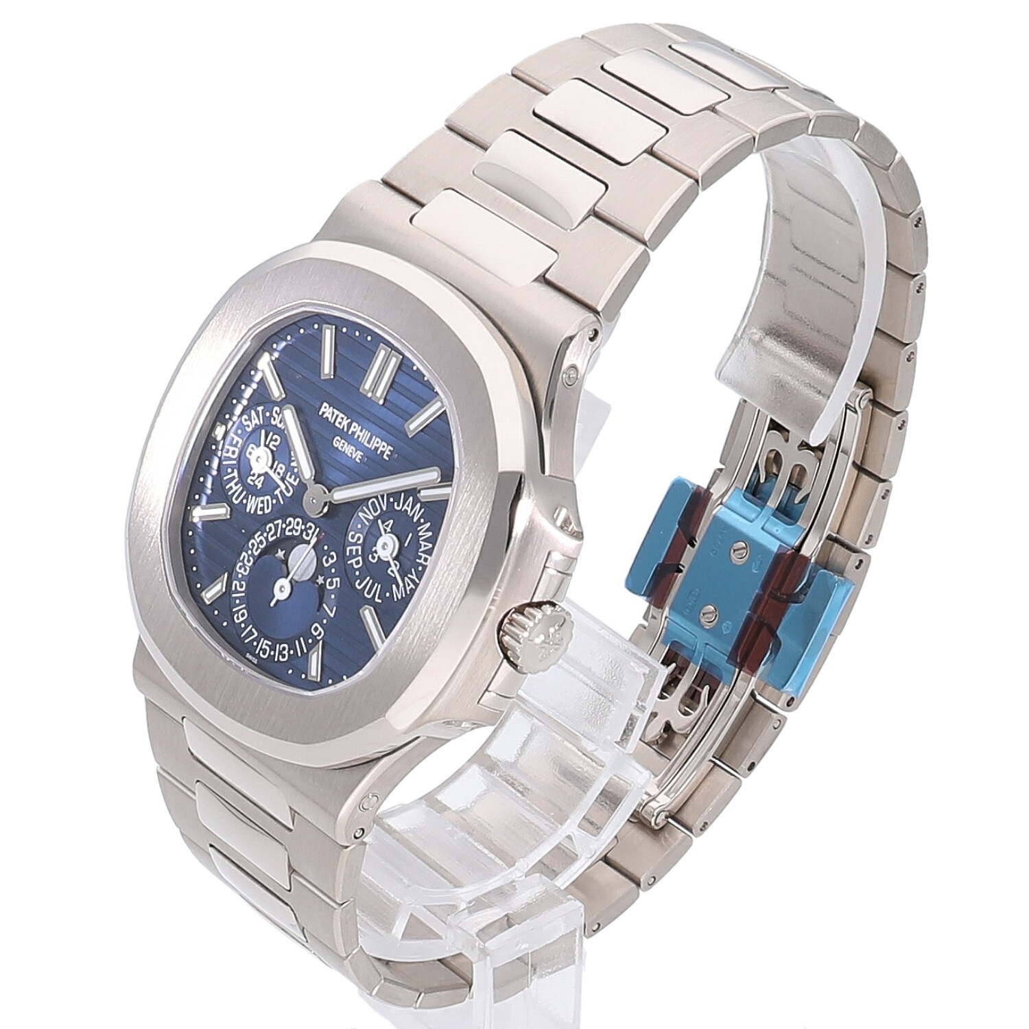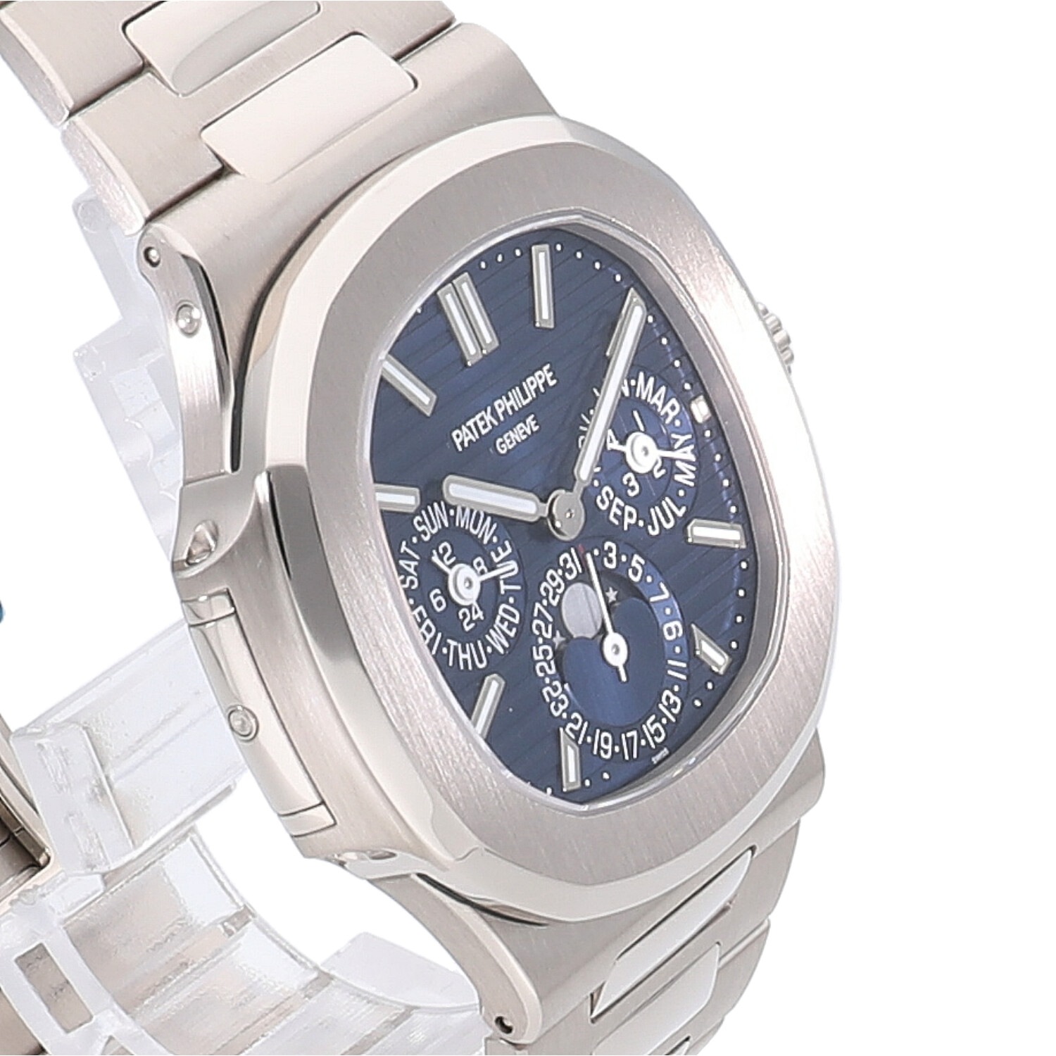 | モデルについて / Features | 1976年に初代モデルが誕生し、現在に至るまでパテックフィリップの中でも高い人気を誇り続けるノーチラス。2018年に新たにパーペチュアルカレンダー機能搭載のモデルがラインナップに加わりました。永久カレンダーという複雑機構を備えながらも3.88mという極薄のCal.240Qを搭載する事で、ケース厚8.42mmと非常に薄い仕上がりが特徴的です。ノーチラス特有の滑らかなブレスレットはそのままで装着感は抜群です。 |