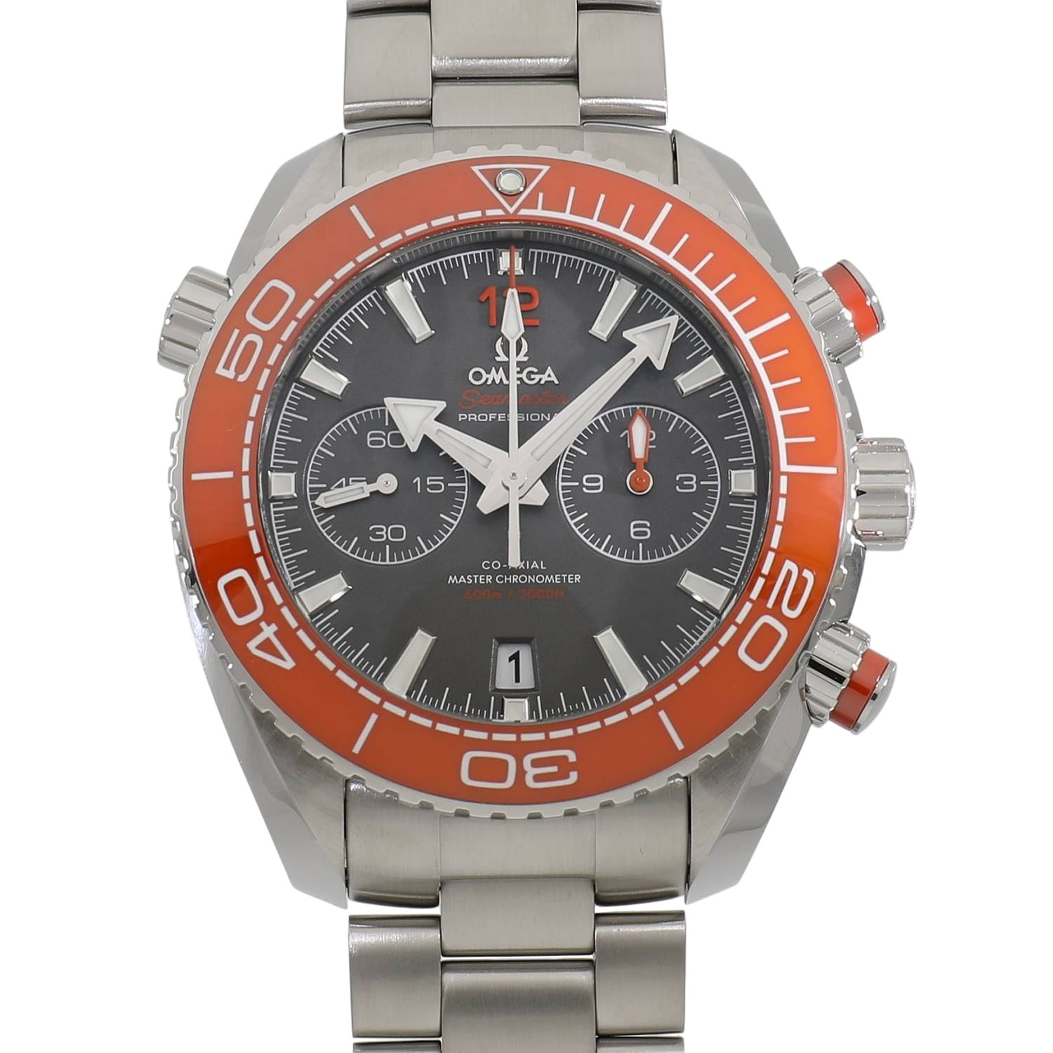 | モデルについて / Features | スピードマスターと並びプロフェッショナルモデルとして人気のシーマスター。そのDNAを受け継ぎ、2005年に誕生したプラネットオーシャン。10時位置にヘリウムエスケープバルブを備え、600mもの防水性を誇る本格派のダイバーズウォッチです。直径45.5mmに重量260gと手元での圧倒的な存在感を発揮し、12時間計を備えるクロノグラフ機能を搭載。グレーのダイヤルにオレンジのセラミックベゼルという、インパクトある組み合わせが印象的なモデルです。 |