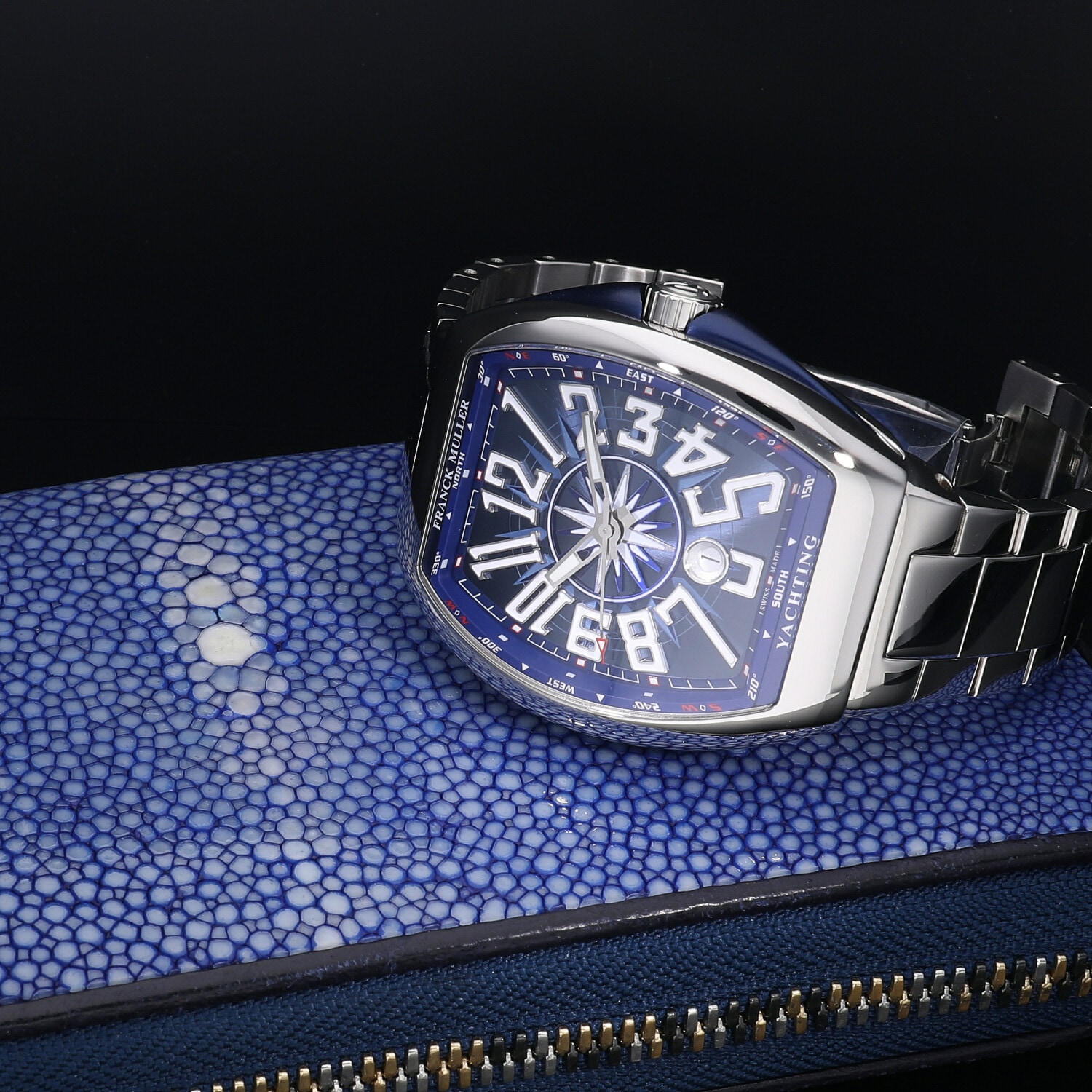 | モデルについて / Features | フランス語のアヴァンギャルドが語源となるヴァンガード。フランクミュラーらしい流麗な曲線が特長のトノーカーベックスを採用しながらも、迫力のあるフォルムが特徴の人気のコレクションです。メガヨットで世界をクルージングする世界観をモチーフにしたヨッティングは、風配図を文字盤に描くなど海を連想させるデザインが特徴的で、ヴァンガードの中でも高い人気をモデルとなります。 |