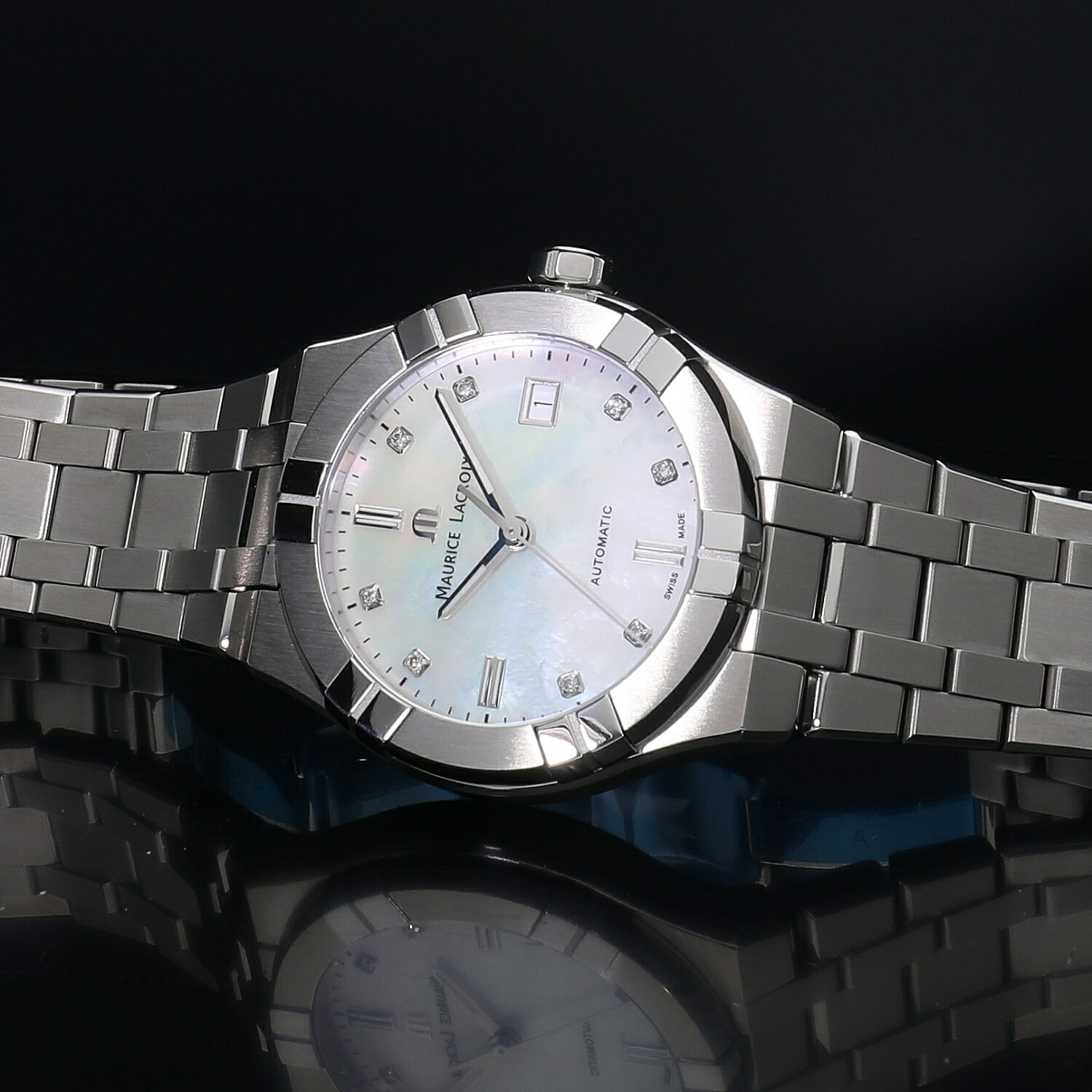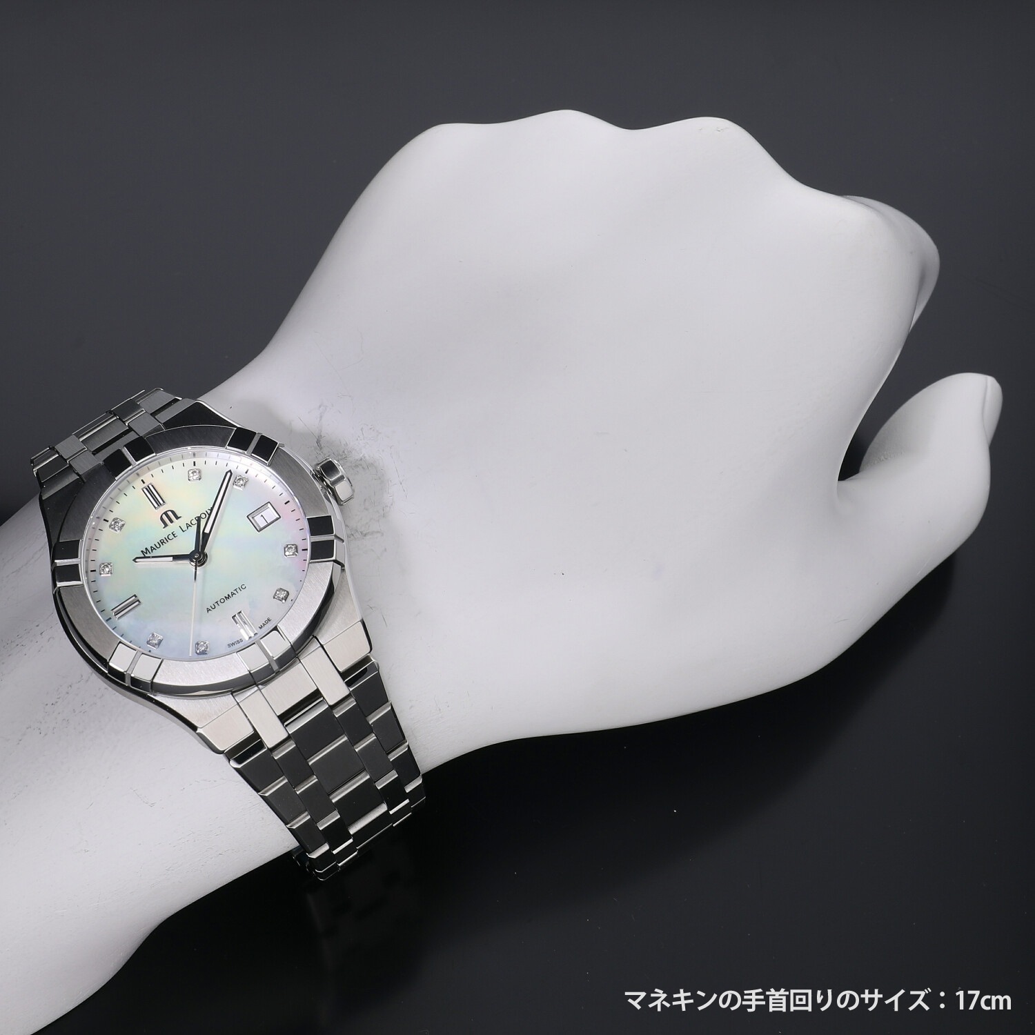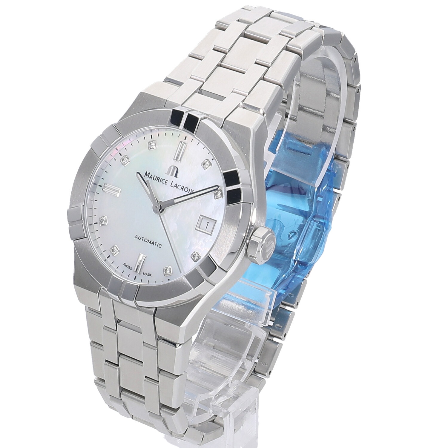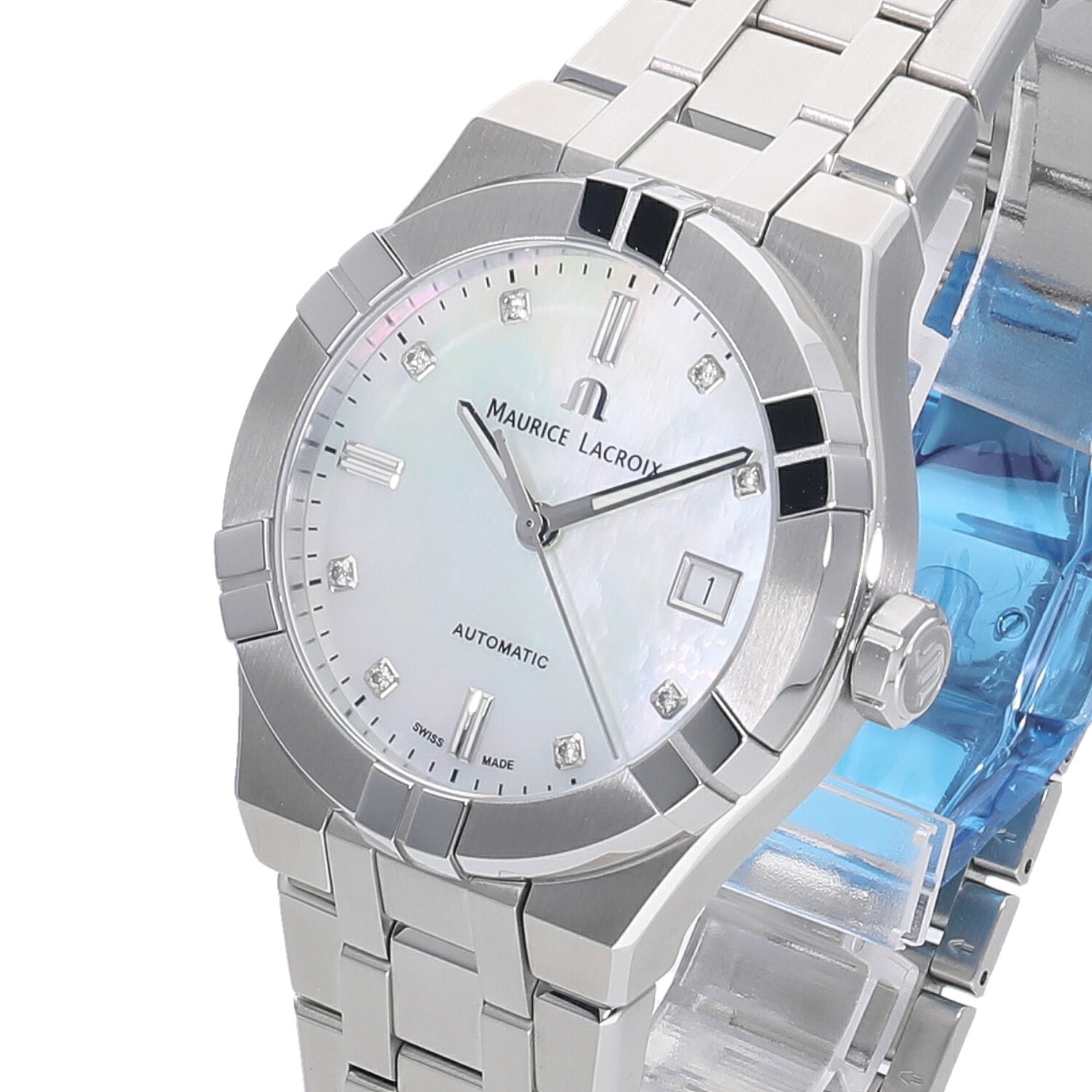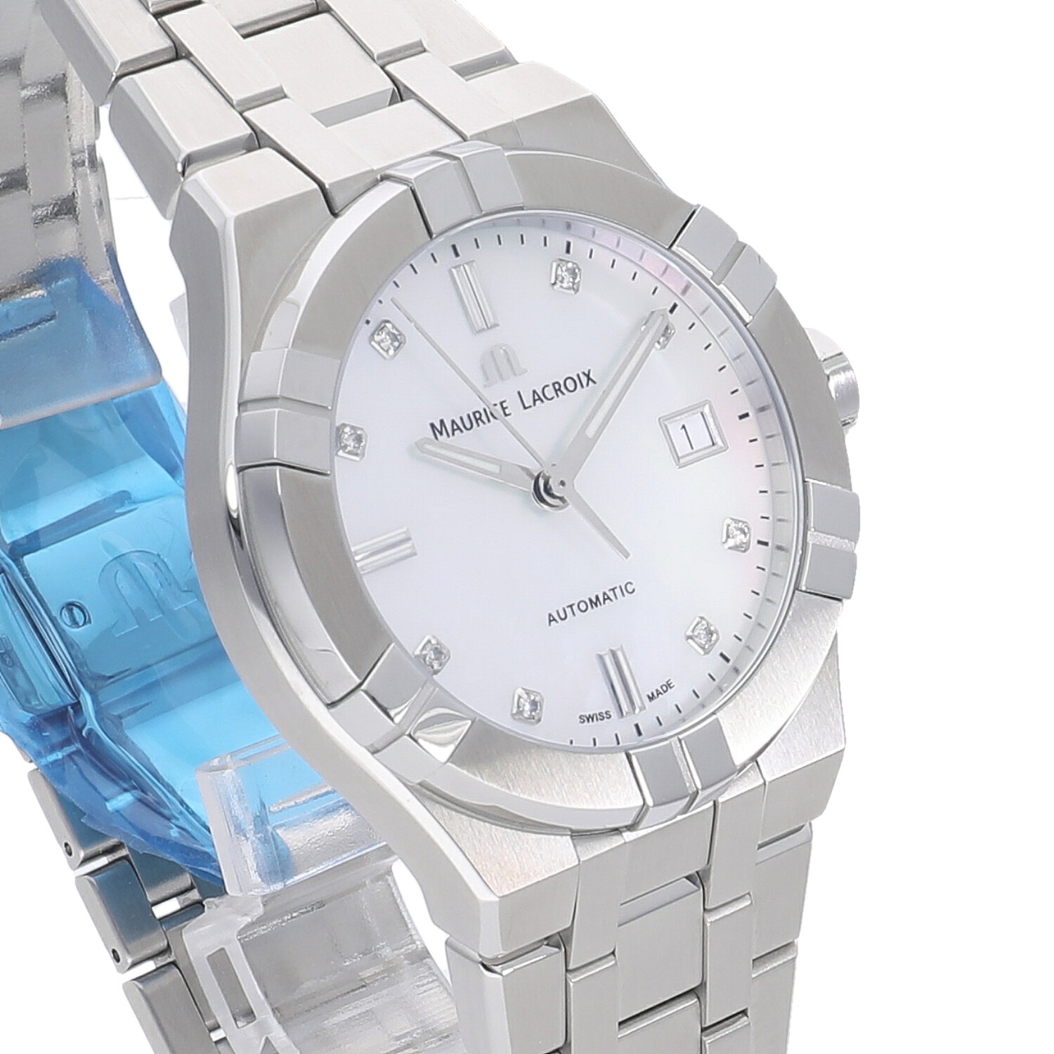 | モデルについて / Features | 2020年の新作 1975年にスイスで創業したモーリスラクロア。独創的でユニークな発想による印象的なデザインのモデルが多く、人とは違うタイムピースを好む時計ファンからの支持を集めるブランド。アイコンは2018年に発表され、そのデザイン性の高さと手の届きやすい価格設定で、瞬く間に注目を集めるモデルとなりました。39mmのケースは女性には少々大きめですが、ホワイトシェルに8ポイントのダイヤモンドをセットした文字盤により、ユニセックスモデルとしてもご使用いただけます。 |