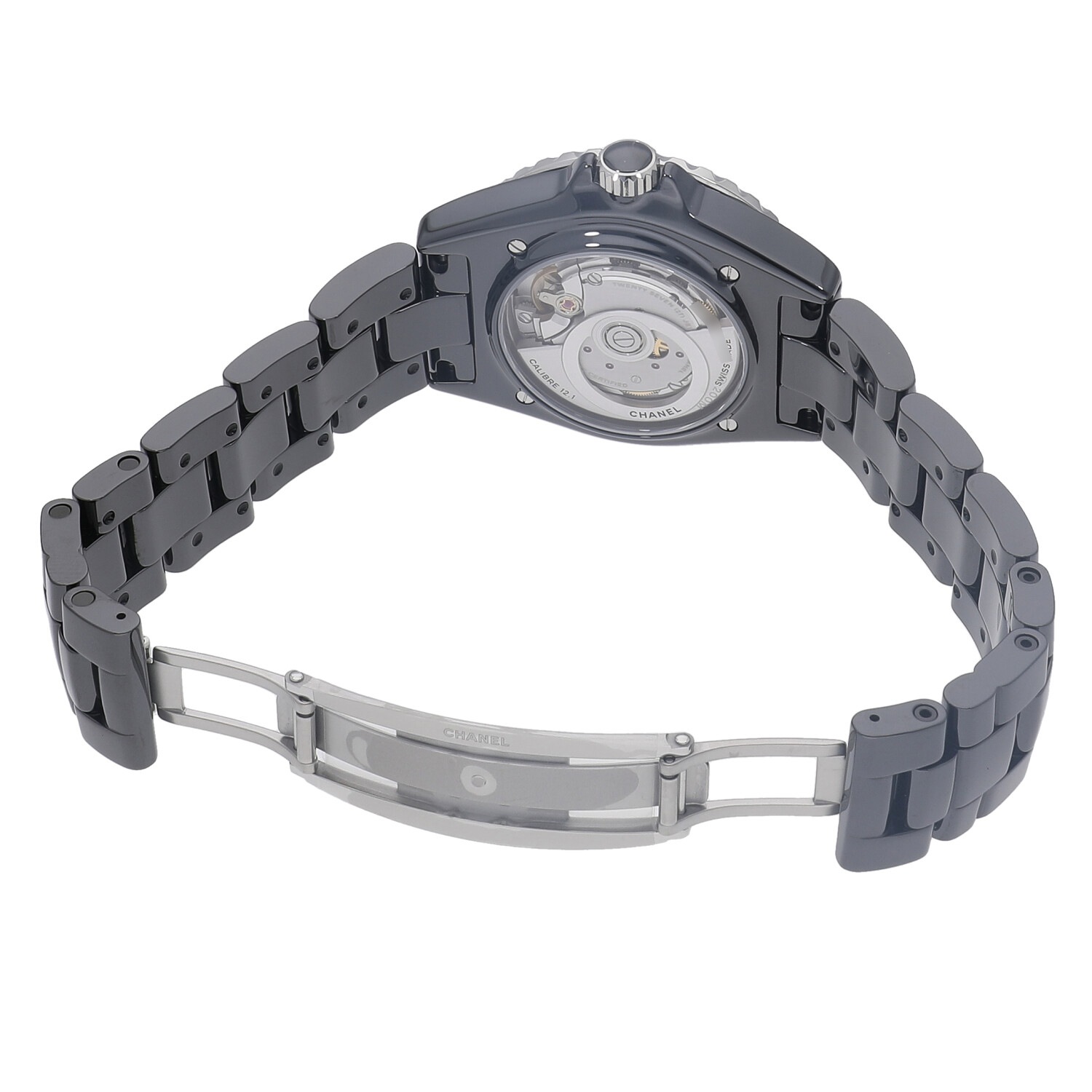 | モデルについて / Features | 2019年の新作 シャネルの代表的コレクション「J12」。多くの機械式時計にセラミック素材という選択肢を与えたきっかけのようなモデルです。こちらのモデルは一部を除いてブラックセラミックで統一されており、艶やかな黒を手首に纏うことができます。ケースバックはシースルー仕様で、およそ70時間のパワーリザーブを持つ自社製キャリバー12.1を眺められるようになっています。世界で1200本限定で販売されたモデルです。 |