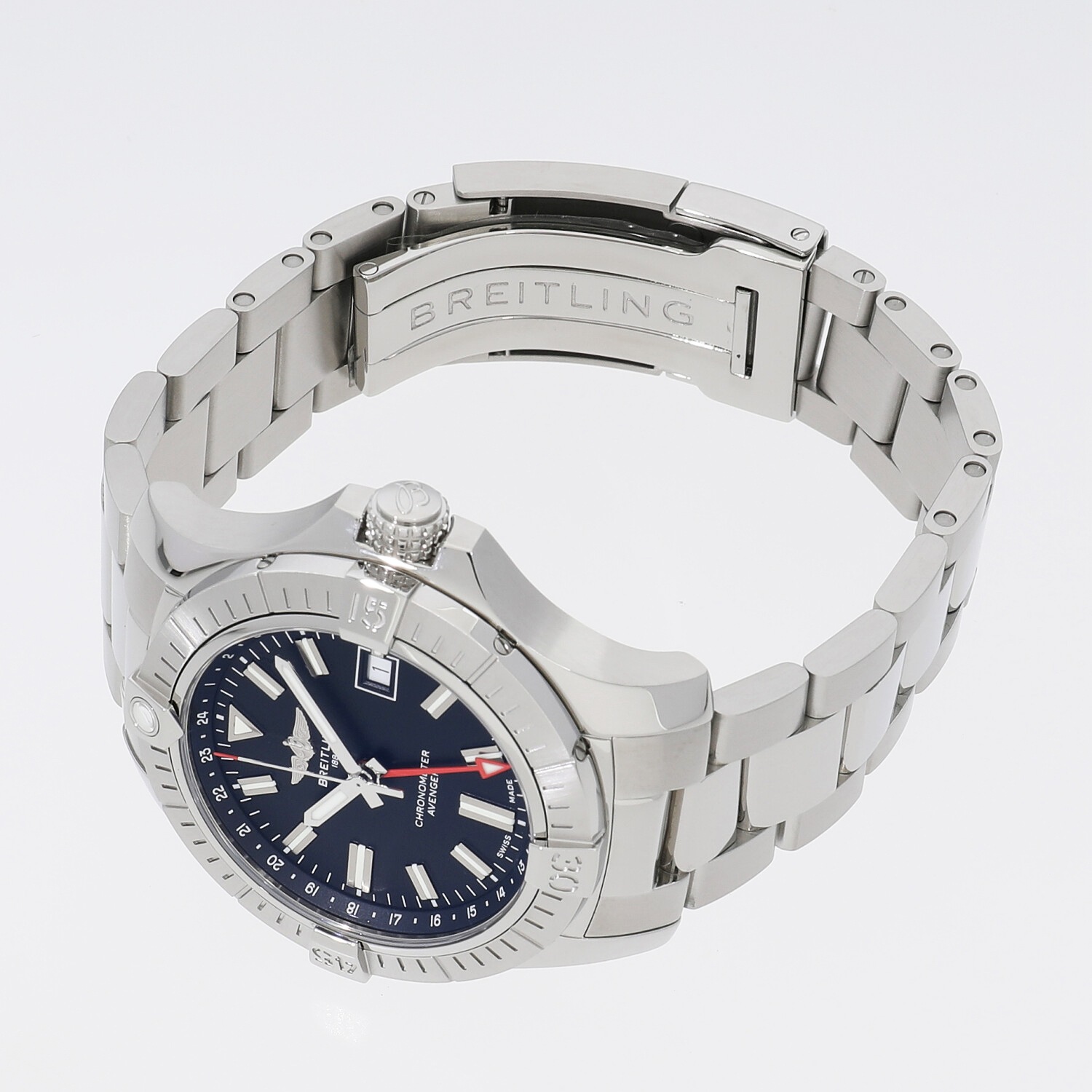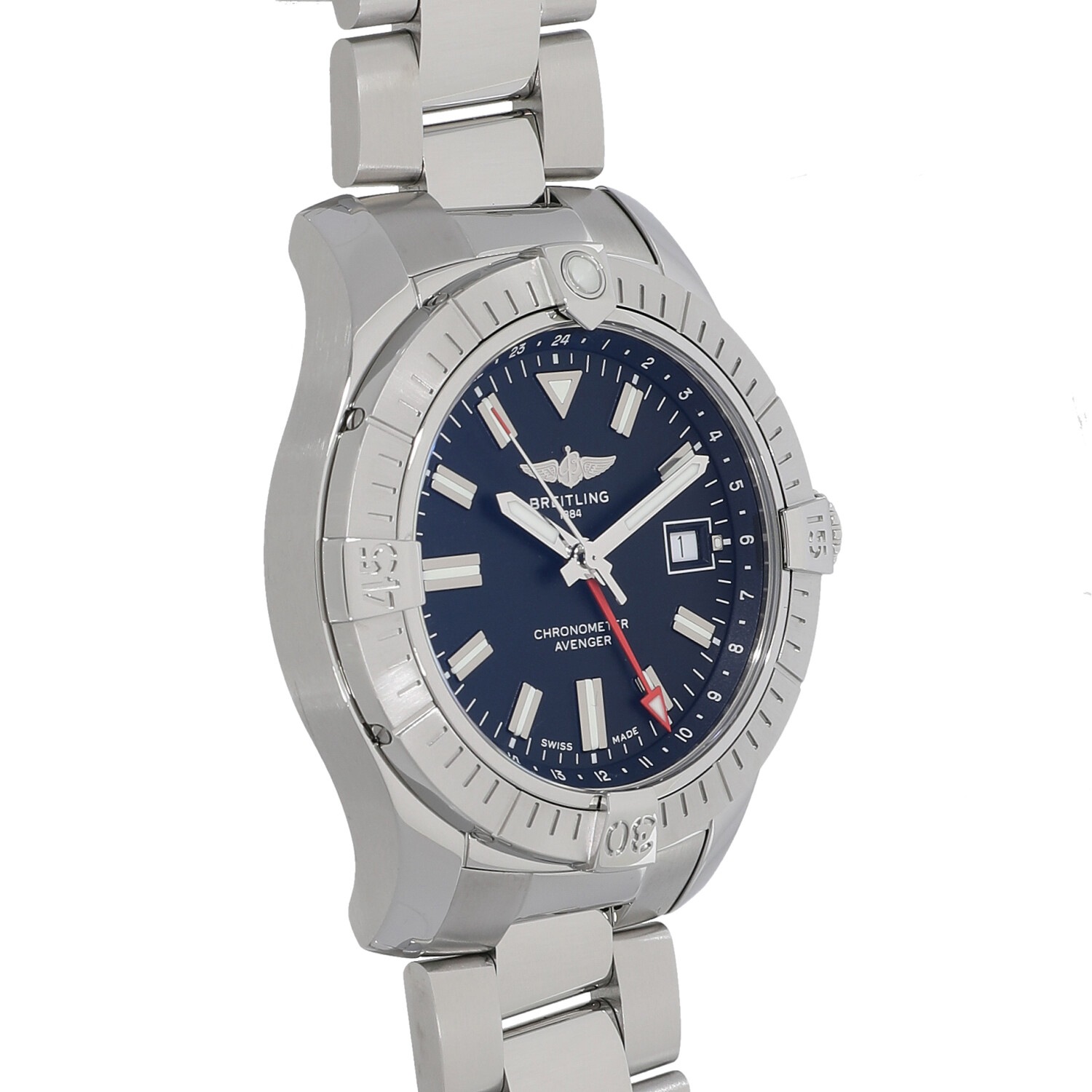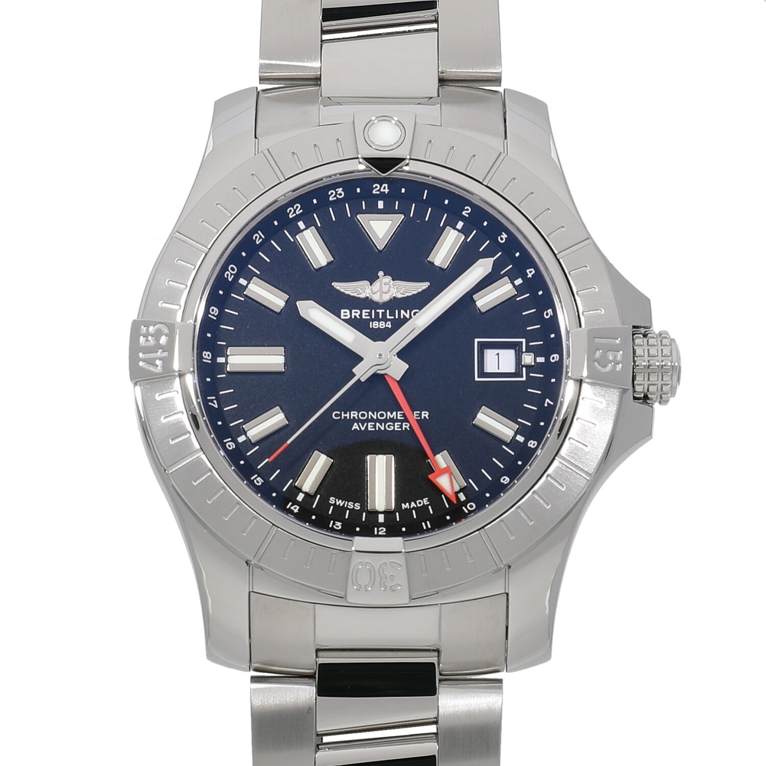 | モデルについて / Features | 2020年の新作 強度、機能性、精度、デザインを備えたハイスペックモデルをラインナップするアベンジャーシリーズ。300Mの防水性能と、GMT機能を備えた実用性の高いハイスペック仕様です。潜水時に着用するグローブをしたままでもしっかりと操作が出来るようスリップ防止の凹凸のあるリューズを採用するなど、ブライトリングの拘りが見て取れます。 |