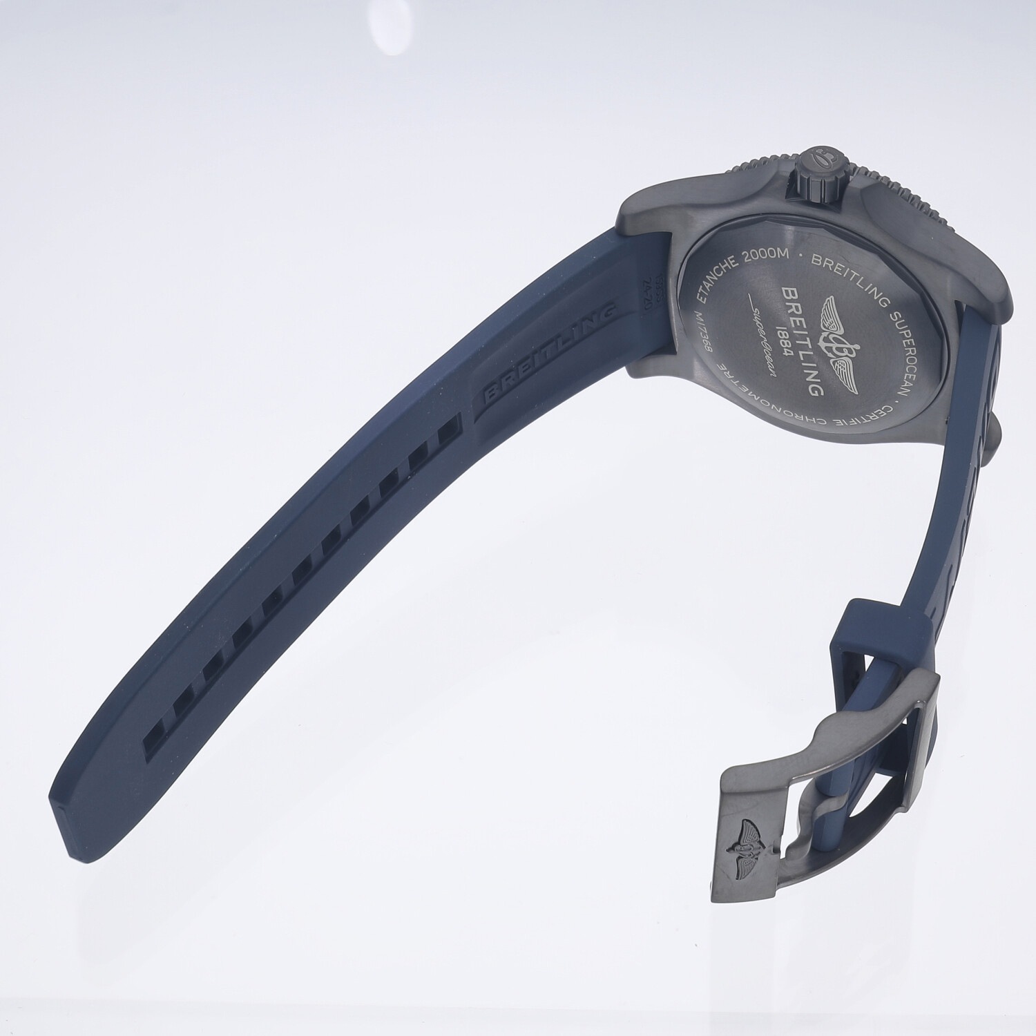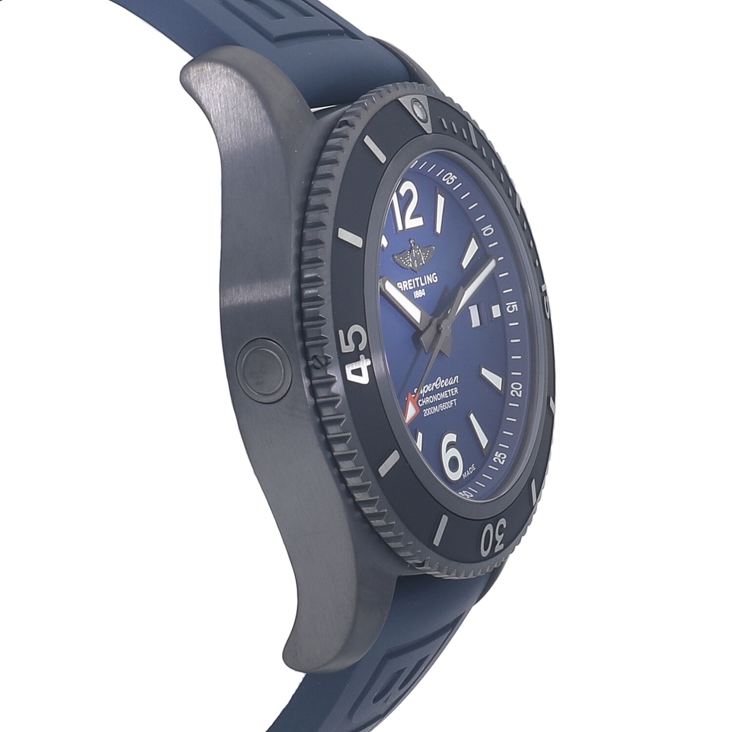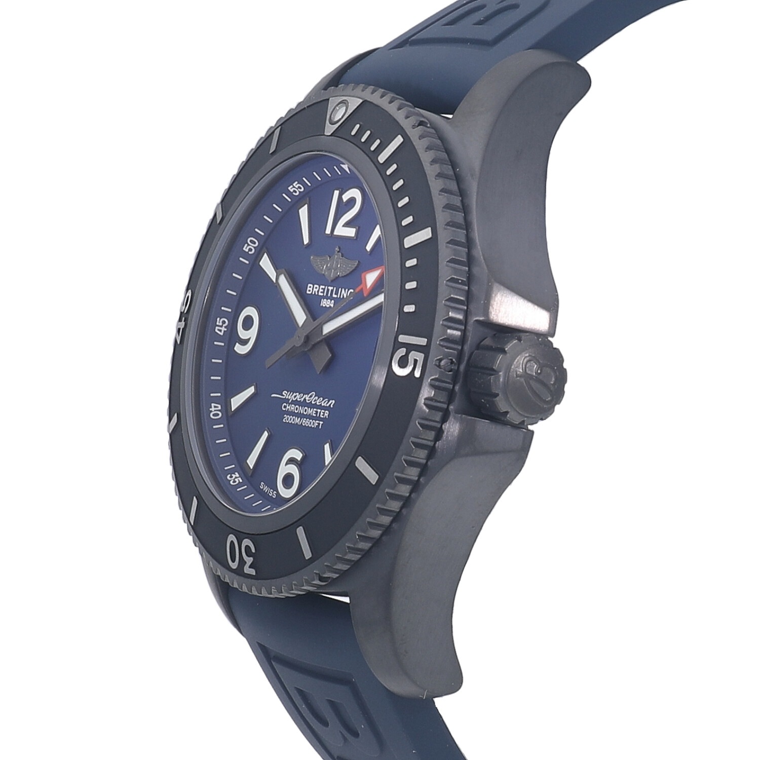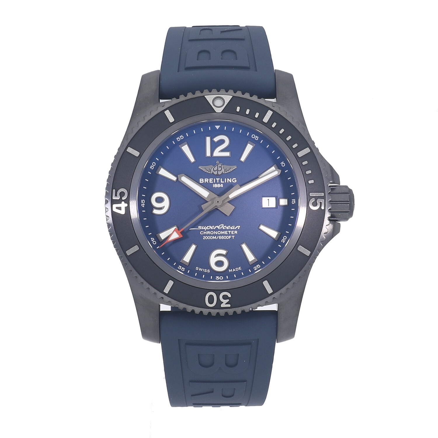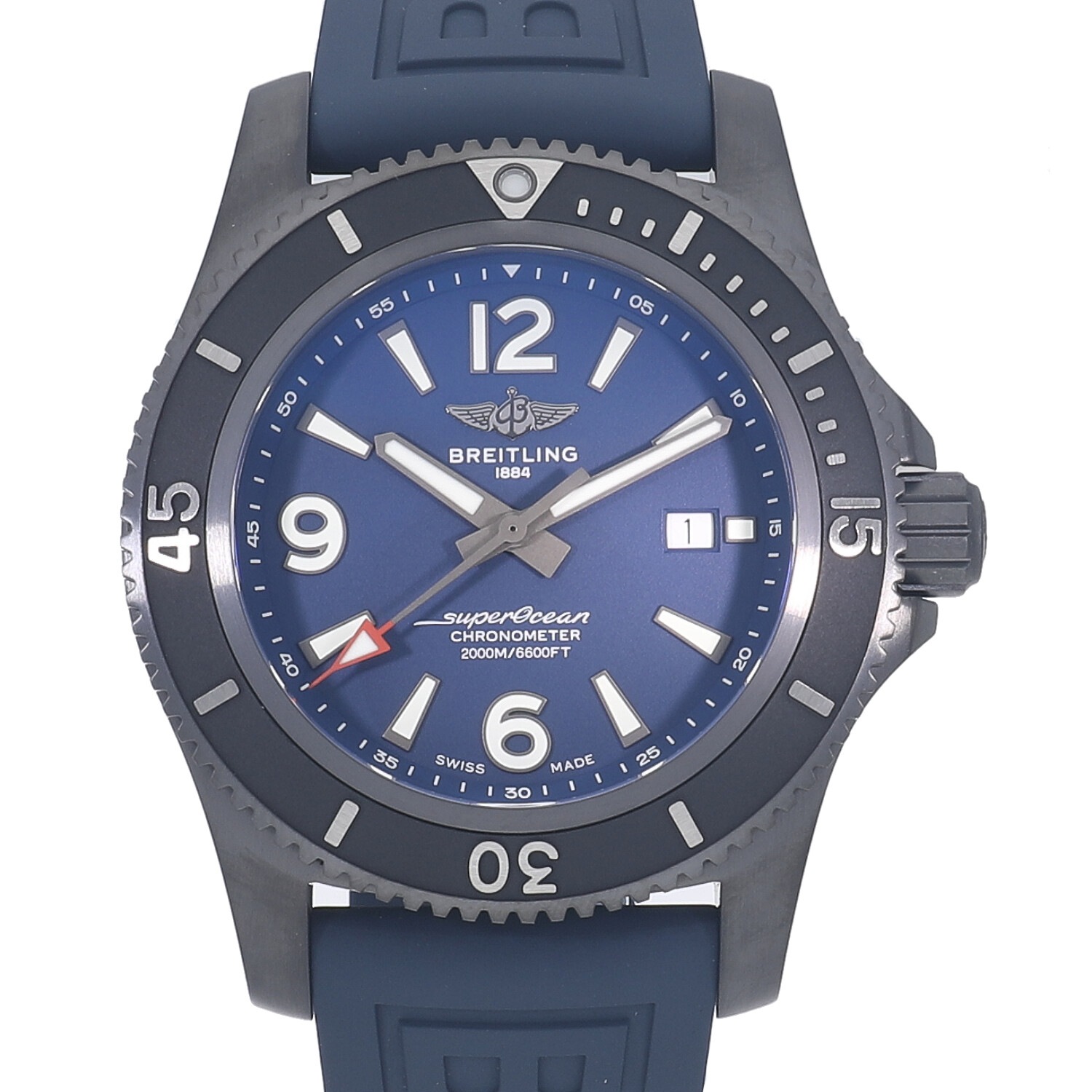 | モデルについて / Features | ブライトリングのダイバーズウォッチを代表するスーパーオーシャン。46mmと大ぶりなブラックDLCコーティングのステンレスケースを採用、インデックスにはルミノバ夜光が塗布され視認性に優れています。ヘリウムエスケープバルブをケースサイドに装備し、飽和潜水にもご使用いただける2000m防水を誇る本格ダイバーズウォッチです。 |