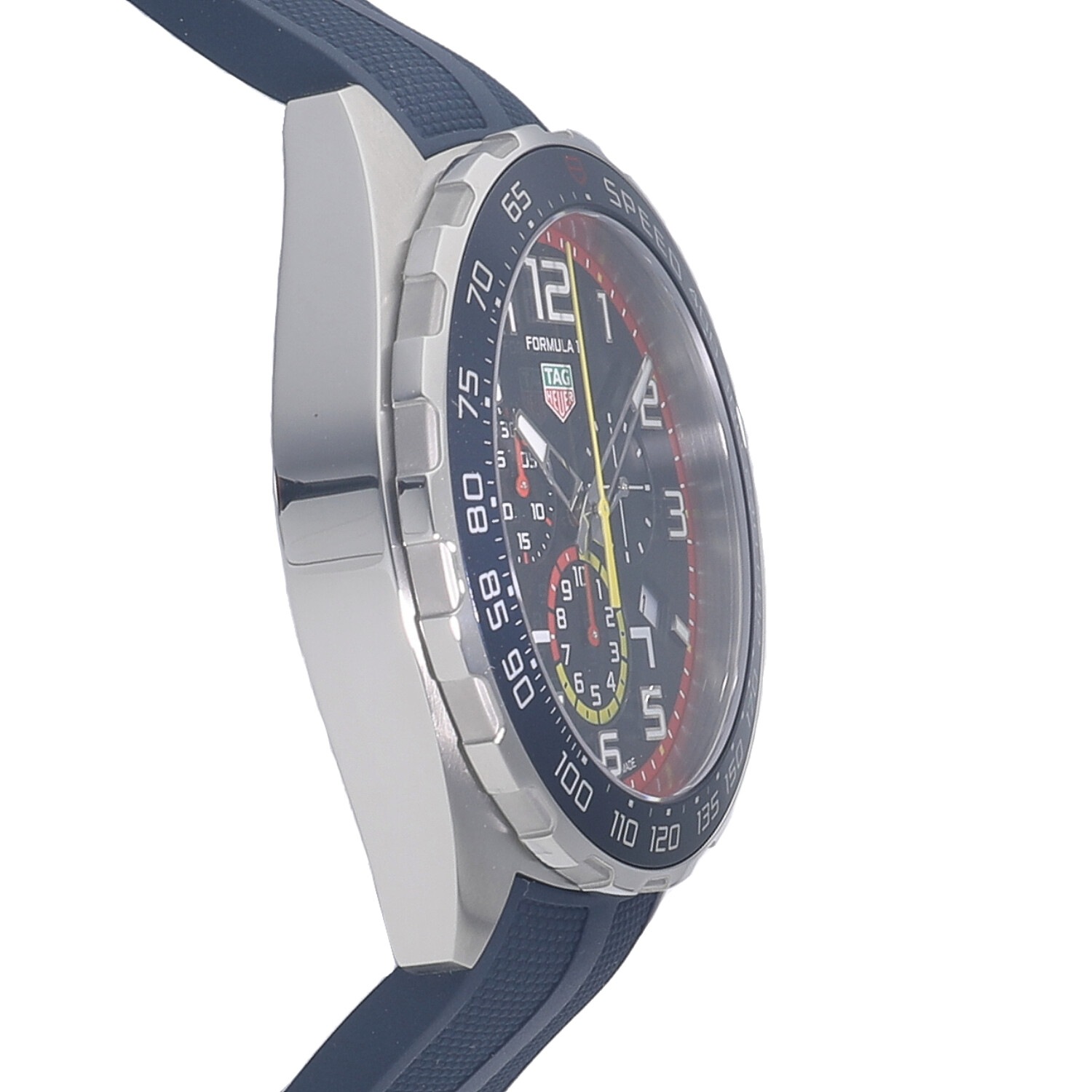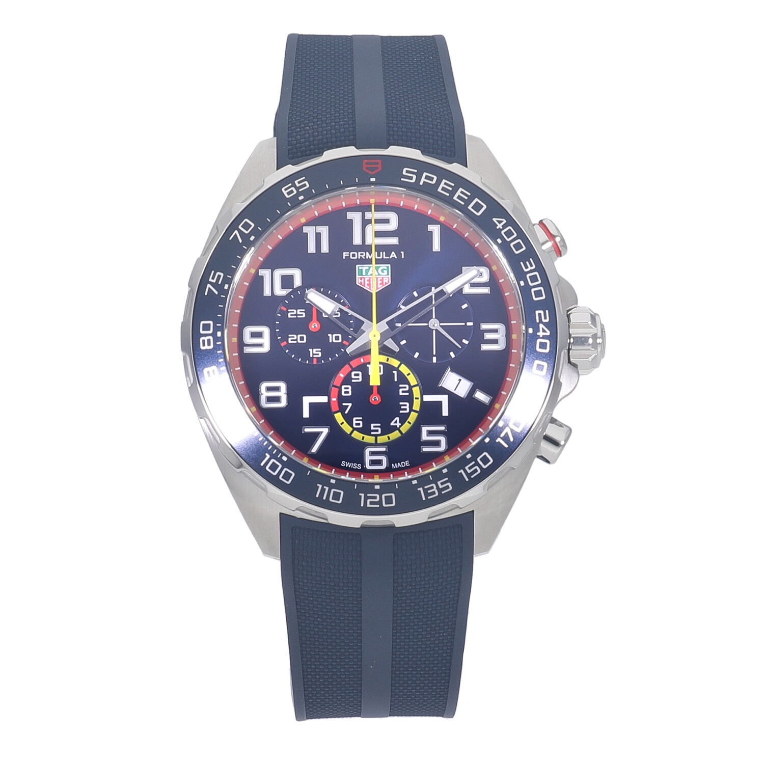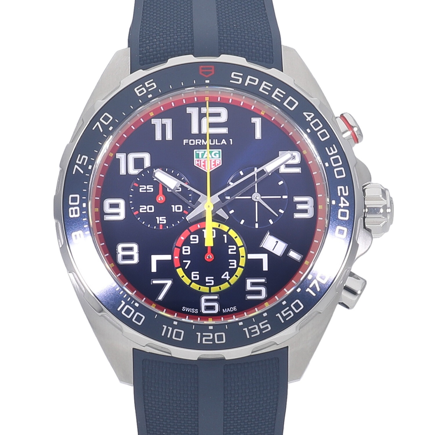 | モデルについて / Features | 2022年の新作 モータースポーツとの繋がりの深いタグホイヤー。カーレースの最高峰であるフォーミュラー1の名を冠するコレクション。F1のレッドブルレーシングの公式タイムキーパーなどのパートナーシップを行っており、同チームの名を冠した特別なモデルとなります。スペシャルエディションらしく、鮮やかなブルーサンレイ加工のサテン仕上げダイヤルに、レッドとイエローのハイライト、ロジウムプレートの針とインデックスが配されスタイリッシュな印象となっています。ケースバックには、タグホイヤーとレッドブル レーシングのパートナーシップを祝した、特別な刻印が施されています。 |