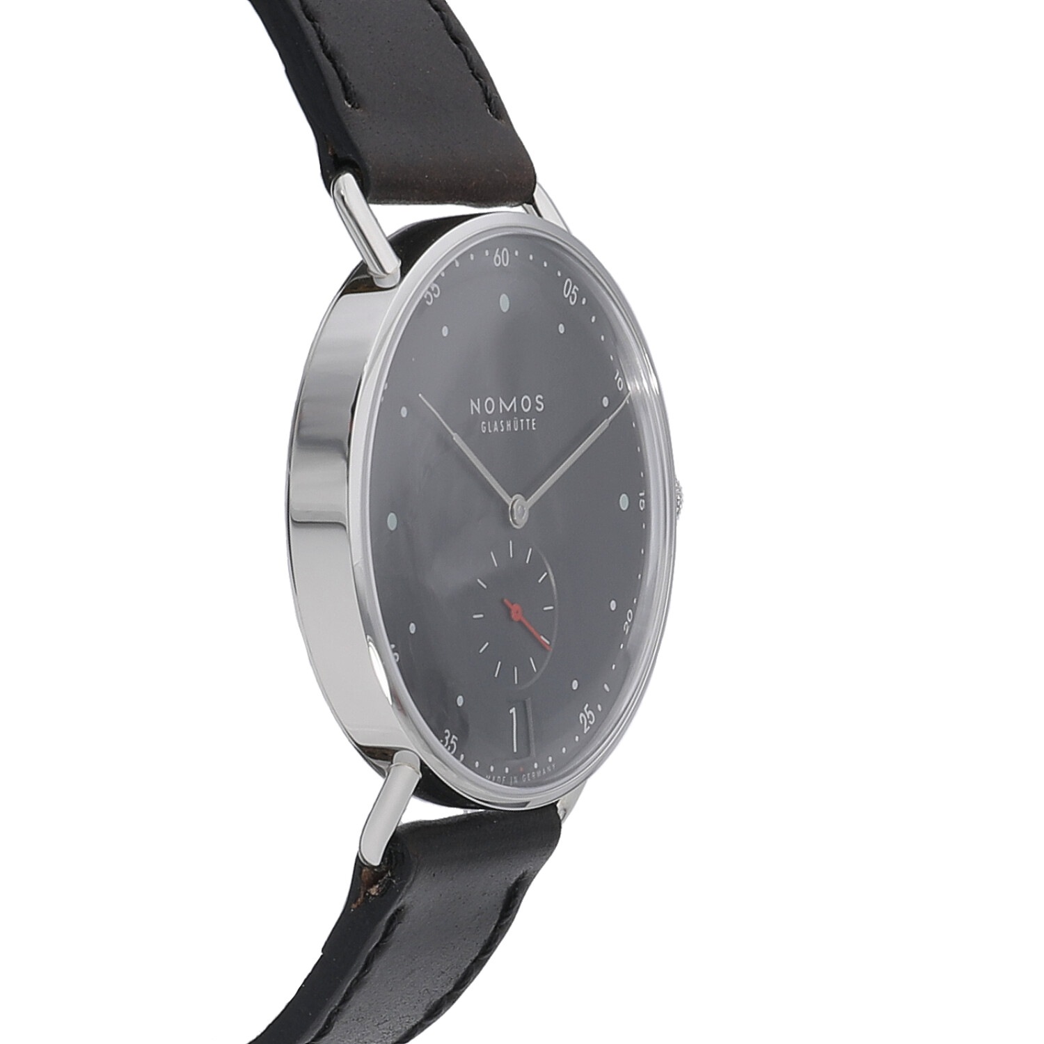 | モデルについて / Features | ドイツの時計製造の街として有名なグラスヒュッテに1990年に創業したノモス。ドイツ発祥のバウハウスの流れを組むデザインが特徴的で、極めてシンプルでありながら美しいモデルが多数展開されるブランドです。そのデザイン性の高さから誕生以来数々のデザイン賞を受賞してきました。マーク・ブラウン氏がデザインしたメトロは、赤いスモールセコンド秒針など、随所に彩り豊かなカラーを採用しており、ポップな印象を醸し出しています。 |