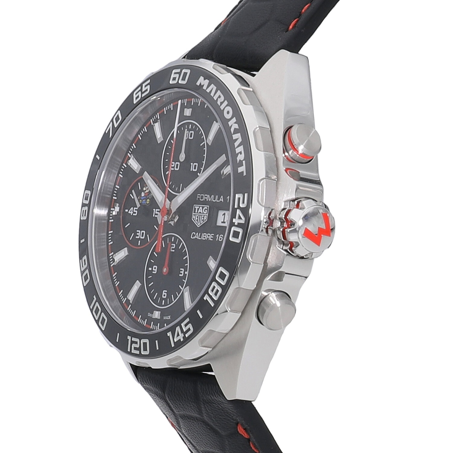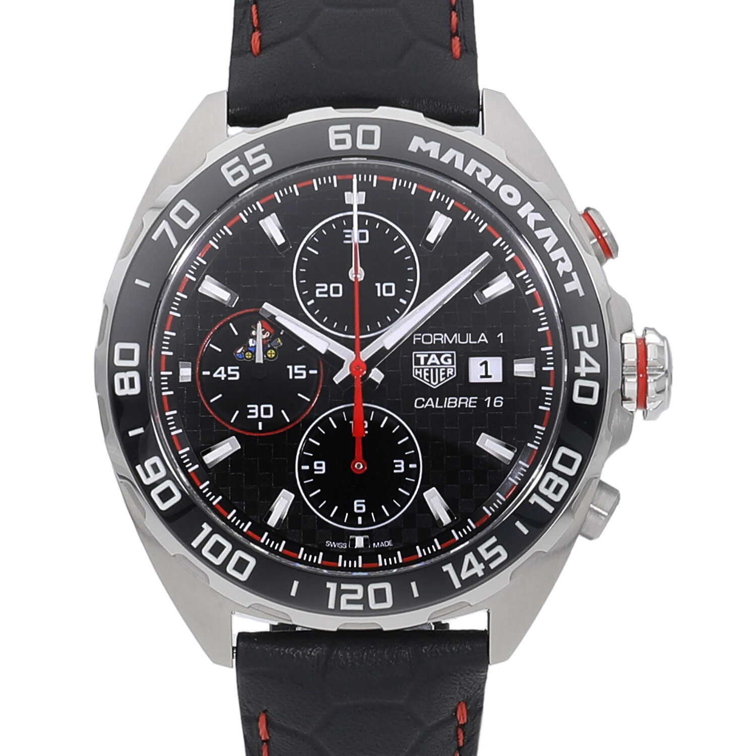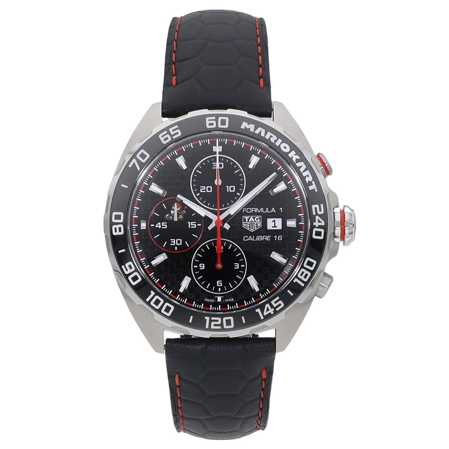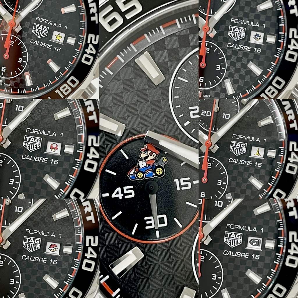 | 商品詳細 | 2022年の新作 カーレースの最高峰であるフォーミュラー1の名を冠する人気モデルと、世界的に人気の高いテレビゲームであるマリオカートのコラボレーションモデルです。文字盤にはカーボン柄のブラック、ミニッツトラックにはチェッカーフラッグを想起させるカラーリングなど、随所にレーシーな雰囲気を漂わせます。9時位置のインダイヤルと裏蓋にはカートに乗るマリオ、リューズの先端とバックルにはマリオカートのMのロゴが刻印されます。5と5の倍数の日付表示にはスーパーマリオなどでもおなじみのキャラクターが表示されます。 |