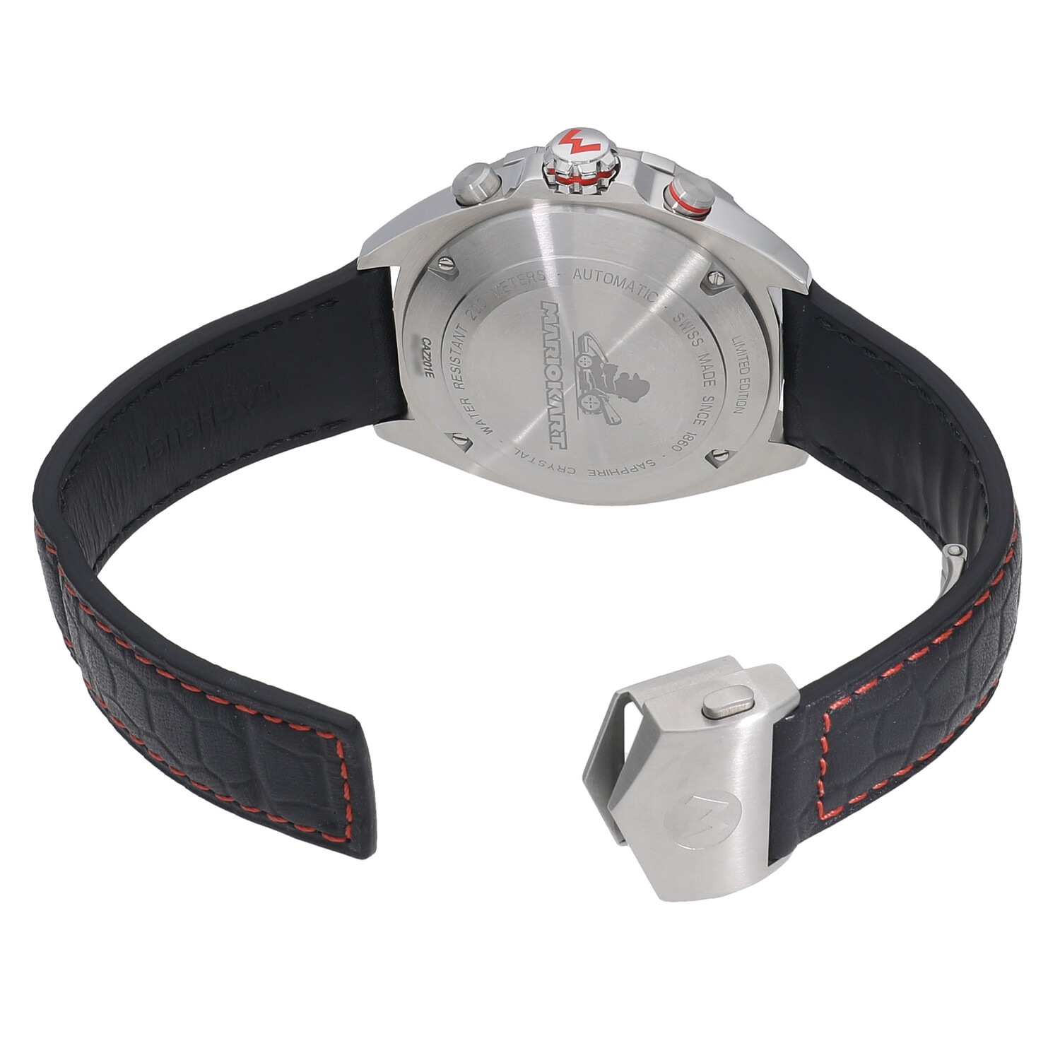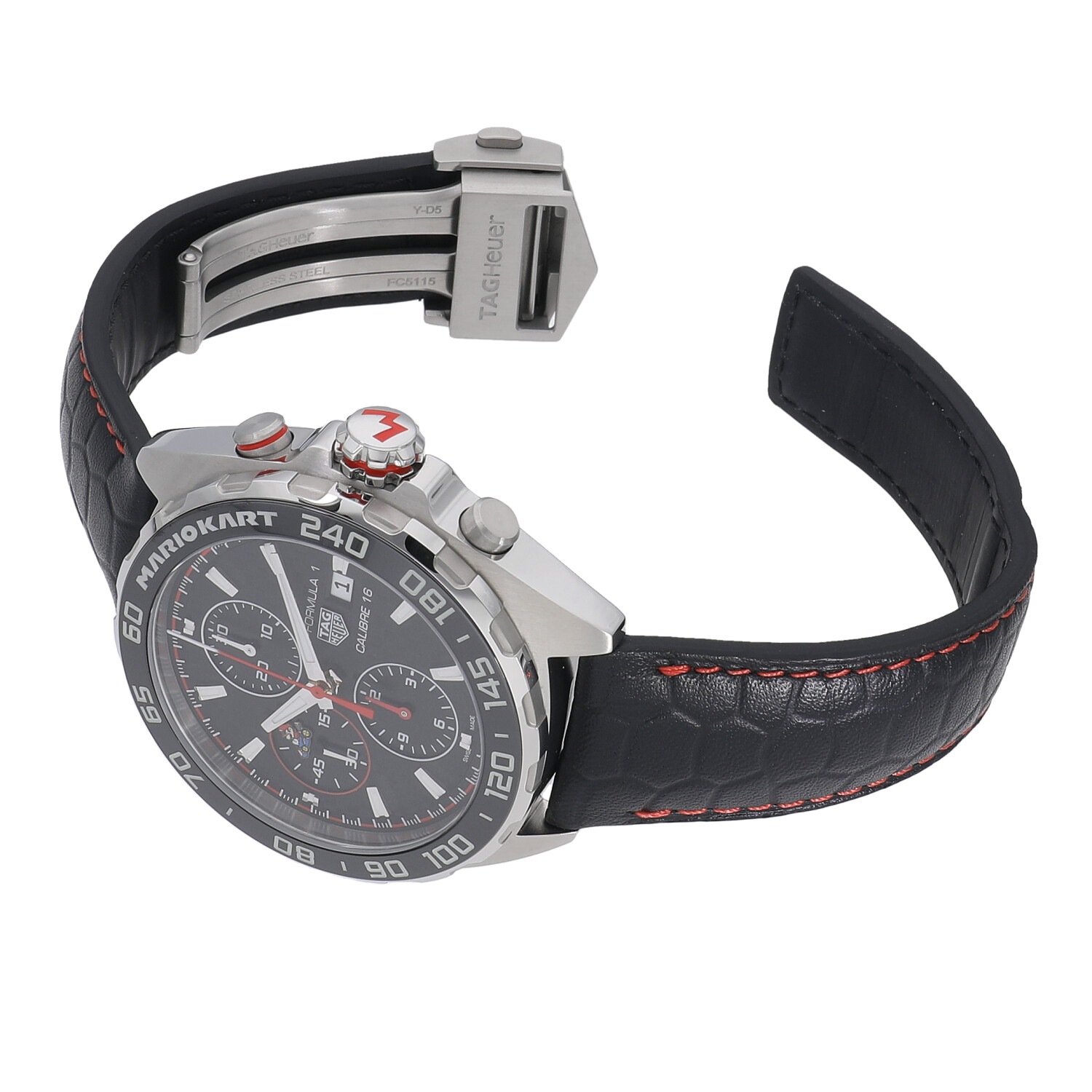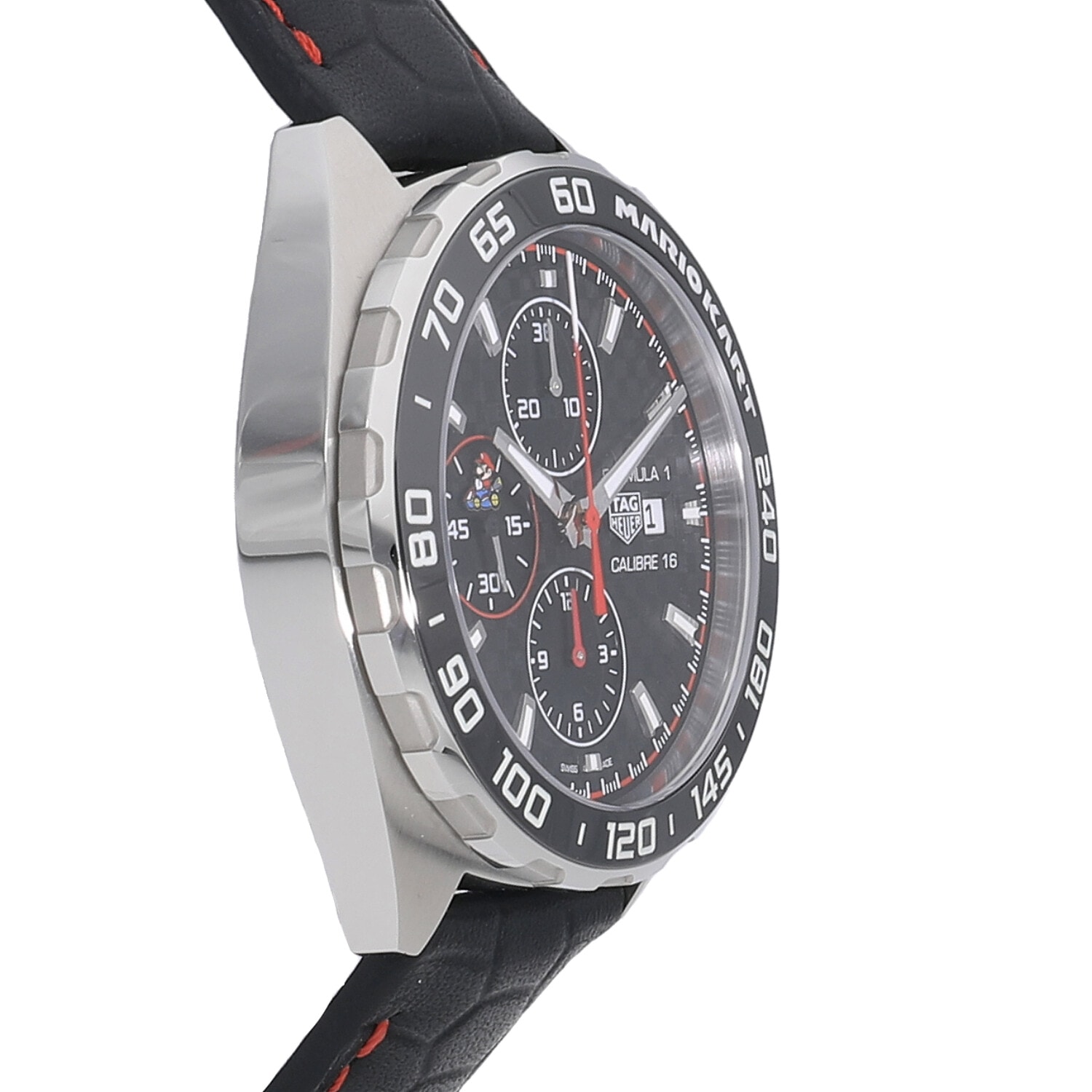 | 商品詳細 | 2022年の新作 カーレースの最高峰であるフォーミュラー1の名を冠する人気モデルと、世界的に人気の高いテレビゲームであるマリオカートのコラボレーションモデルです。文字盤にはカーボン柄のブラック、ミニッツトラックにはチェッカーフラッグを想起させるカラーリングなど、随所にレーシーな雰囲気を漂わせます。9時位置のインダイヤルと裏蓋にはカートに乗るマリオ、リューズの先端とバックルにはマリオカートのMのロゴが刻印されます。5と5の倍数の日付表示にはスーパーマリオなどでもおなじみのキャラクターが表示されます。 |