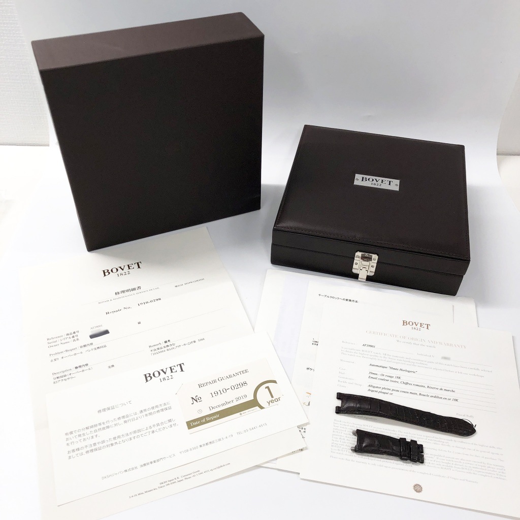 | 付属品 | 純正ボックス/ 国際保証書(あり:日付未記入 )/ 修理明細書(2023年1月 裏蓋パーツ交換・調整) 修理明細書(2019/12:オーバーホール)、修理保証書、説明書、替えベルト |