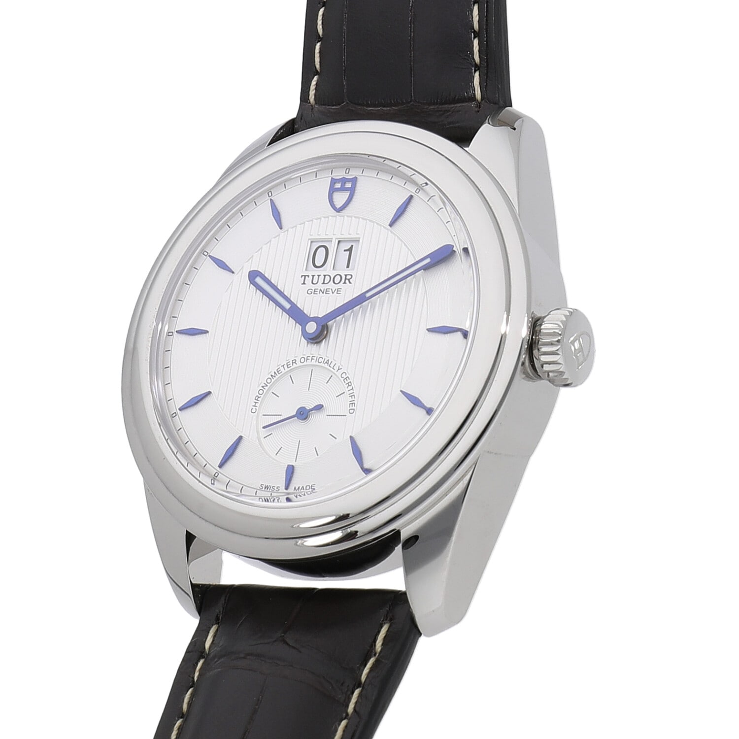 | モデルについて / Features | レトロクラシックなデザインのグラマーは、チューダーの中でもエレガントなラインとして展開されますが、モダンな42ミリというケース径ですのでカジュアルな装いにもご使用いただけます。12時位置には2つの窓で日付を表示するダブルデイト、6時位置にはスモールセコンドを備えます。スモールセコンドはチューダー家の紋章でもあるバラをモチーフにデザインされています。 |