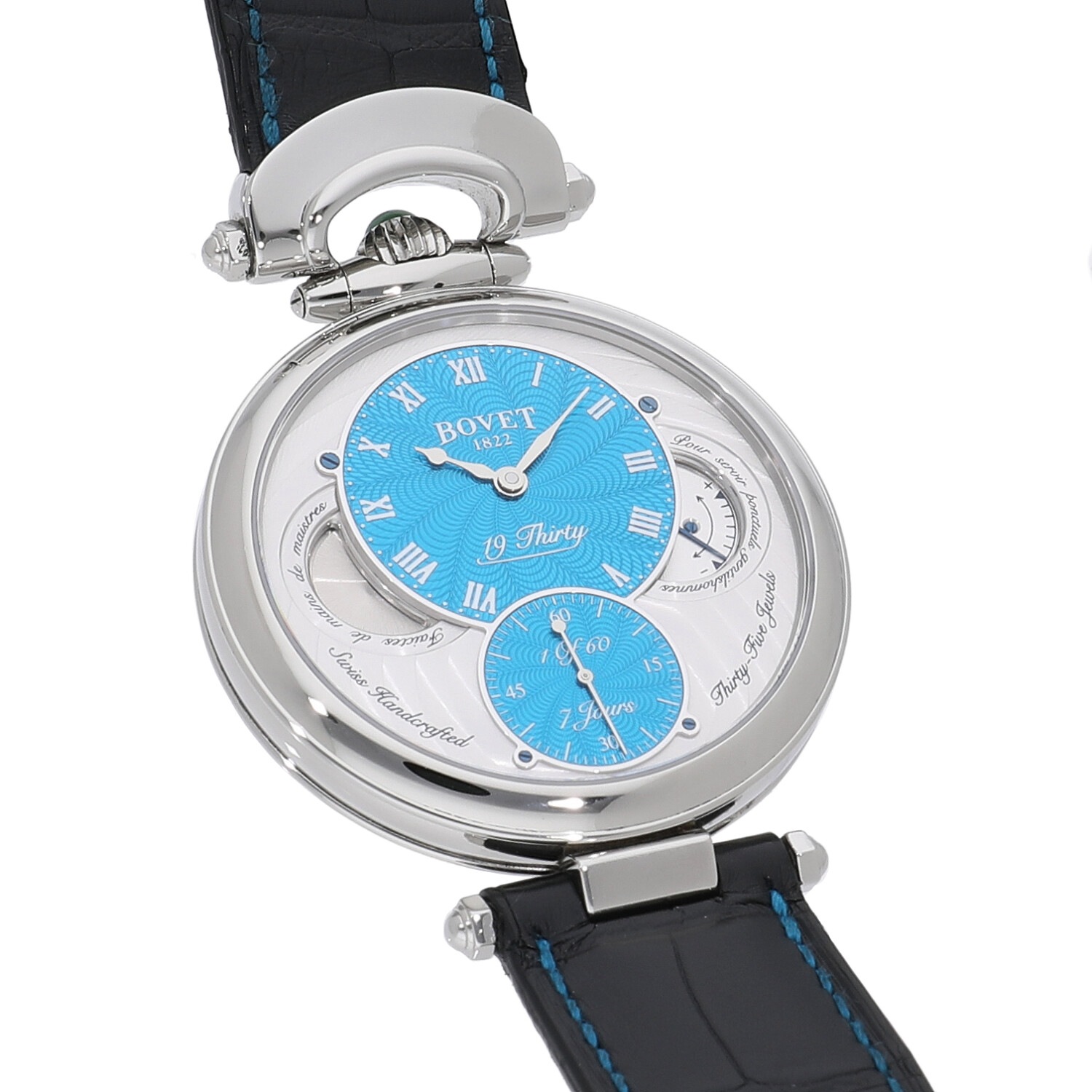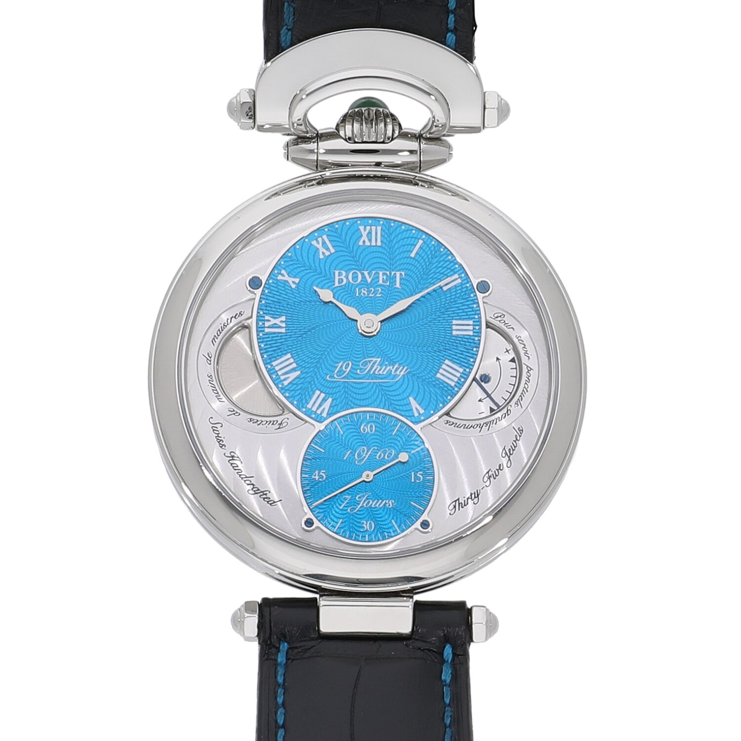 | 商品詳細 | 1930年代当時のポケットウォッチにインスパイアされ、作られたコレクション"19 Thirty(ナインティーンサーティ)"。鮮やかなターコイズブルーと繊細に施された美しいギョーシェ彫りの組み合わせが優美な雰囲気を感じさせます。またシースルーバックの裏蓋からは7日間のロングリザーブを誇る手巻き自社製キャリバー"15BM04"を堪能することができ、美しさ、実用性の両面からお楽しみ頂ける逸品に仕上げっております。 |