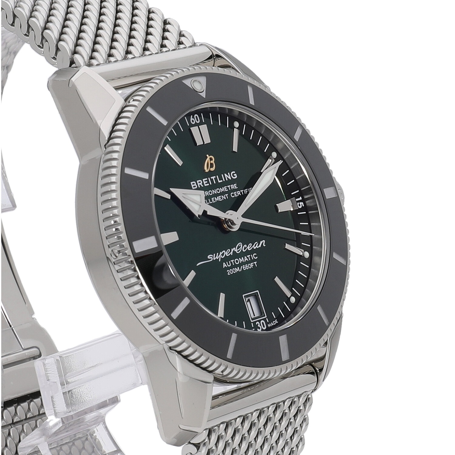 | モデルについて / Features | 2021年の新作 スーパーオーシャン ヘリテージは、その名の通り1950年代の初代スーパーオーシャンにインスパイアされ、初代のデザインを継承しながらも細かな部分のブラッシュアップを図ったニューモデルです。視認性が高くアイコニックな三角針や逆回転防止ベゼルなどを備えたダイバーズウォッチであり、ムーブメントはCOSC公認のクロノメーターであるB20が搭載されています。近年人気の高いグリーン文字盤がスマートな印象を感じさせます。 |