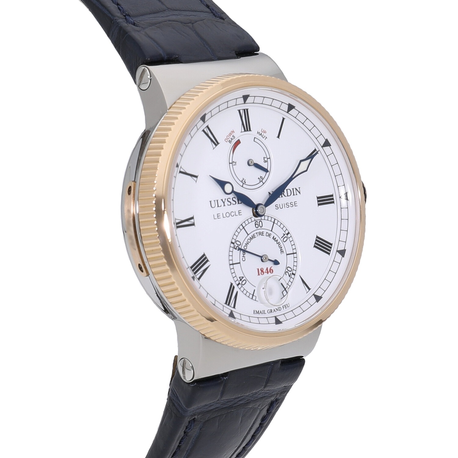 | 商品詳細 | 1846年にスイスのル・ロックルで創業された古い歴史を持つユリスナルダン。ブランドのトレードマークに錨(イカリ)を採用するほど、海洋との深いつながりを持つユリスナルダン。航海に必要なマリーンクロノメーターにインスピレーションを受けてデザインされた本モデルは1996年に誕生し、ユリスナルダンのアイコン的コレクションと言えます。6時位置の大きめのスモールセコンドにデイト表示、12時位置のパワーリザーブインジケーターなど、現在のマリーンシリーズにも継承されるデザインです。 |