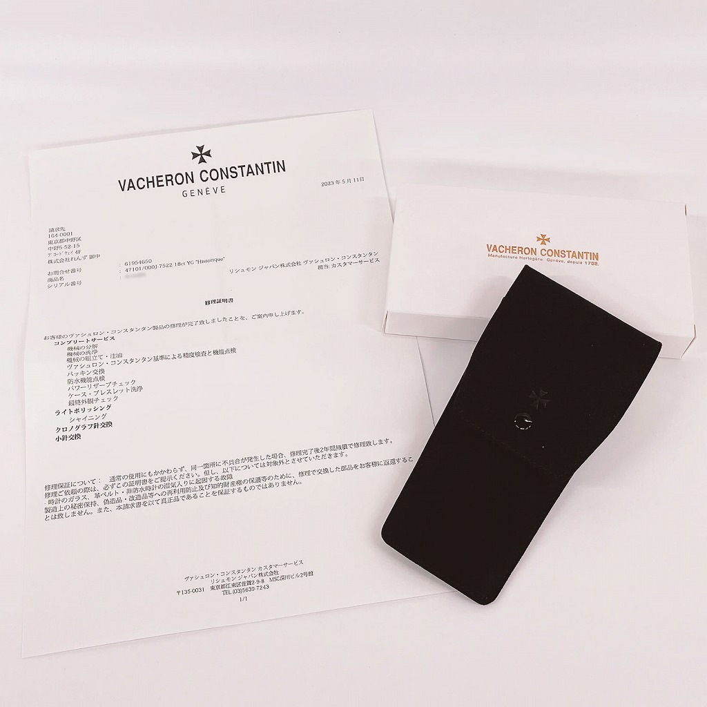 | 付属品 | メーカーサービスボックス/修理明細書(2023年5月 コンプリートサービス、ライトポリッシュ、クロノグラフ針交換、小針交換) |