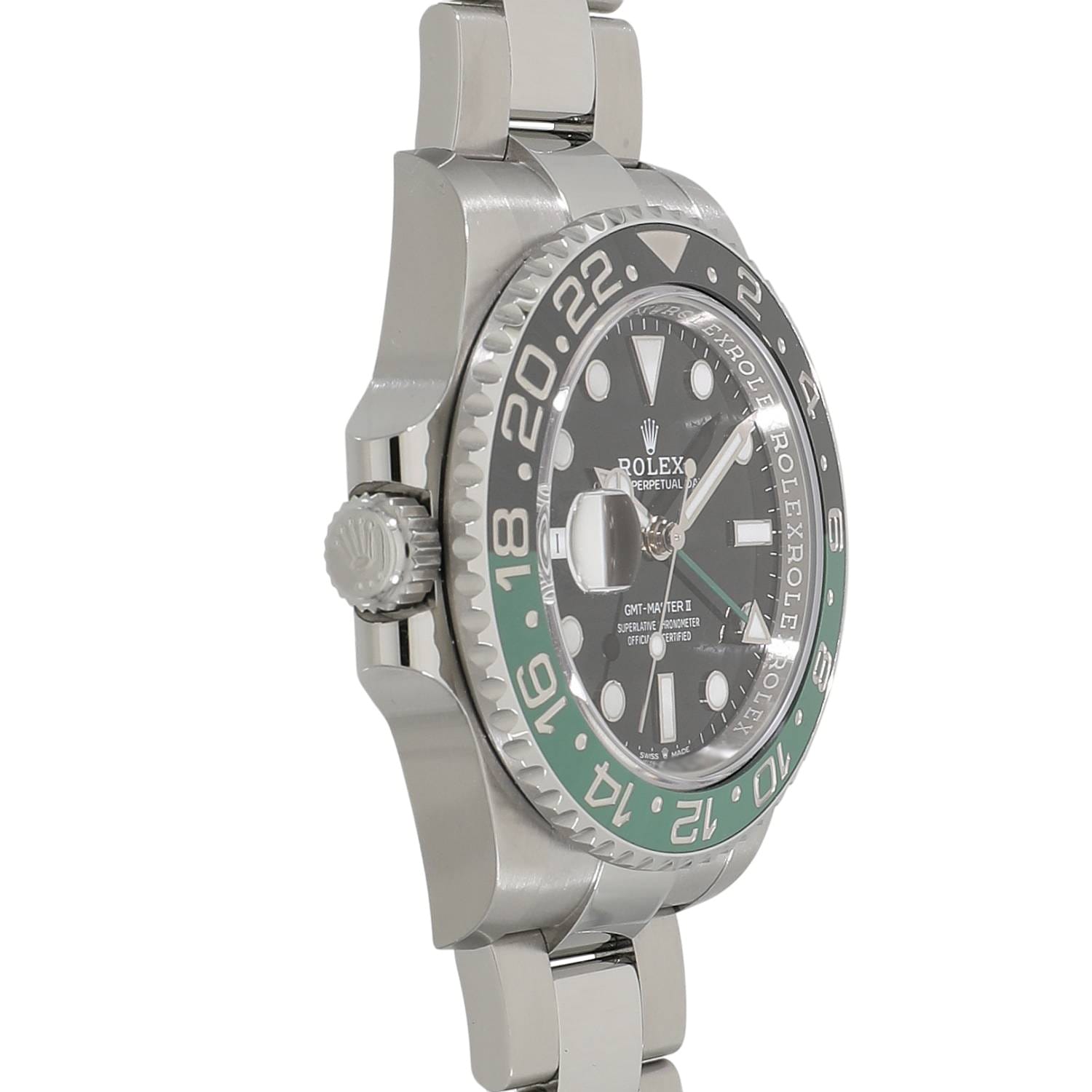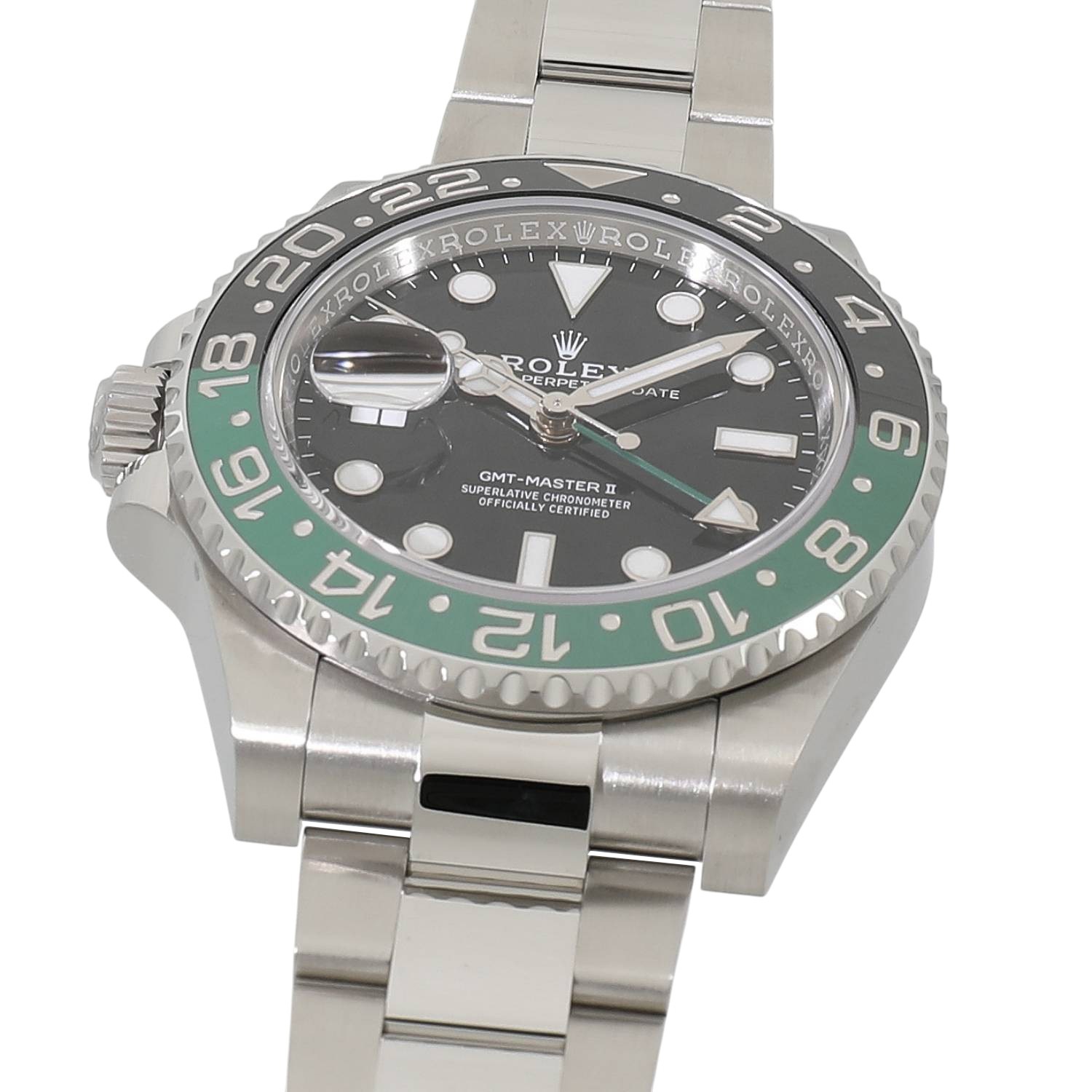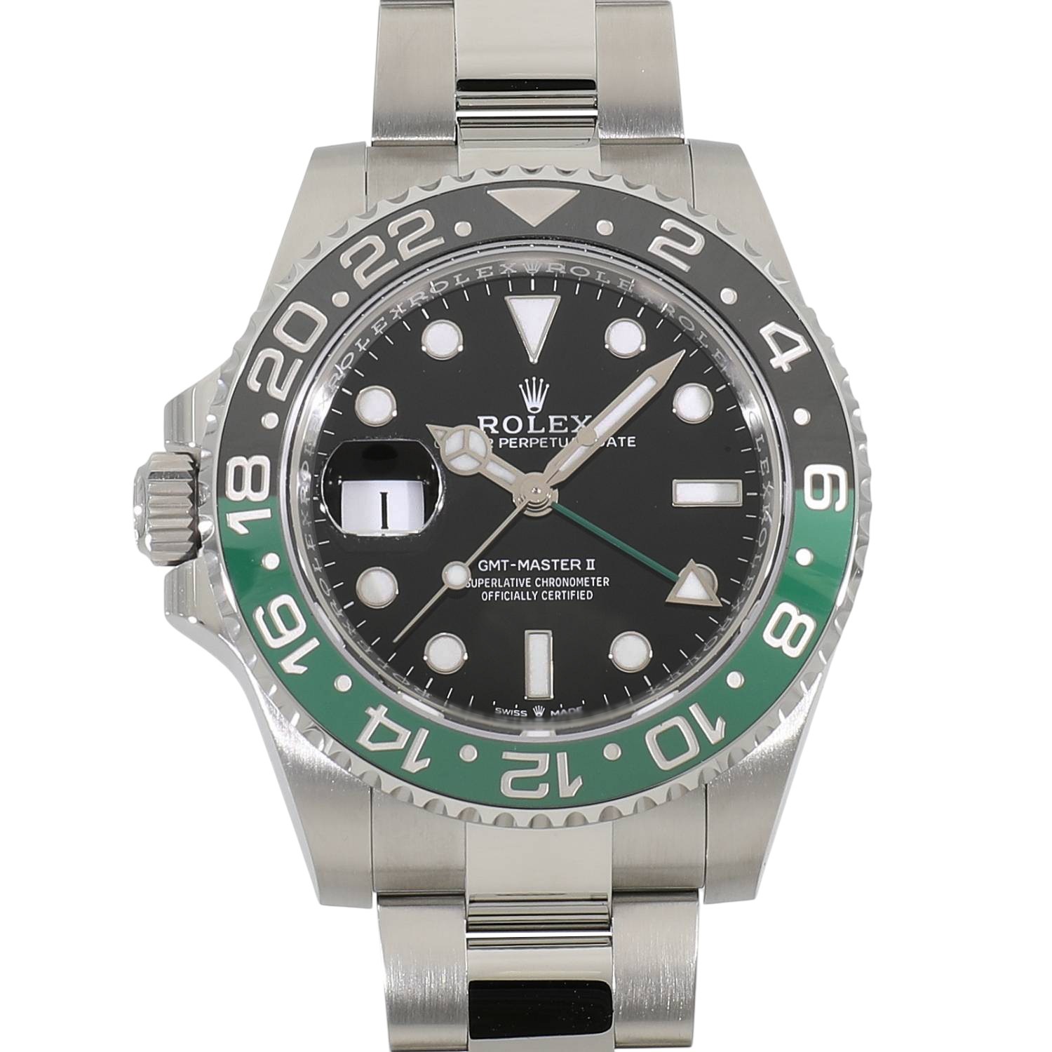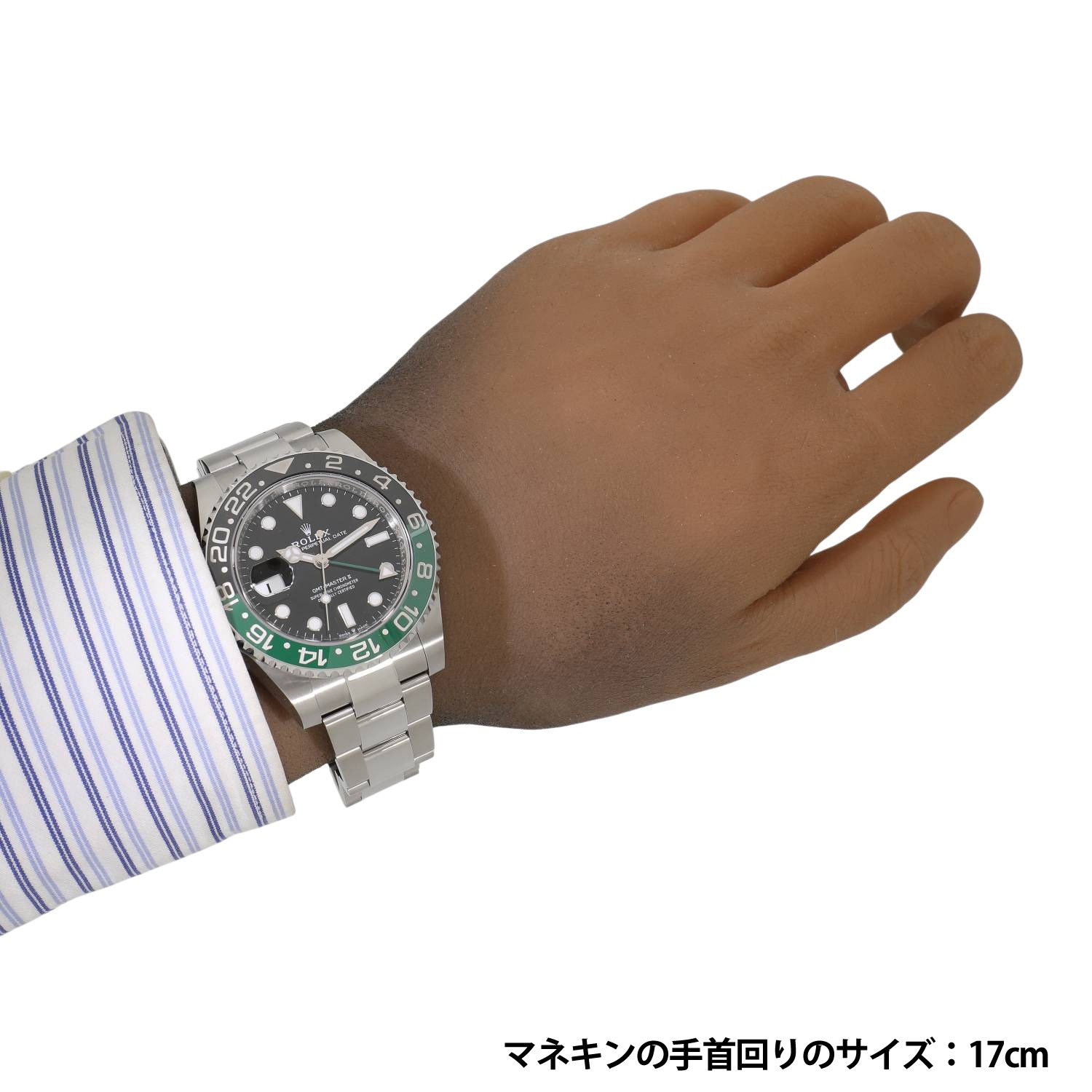 | モデルについて / Features | 2022年の新作 3つの時間を読み取る事が出来るGMTマスターII。リュウズを左側に備えたレフティー仕様として誕生しました。左利きの方でも時刻調整やゼンマイの巻き上げなどの操作がしやすい仕様となります。セラミック製のベゼルディスクは、ブラックとロレックスのコーポレートカラーでもあるグリーンの2トーンと目を惹くカラーリングとなっております。 |