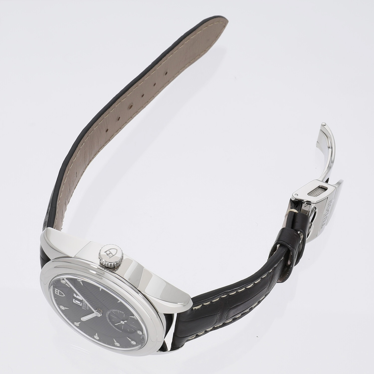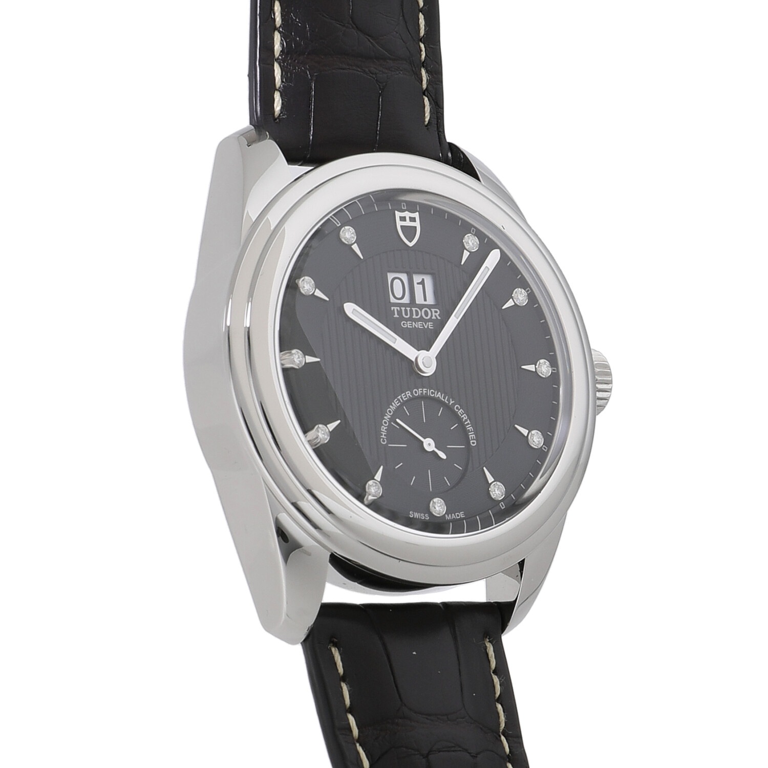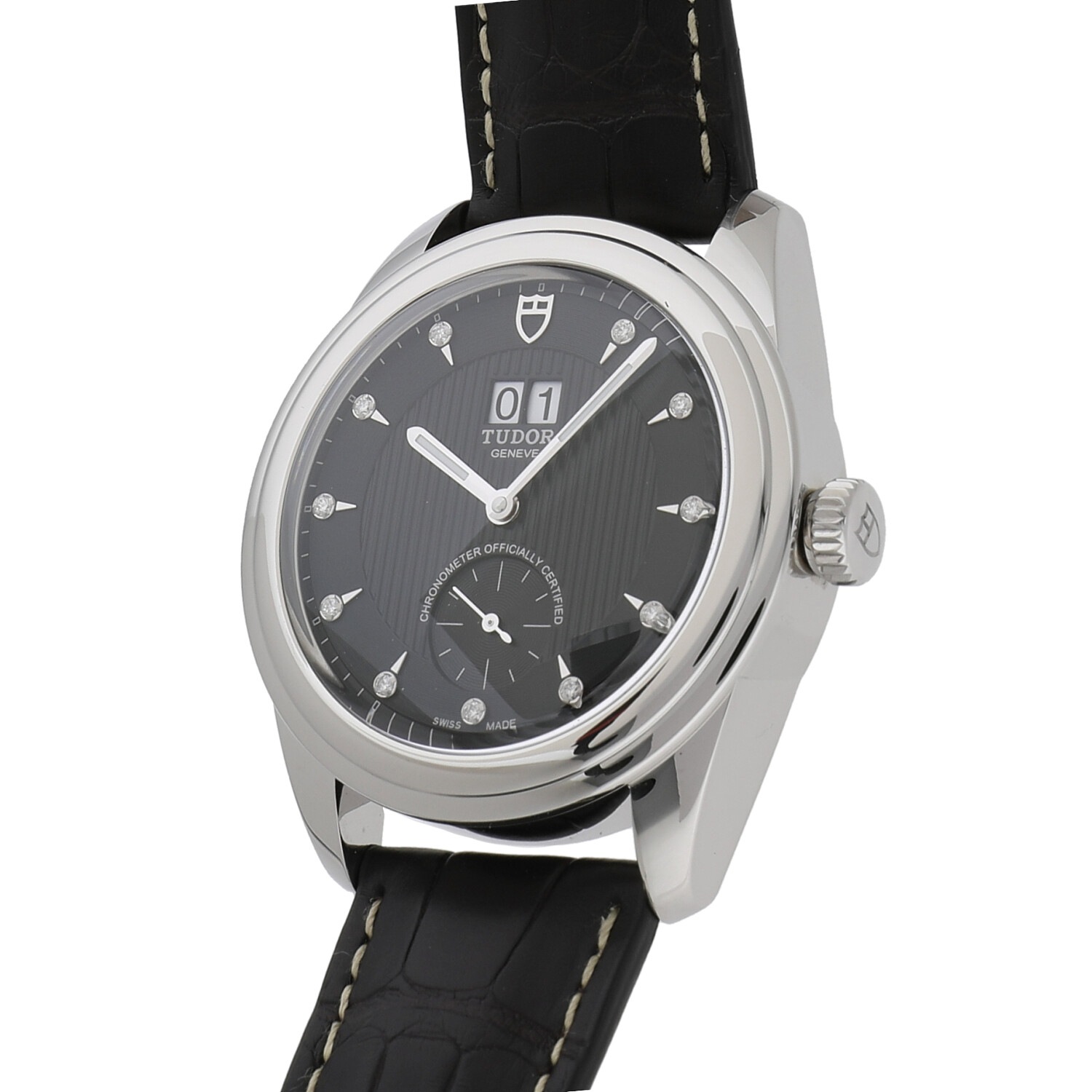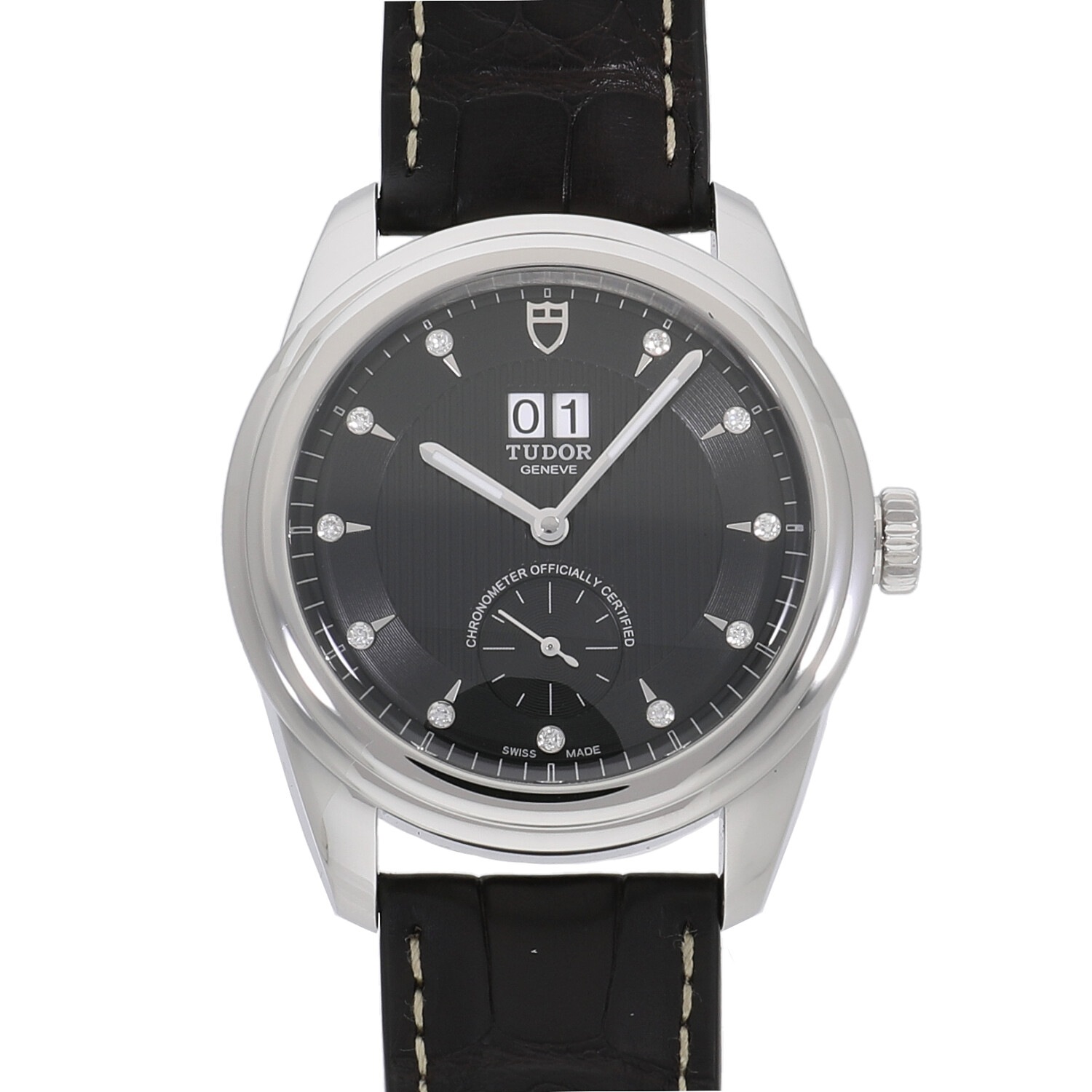 | 商品詳細 | チューダーの中でもクラシカルなコレクションとして展開されるグラマー。ふたつの窓で日付を表示するダブルデイトを持ち、リュウズ、バックル、ダイヤルの12時位置にチューダーのロゴがあります。マットブラウンのアリゲーターストラップは黒いダイヤルとマッチし、モダンで上品な雰囲気を作り出しています。ダイヤル上にはダイヤモンドがセッティングされており、腕元でさりげなく輝きます。ムーブメントはCOSCに認可を受けた自社製キャリバーMT5641を搭載しており、約70時間のパワーリザーブを備えています。 |