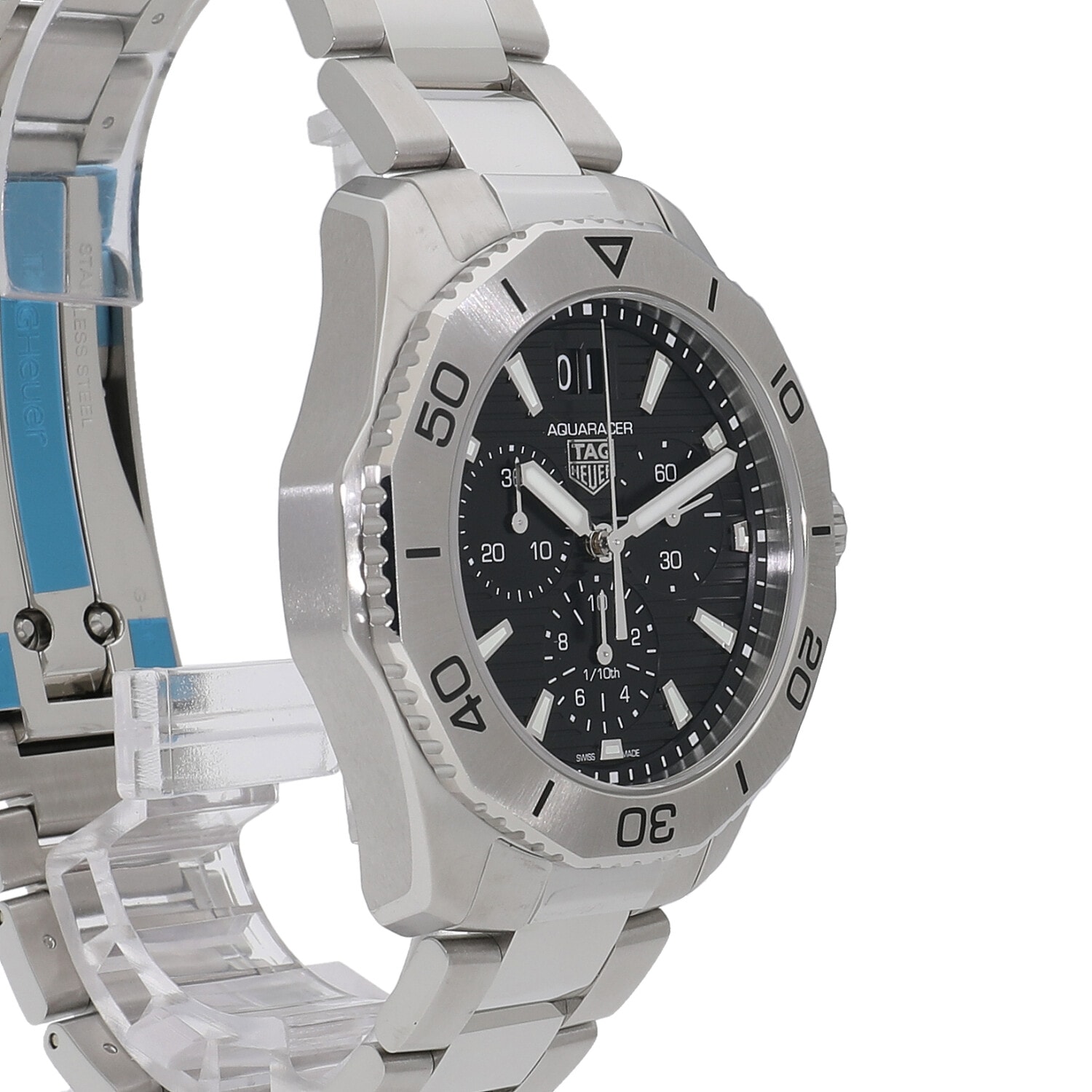 | モデルについて / Features | 2023年の新作 アクアレーサーという名の通り、水からインスピレーションを受けたスポーツウォッチ。クォーツクロノグラフムーブメントを採用し、6時位置には1/10秒計、12時位置には読みやすいビッグデイトを搭載しています。サテン仕上げとミラー仕上げを組み合わせており、スポーティーさをタイムレスなエレガンスさを感じさせます。 |