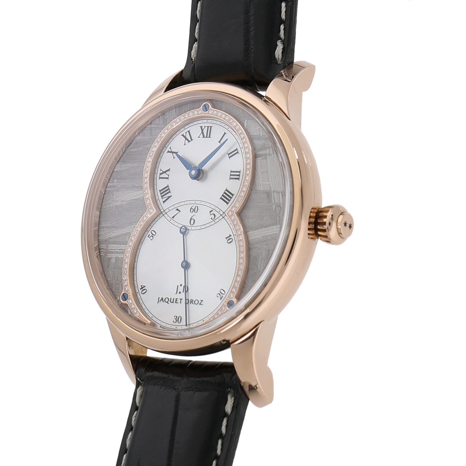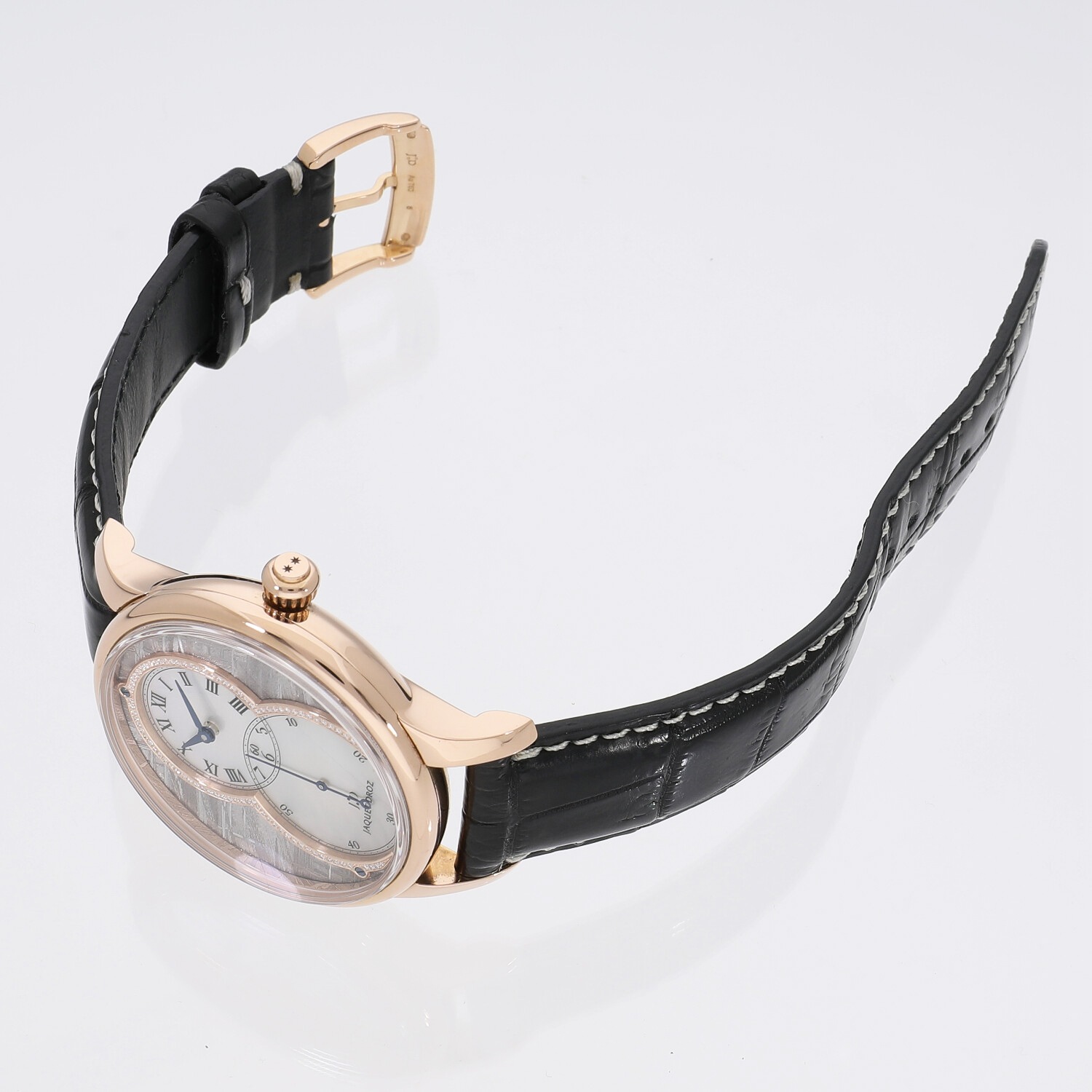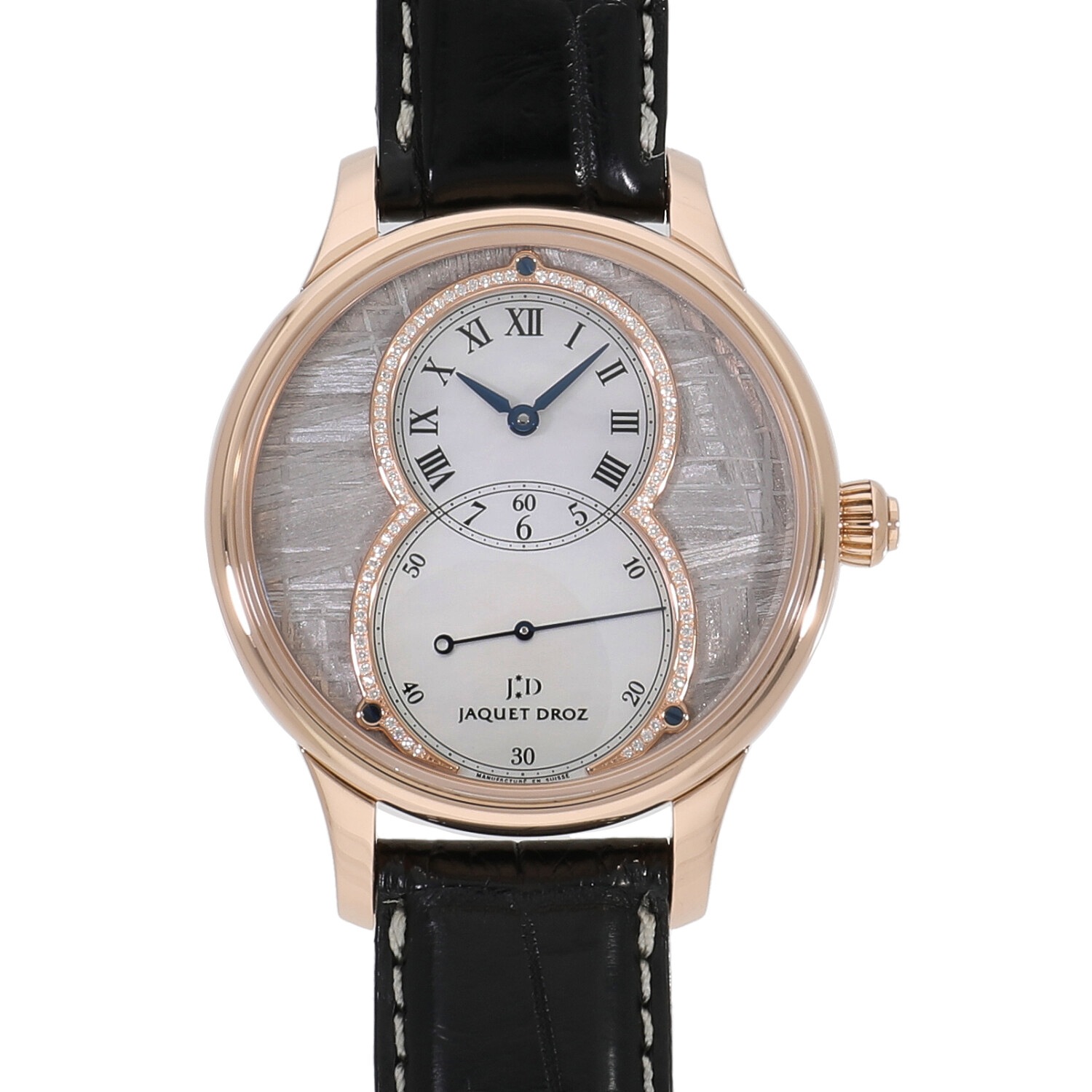 | 商品詳細 | ピエール・ジャケ・ドローが作り上げたポケットウォッチにインスピレーションを得た「グランセコンド」。ジャケドローの人気モデルです。レッドゴールドのケースの中にはメテオライトのダイヤルに、88個のダイヤモンドで縁取ったホワイトマザーオブパールのサブダイヤルが収まっております。いずれも天然素材であるため全く同じ模様のものはなく、世界でも限定88本のみの希少性が高いモデルです。 |