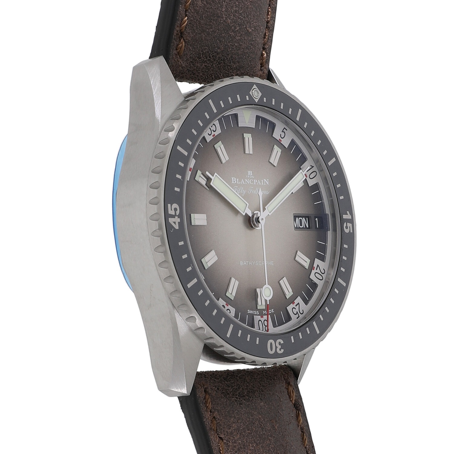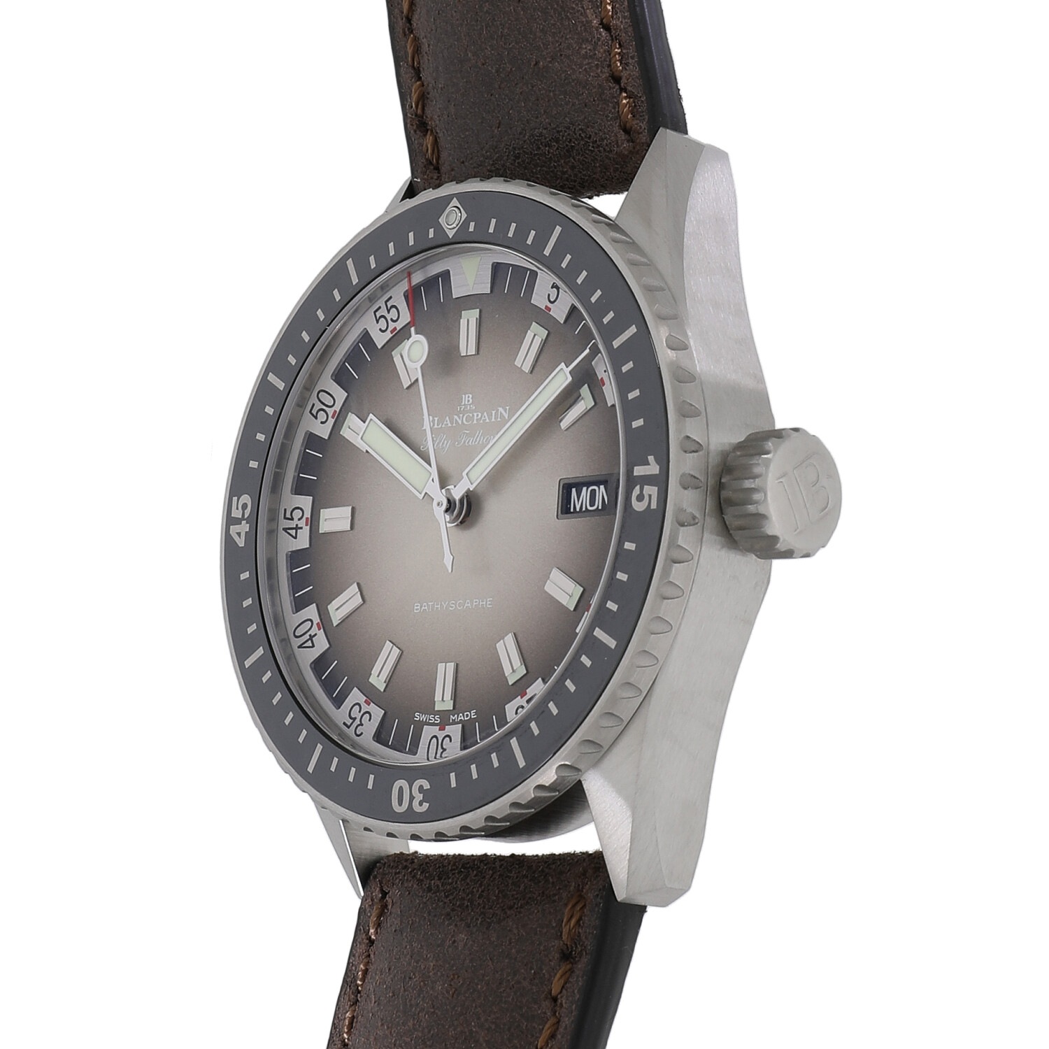 | モデルについて / Features | 現存する時計ブランドの中で、世界最古の歴史を誇るのブランパン。ブランパンのダイバーズウォッチの歴史は、1953年にフランス海軍の潜水部隊向けに”フィフティーファゾムズ”を作った事に始まります。近年人気のあるセラミック素材を使用するなど、モダンなデザインのダイバーズウォッチに仕上がりました。バチスカーフとは小型の深海探査艇の名前、ファゾムとは古英語で【両手を一杯に伸ばした腕】という意味の”ファゾム”に由来し、1ファゾムズは平均的な成人男性の腕の幅である約1.8mになります。グレーのグラデーションに特徴的なインデックスという大胆なデザインの文字盤が、1970年代のダイバーズウォッチ感を醸し出しています。世界500本の限定モデルです。 |