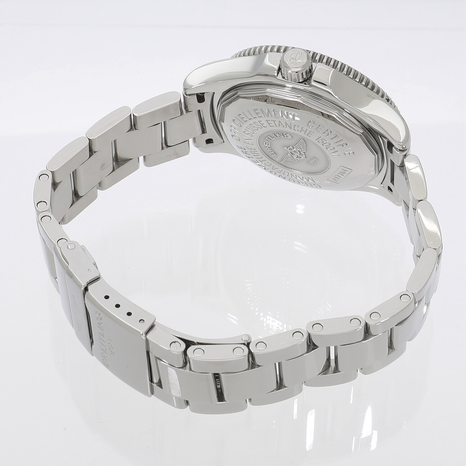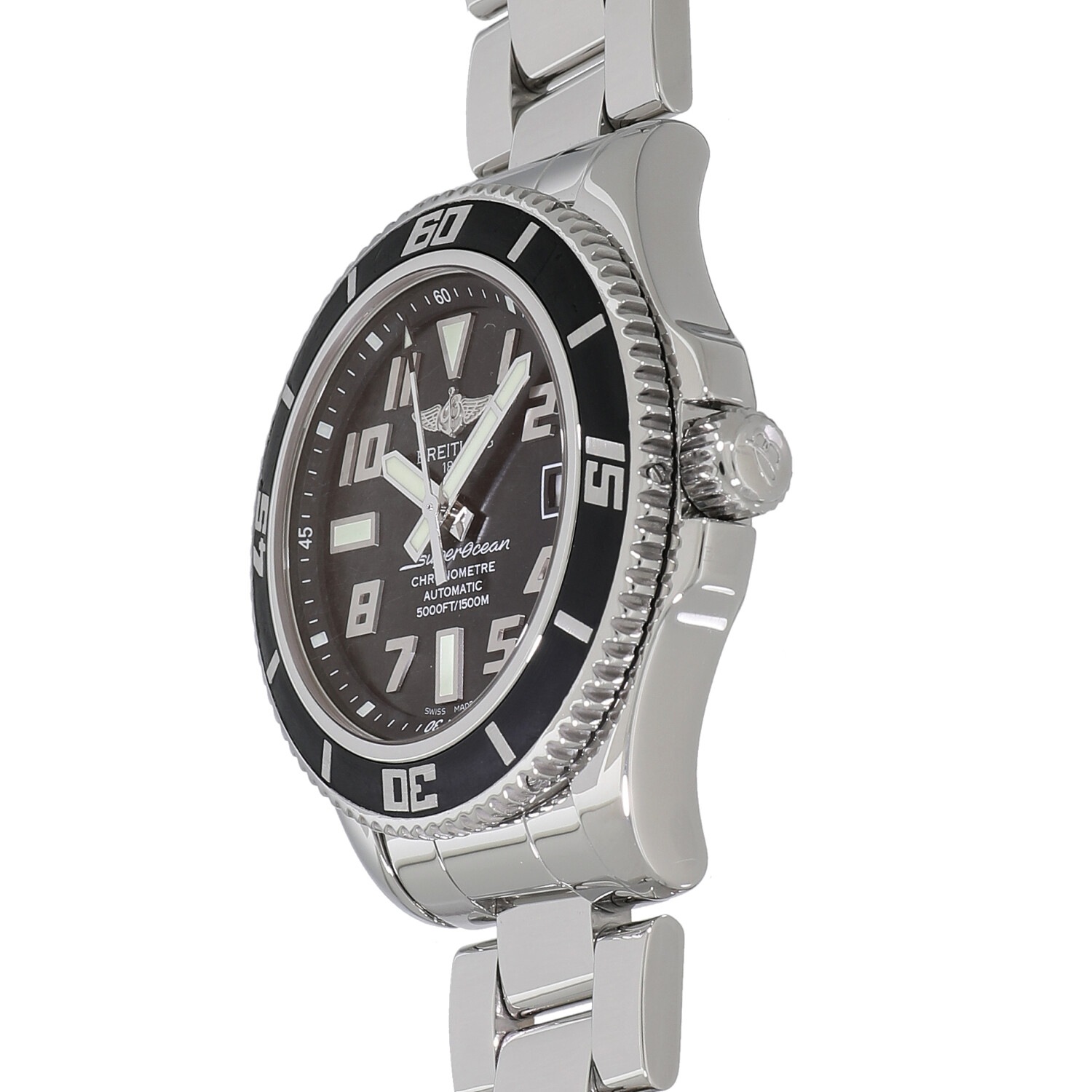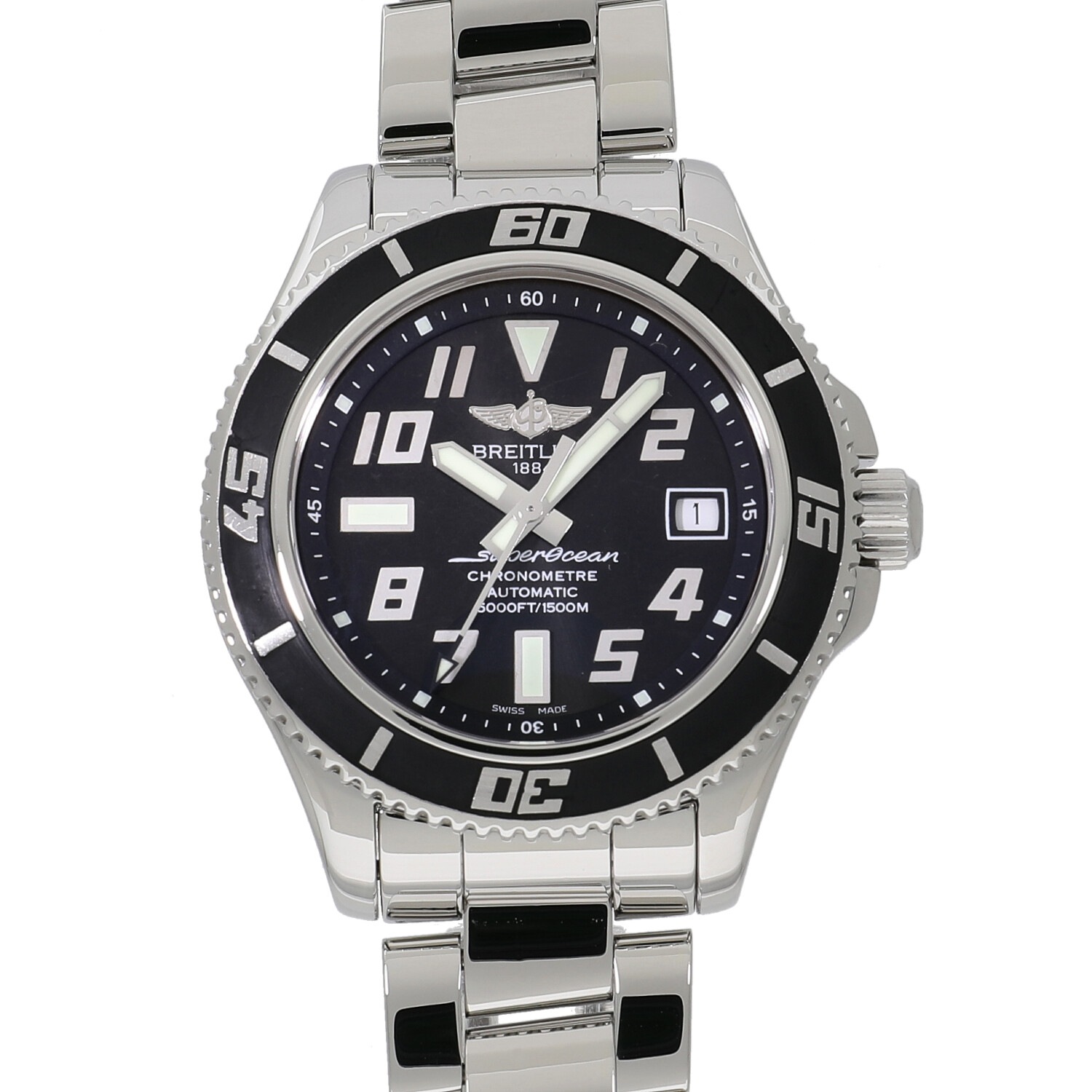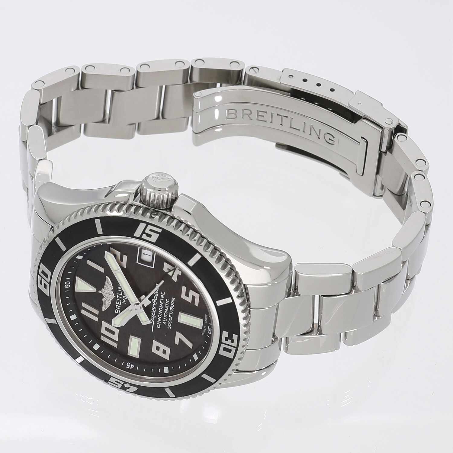 | モデルについて / Features | ブライトリングの本格派ダイバーズウォッチコレクションである「スーパーオーシャン」。大きなアラビア数字のインデックスは、視認性向上のために表面にサテン仕上げを施しています。さらに、ベゼルにはブラックラバーが使用され、デザイン性にも優れたモデルとなっています。頑強なケースは1500mの耐水性能を実現。オートエスケープバルブを搭載しているので、飽和潜水にも十分に威力を発揮します。 |