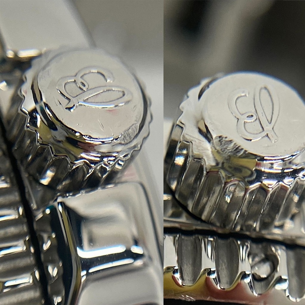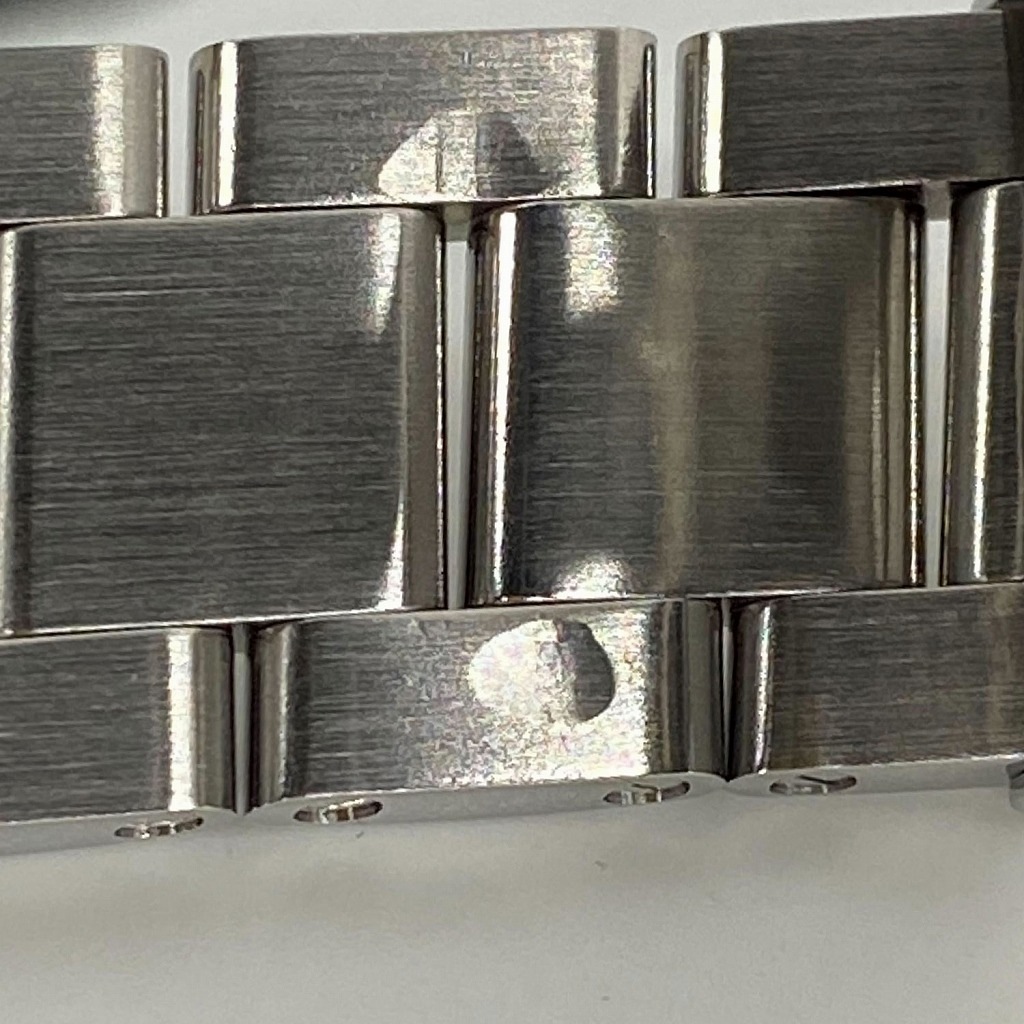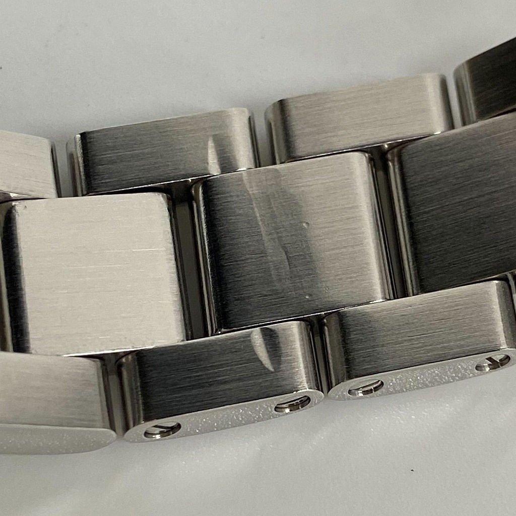 | メンテナンス・状態 / Maintenance・Description | オーバーホール・外装ポリッシュ(当店にて:2023年9月)。仕上げで取り切れなかった小さな打痕や微細な傷が、全体的に見受けられます。12時側のブレスレットの裏側には、バックル部分にぶつけたようなへこみがございます。リューズのロゴ周辺には、削れている部分がございます。ブレスレットの伸びは少しございますが、夜光は良く光り、針の劣化もほとんど見られません。 Overhaul and exterior polish (at our store: September 2023).There are some dents on the back side of the bracelet at 12 o'clock, as if the bracelet was bumped against the buckle. The area around the logo on the crown has been shaved off. The bracelet is slightly stretched, but the luminescence shines well and the hands show little deterioration. |