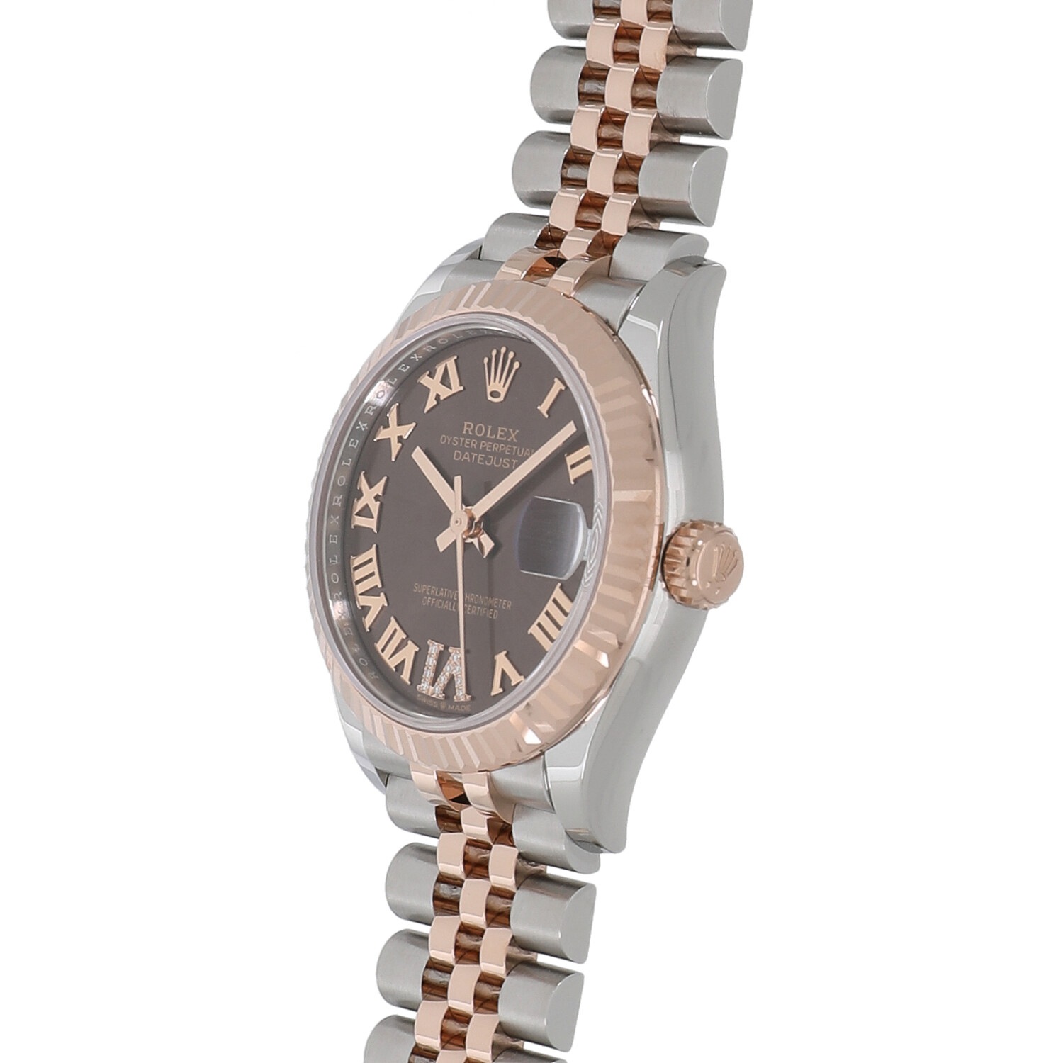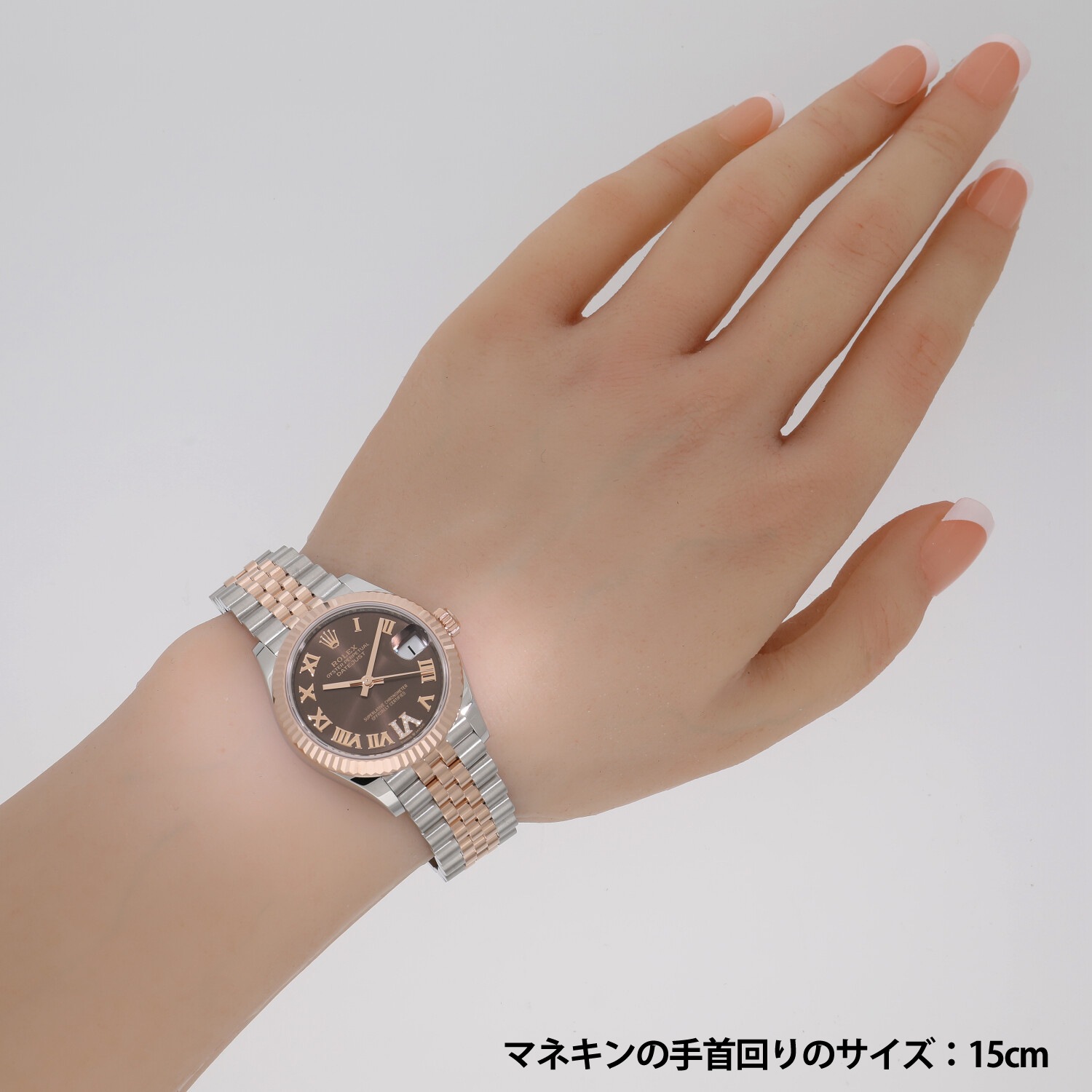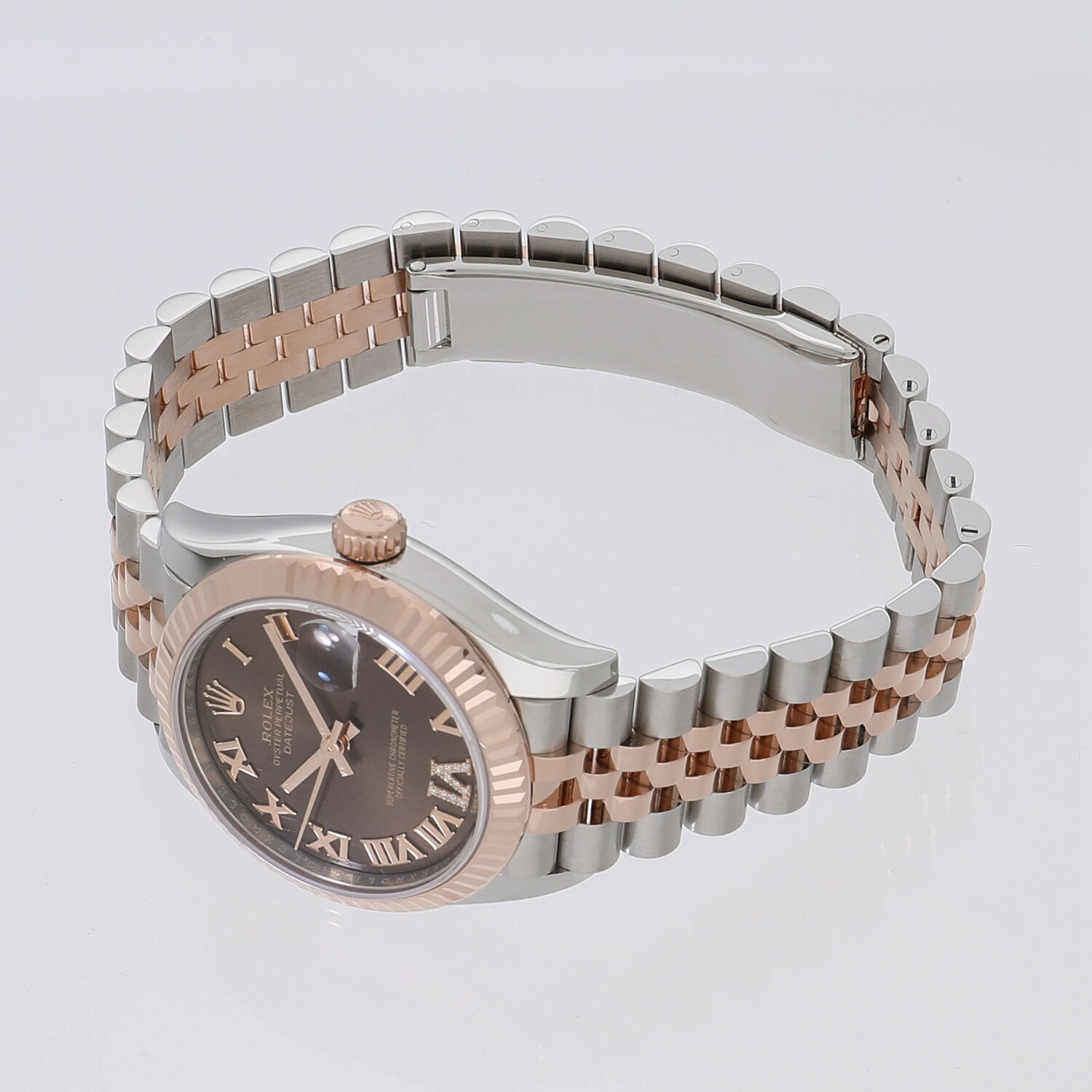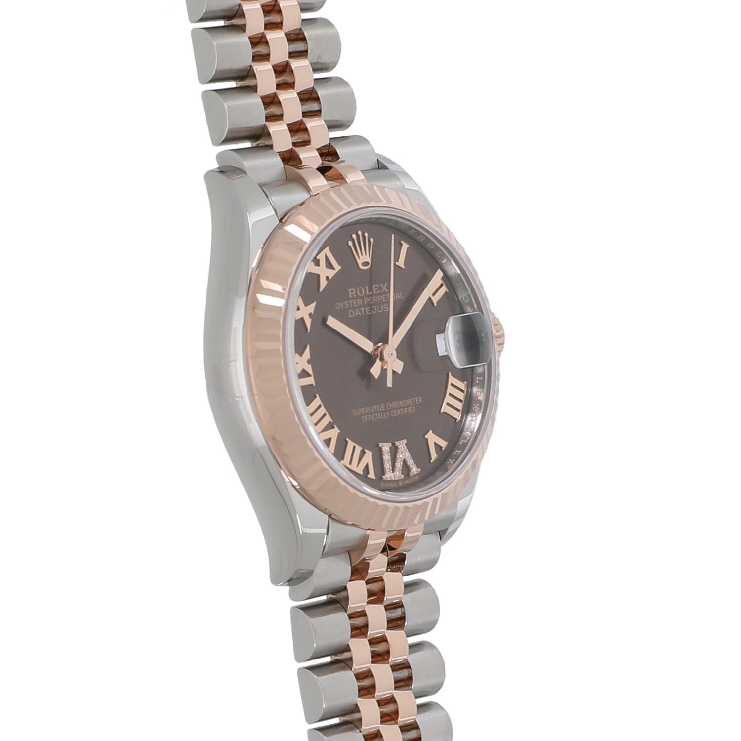 | モデルについて / Features | ロレックスの三大発明を備え、幅広いバリエーションが魅力的なデイトジャスト。いつの時代もブレない軸を持ったその意匠は、世界中から高い人気を得ています。これまでレディースのデイトジャストは26mmがケースサイズの定番でしたが、2019年には新たに31mmとやや大型化したサイズが追加されました。それと同時にブレスレットの厚みの変更も行われ、装着感がより滑らかになりました。エバーローズゴールドとチョコレート文字盤の組み合わせは人気が高く、6時のインデックスには11個ものダイヤモンドがセッティングされた美しいモデルです。 |