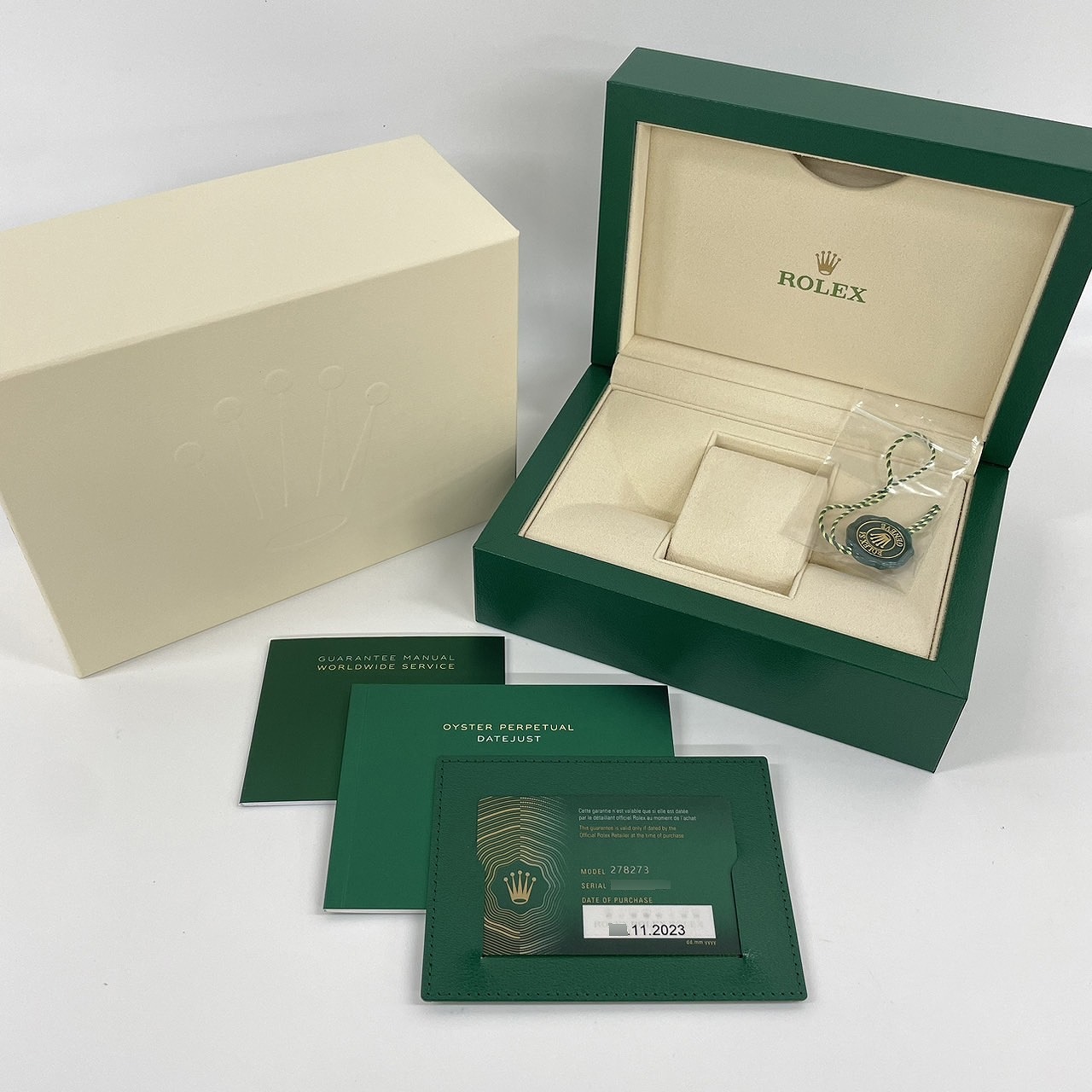 | 付属品 / Accessories | 純正ボックス/ 国際保証書(あり:2023年11月 )/説明書、ギャランティーカバー、タグ |