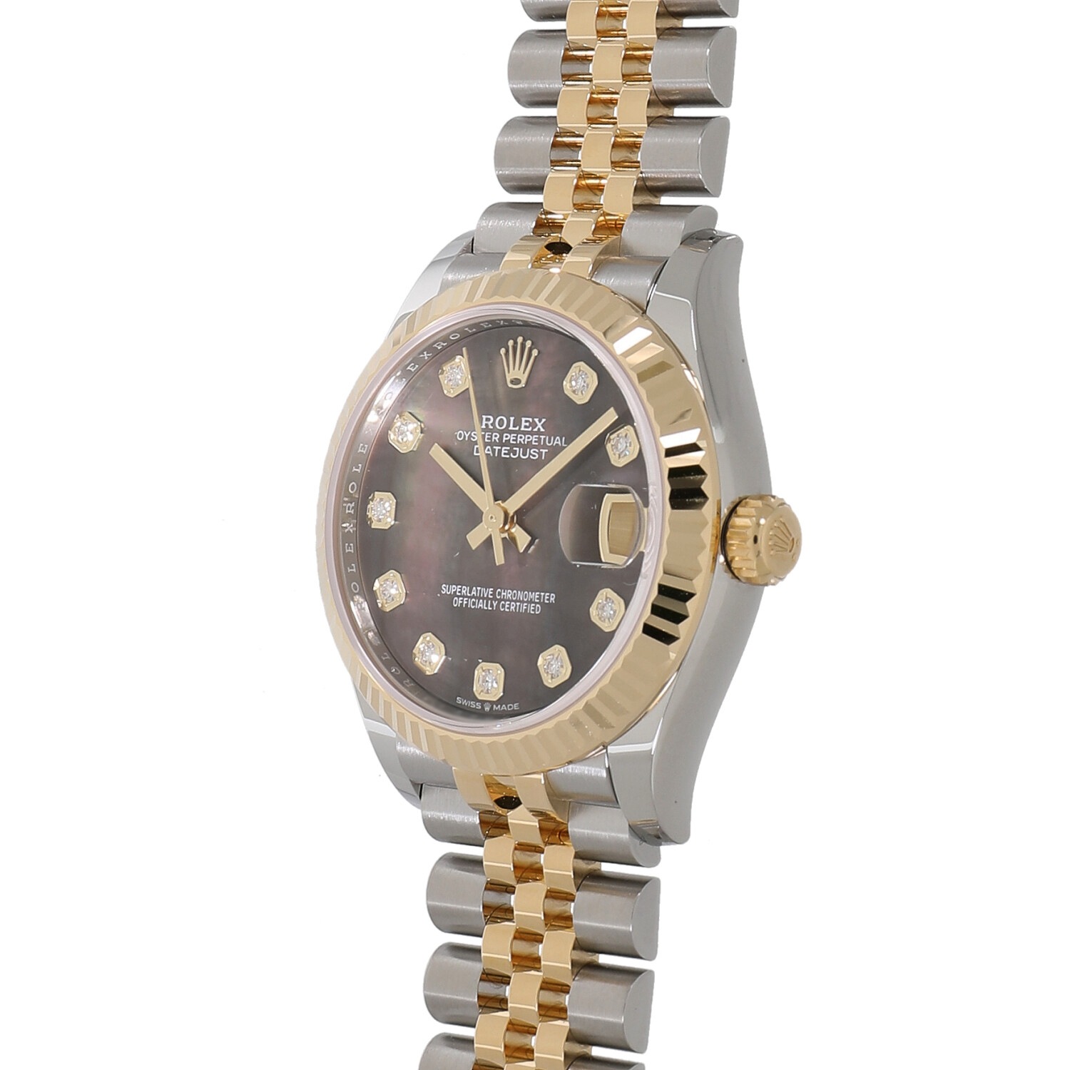 | モデルについて / Features | 光を取り込みキラキラと光る美しいカッティング加工が施された、イエローゴールド製のフルーテッドベゼルが目を惹くデイトジャスト。ブラックのシェル文字盤に10Pダイヤモンドの組み合わせが上品さとエレガントさを醸し出しています。55時間のパワーリザーブを誇り、より高精度となった新型キャリバー2236を搭載しています。 |