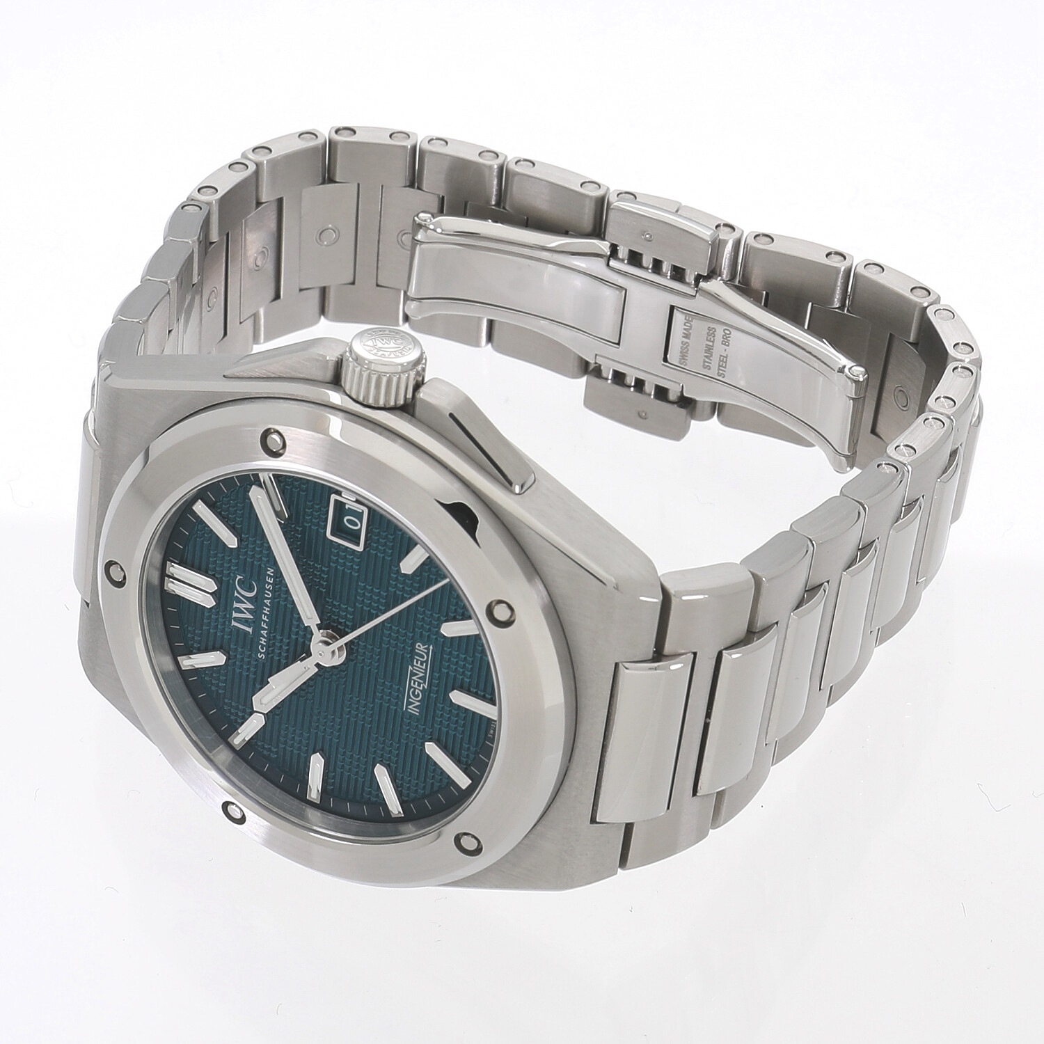 | モデルについて / Features | 2023年の新作 技術者のために開発された耐磁時計の先駆者的モデルのインヂュニア。1970年代のインヂュニアSL(ref:1832)の特徴を受け継ぎながら、現代的な解釈を加えて最新の技術で21世紀の時計にアップデートされています。ベゼル内側のリングはより幅広に、12時のバーインデックスが追加され「IWC」のロゴの位置が下方へ移りました。リューズガードも新設されています。このモデルでは4色のバリエーションが用意されていますが、こちらはその中でも最も個性的なグリーンのダイアルカラーとなっております。 |