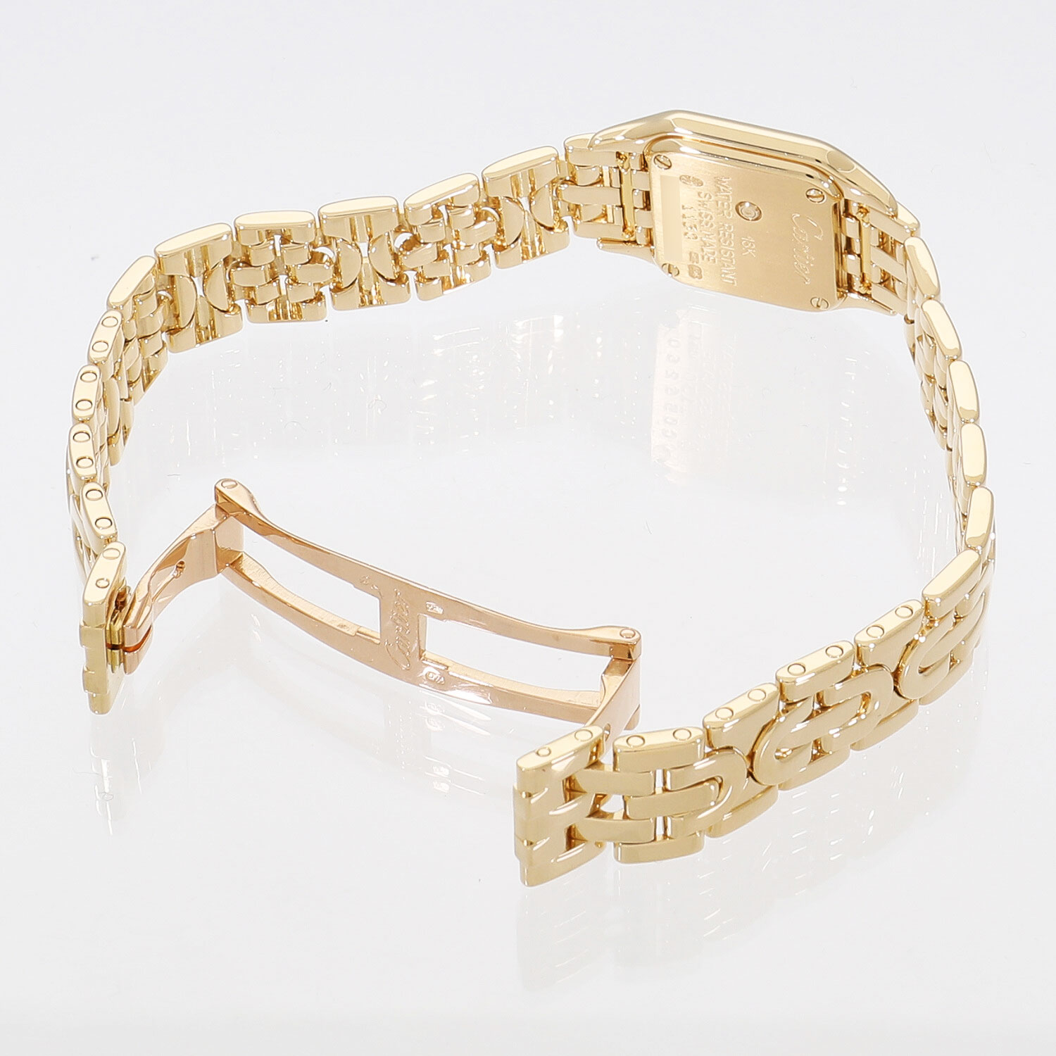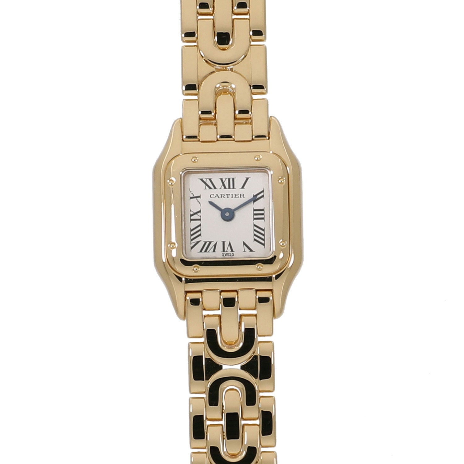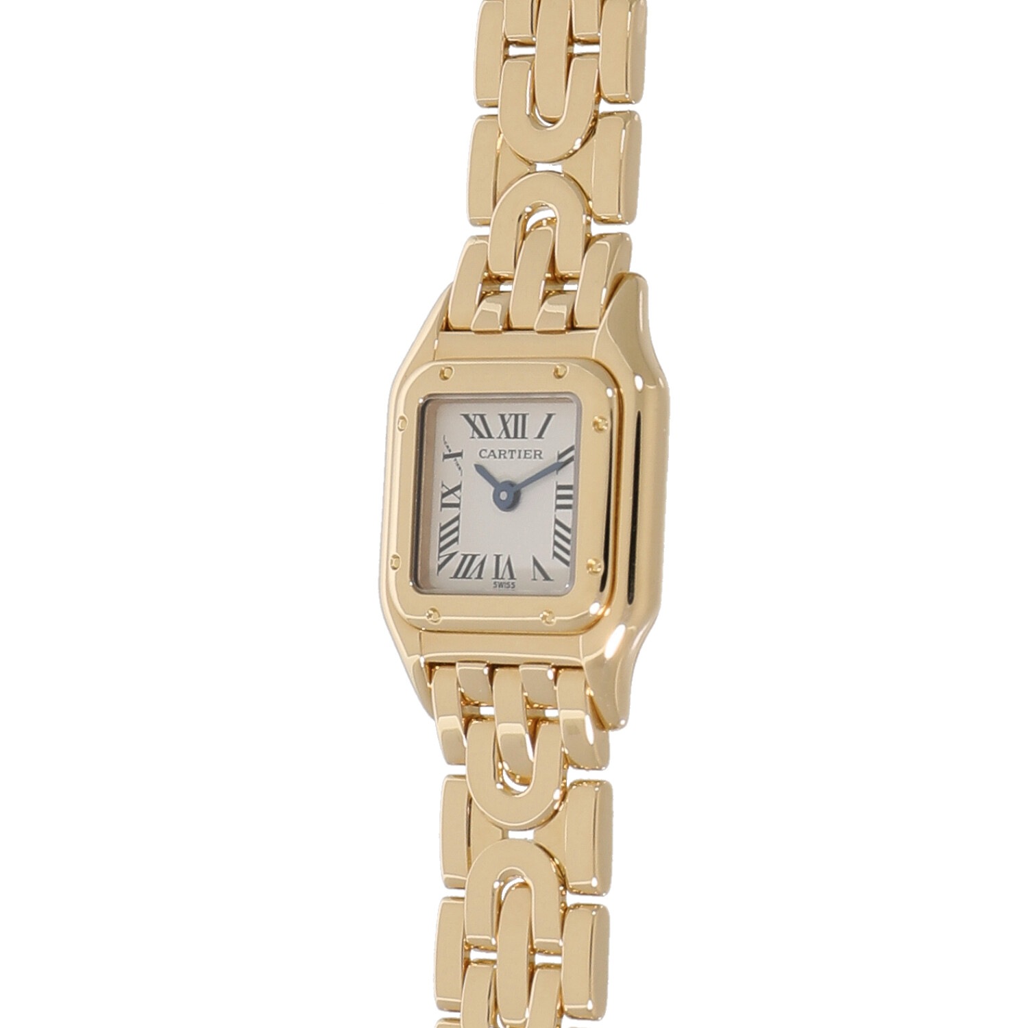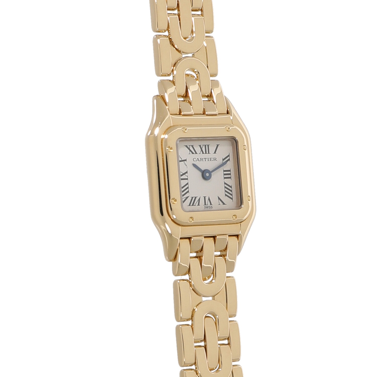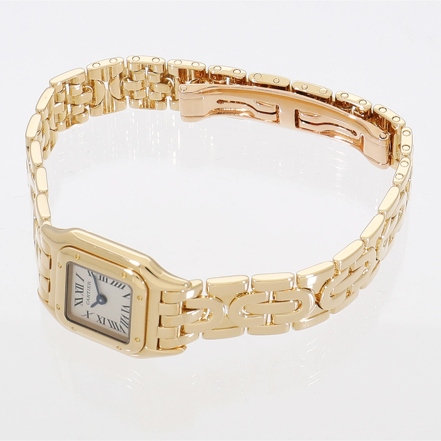 | モデルについて / Features | 1980年代に誕生してから長きに渡り多くの女性を魅了してきたカルティエのアイコン的コレクションであるパンテール。パンテールという名の通りデザインのモチーフはメゾンの象徴として多くのコレクションのモチーフとされる豹(パンサー)です。パンテールをさらに小ぶりとしたミニパンテールにはリュウズは無く、裏蓋のコレクターボタンを押す事で時刻を調整できます。通常のモデルとは異なるアールデコ期のデザインにインスピレーションを受けてデザインされたブレスレットが目を惹きます。 |