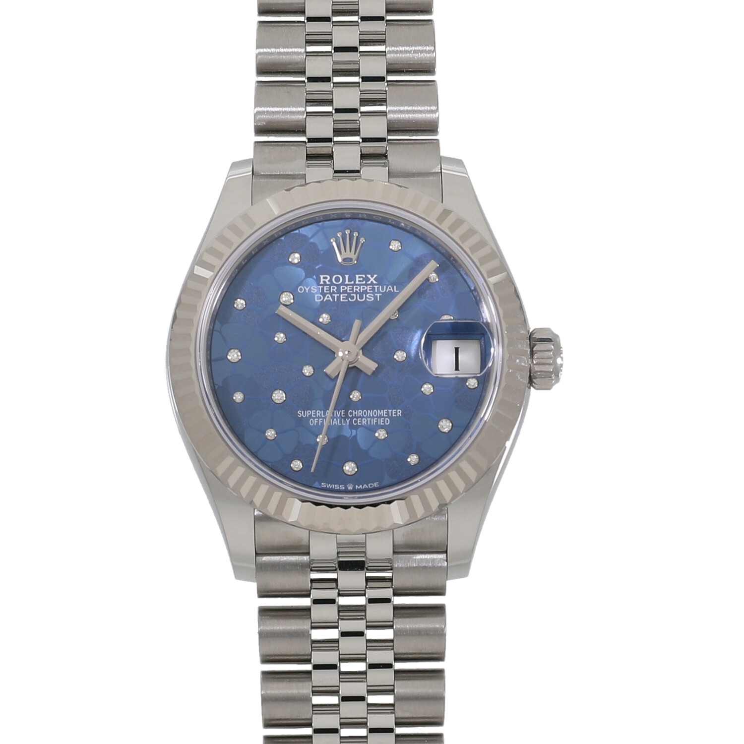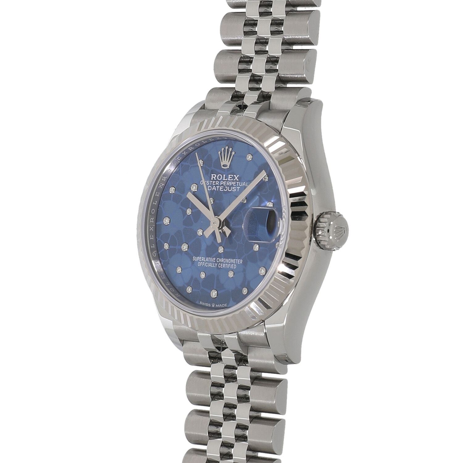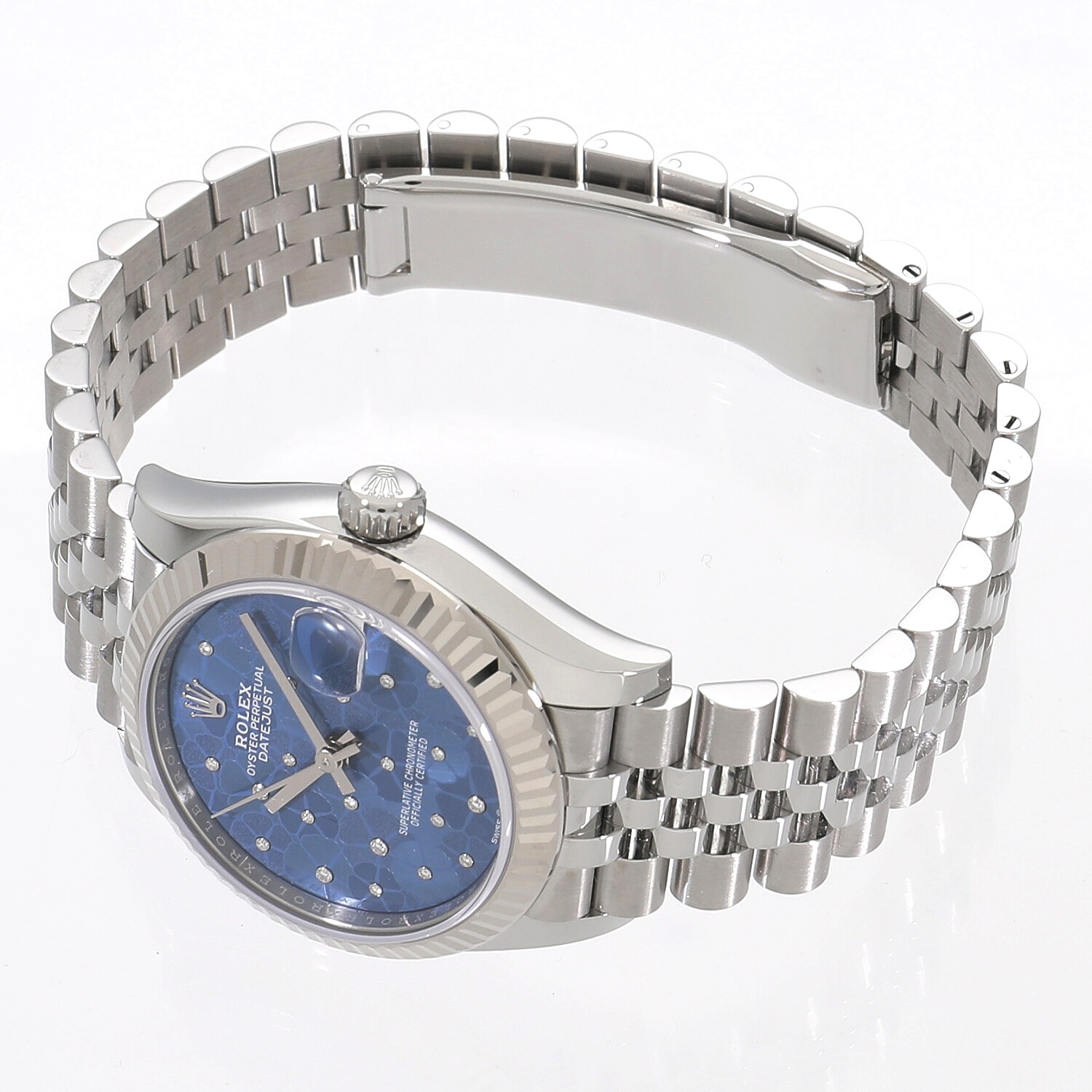 | モデルについて / Features | 2022年の新作 光を取り込みキラキラと光る美しいカッティング加工が施された、ホワイトゴールド製のフルーテッドベゼルが目を惹くデイトジャスト。ジュビリーブレスレットとの組み合わせが上品で高級感を醸し出しています。55時間のパワーリザーブを誇り、より高精度となった新型キャリバー2236を搭載しています。3つの異なる仕上げが施されたアズーロブルーフローラルモチーフダイヤルは、花々の中心に輝きを添えるさまざまな大きさの24個のダイヤモンドにより、シリーズ屈指のエレガントさを誇ります。 |