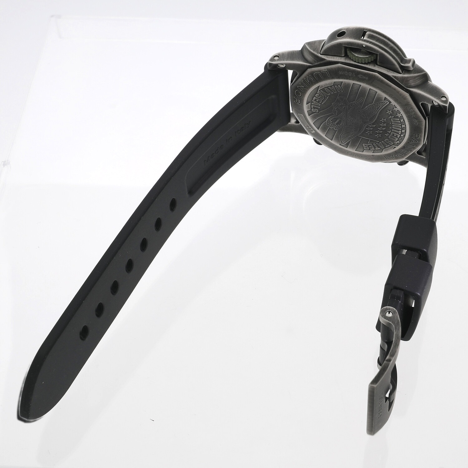 | モデルについて / Features | 2023年の新作 アメリカ海軍の特殊部隊であるネイビーシールズの名を冠した世界限定562本の希少なコレクションです。文字盤はグラデーションがかったデグラデグレー、ケースバックにはネイビーシールズの紋章がエングレービングされています。ケースの素材にはリサイクル素材を使ったEスティールを採用。ケースに薄いPVDコーティングを施し、そのコーティングをポリッシングで削り取るという、パネライが独自に開発したブルニート仕上げを施しており、長年の使用でエイジングされたヴィンテージモデルの様な雰囲気を漂わせています。 |