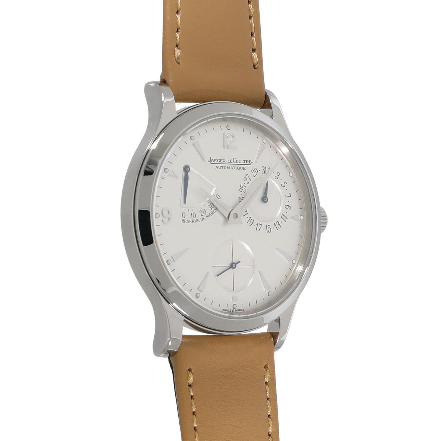 | モデルについて / Features | レベルソと並びジャガールクルトを代表するコレクションであるマスターシリーズ。マスターシリーズに搭載されるムーブメントは、社内での1000時間もの過酷なテストをクリアしたもののみ採用され、高精度と高い実用性を誇ります。10時位置にパワーリザーブインジゲーター、2時位置には日付表示、6時位置にはスモールセコンドを備え、調和のとれたバランスで配置されています。シンプルなシルバーの文字盤上にブルースチールのスモール針がアクセントとなりダイヤルの美しい外観を造り出しています。 |