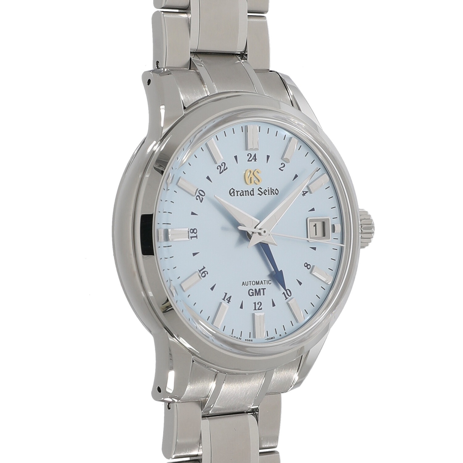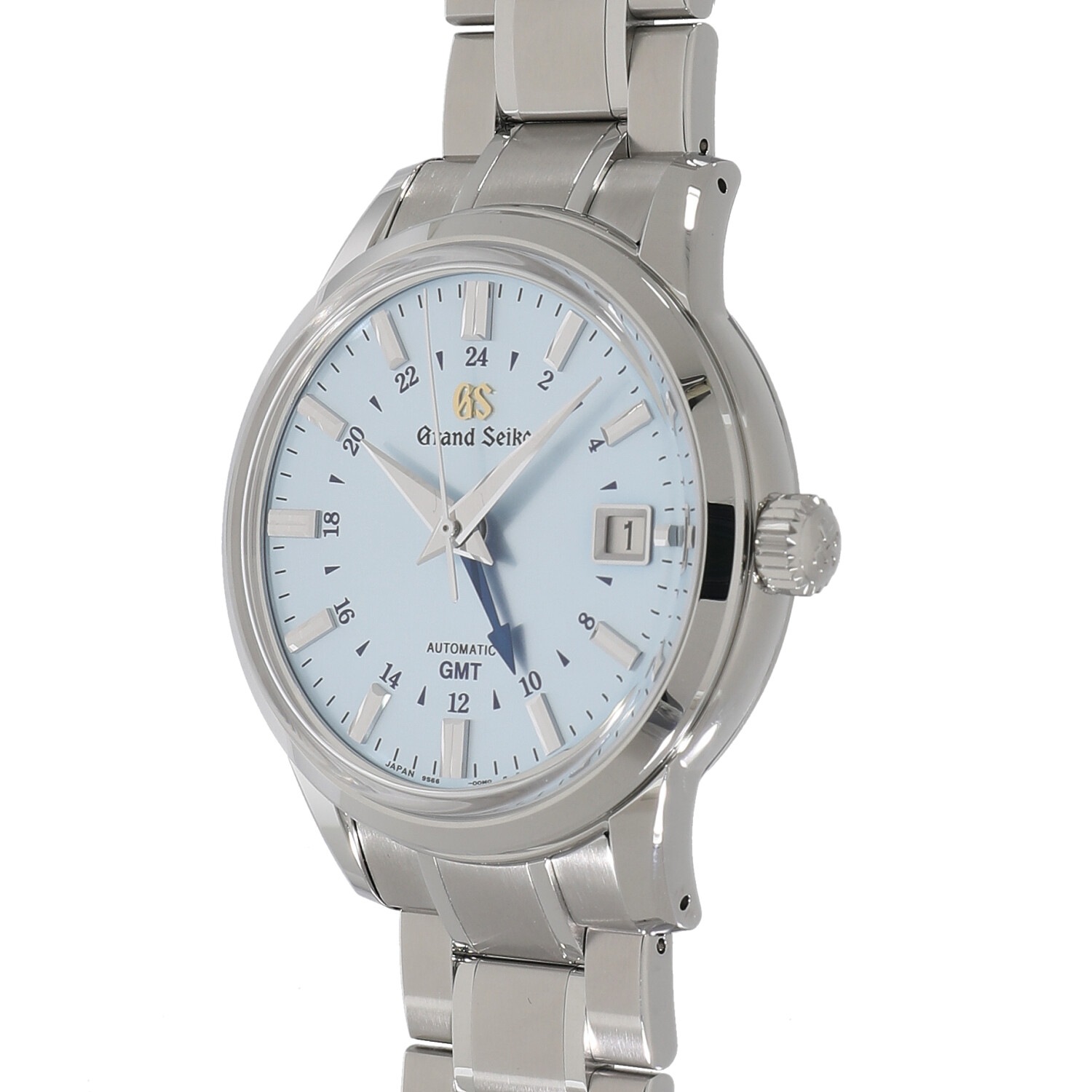 | モデルについて / Features | 2023年の新作 1960年に初代モデルが誕生し、世界に誇るメイドインジャパンの高級ウォッチブランドであるグランドセイコー。長らくクォーツのみで展開されていたグランドセイコーでしたが、キャリバー9Sの開発に成功したことで1998年にメカニカルのグランドセイコーが復活を遂げました。その9Sキャリバーの誕生20周年を記念し、世界1700本の限定・国内700本限定モデルとして発表されました。ブランド製造地「スタジオ 雫石」から望む岩手山の山頂から見上げる中天の情景を表現した、スカイブルーのダイヤルとボックス型のサファイヤガラス、ブルーのGMT針の組み合わせが、クラシックな趣ながらもモダンな雰囲気を醸し出しています。 |