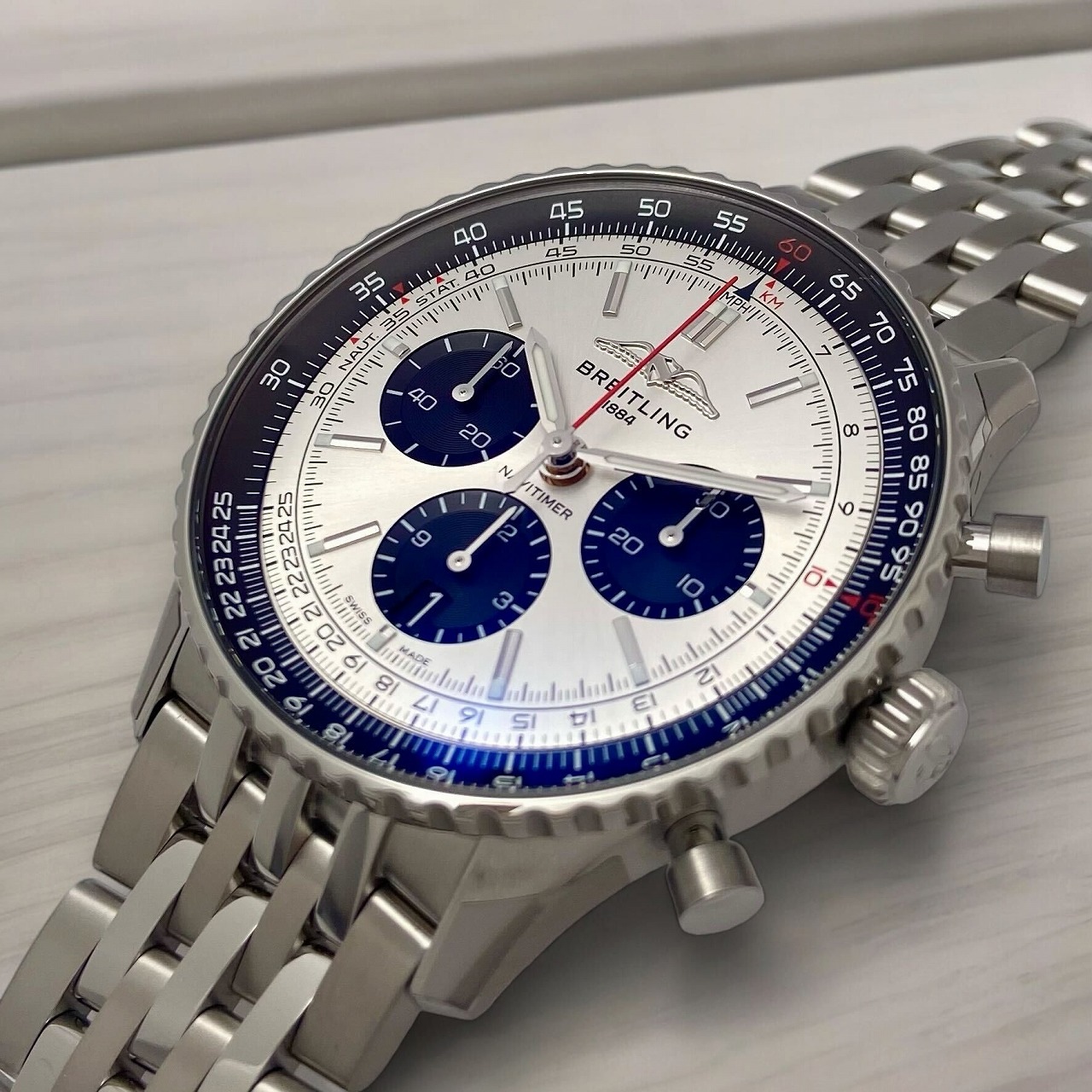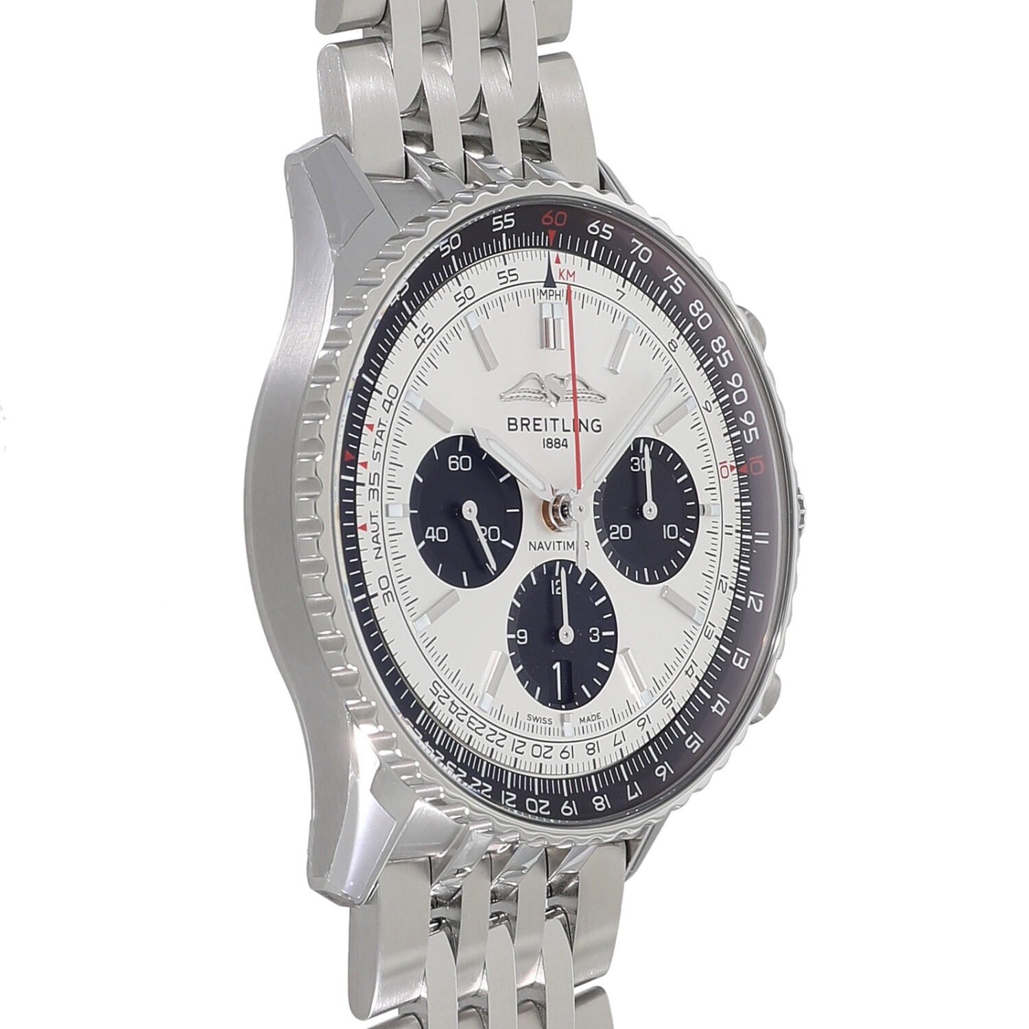 | モデルについて / Features | 2022年の新作 クロノマットと並びブライトリングのアイコン的コレクションであるナビタイマー。1940年代から1980年代に使用していたシンブルな「B」ロゴが復活し、裏蓋がシースルーバック仕様になっており自社製ムーブメント「ブライトリング01」の動きを堪能することができます。シルバーをベースに積算計と計算尺スケールにブラックを組み合わせた人気のダイヤルです。デイト表示が6時位置へ移動し、インダイヤルに段差を設けた事でガラッと印象が変わった新型ナビタイマーです。 |