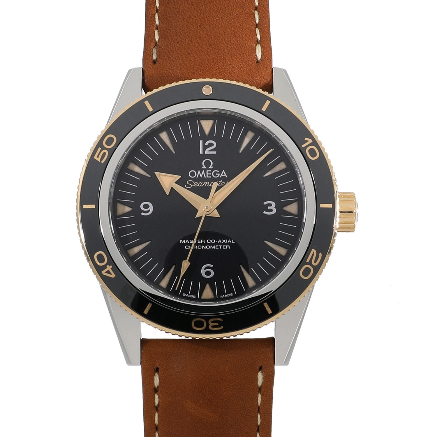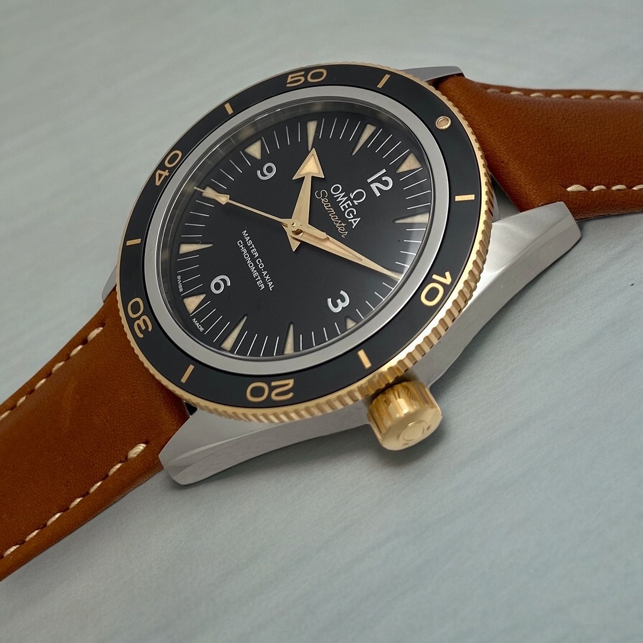 | モデルについて / Features | 1957年に誕生したシーマスター300の初代モデルを忠実に再現したモデル。経年によるエイジングを感じさせるインデックスの夜光や、サンドブラスト仕上げのダイヤルが、ヴィンテージモデルを彷彿とさせるデザインに仕上がっています。ベゼルリングやリュウズにイエローゴールド、光沢のあるセラミック製のベゼルインサートとの組み合わせにより、高級感を感じるダイバーズウォッチに仕上がっています。 |