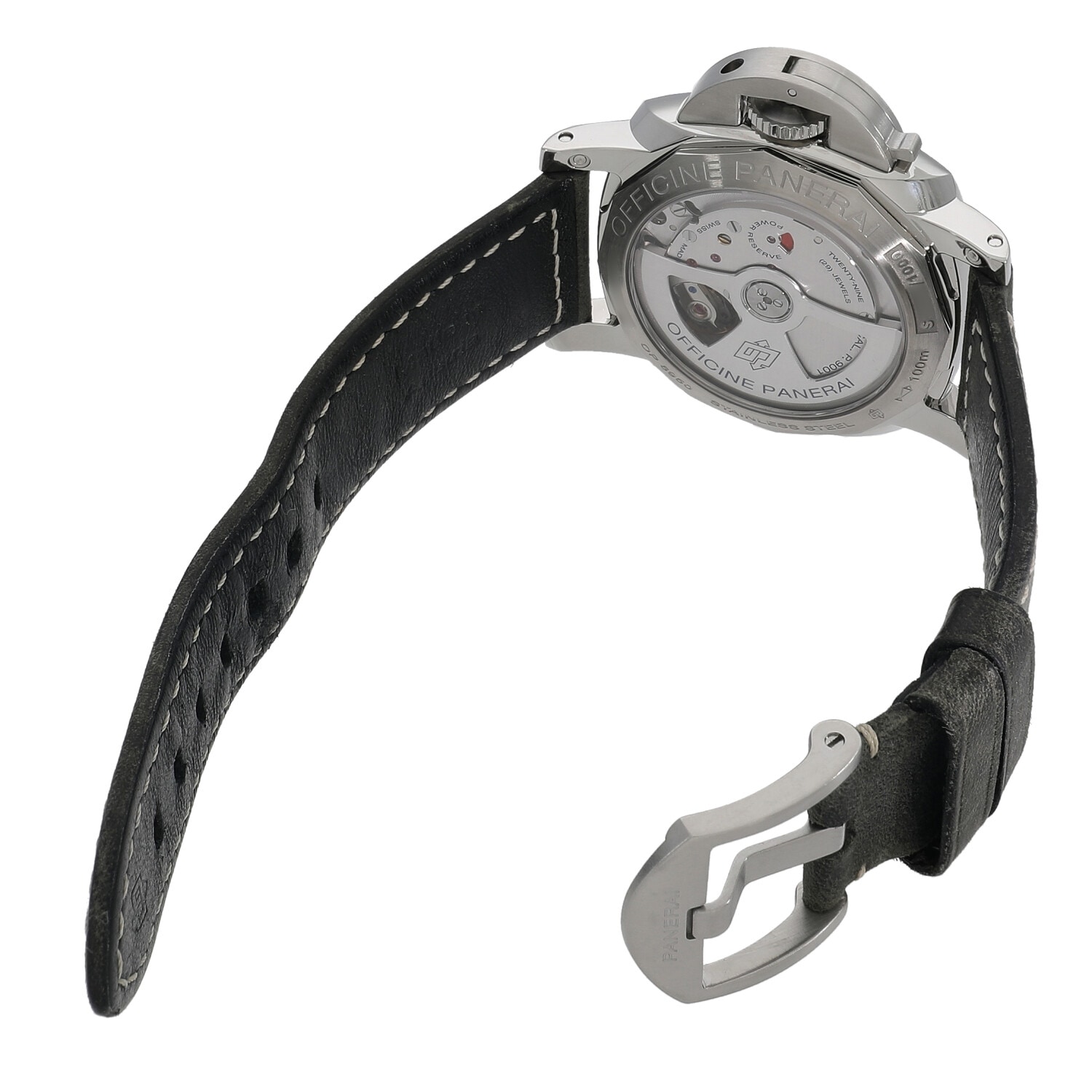 | モデルについて / Features | パネライのフラグシップコレクションでもあるルミノール。少し丸みを帯びたフォルムが特徴的で、1950年代に製造されていたモデルに着想を得てデザインされ、2005年からラインナップされているルミノール1950。ワッフルの様な凹凸のあるデザインの文字盤が特徴的で、3日間のパワーリザーブとGMT機能を備えます。ケースバックはスケルトン式で、扇形の窓でパワーリザーブ残量を確認する事が出来る自社製キャリバーP.9001を堪能する事が出来ます。42ミリのケースは大き過ぎず小さ過ぎない絶妙なサイズ感で、日本人の平均的なサイズの手首にも合いやすい大きさとなりました。 |