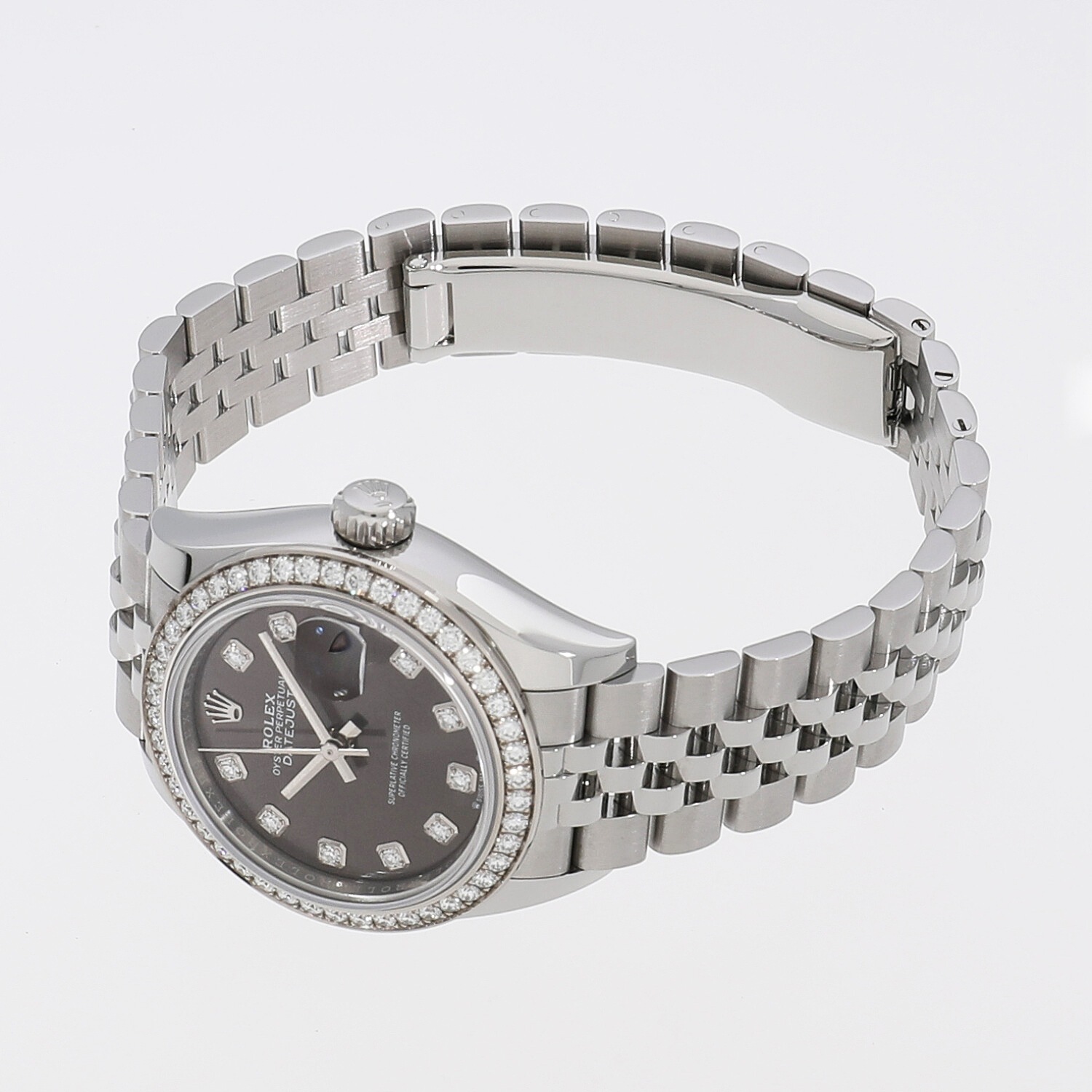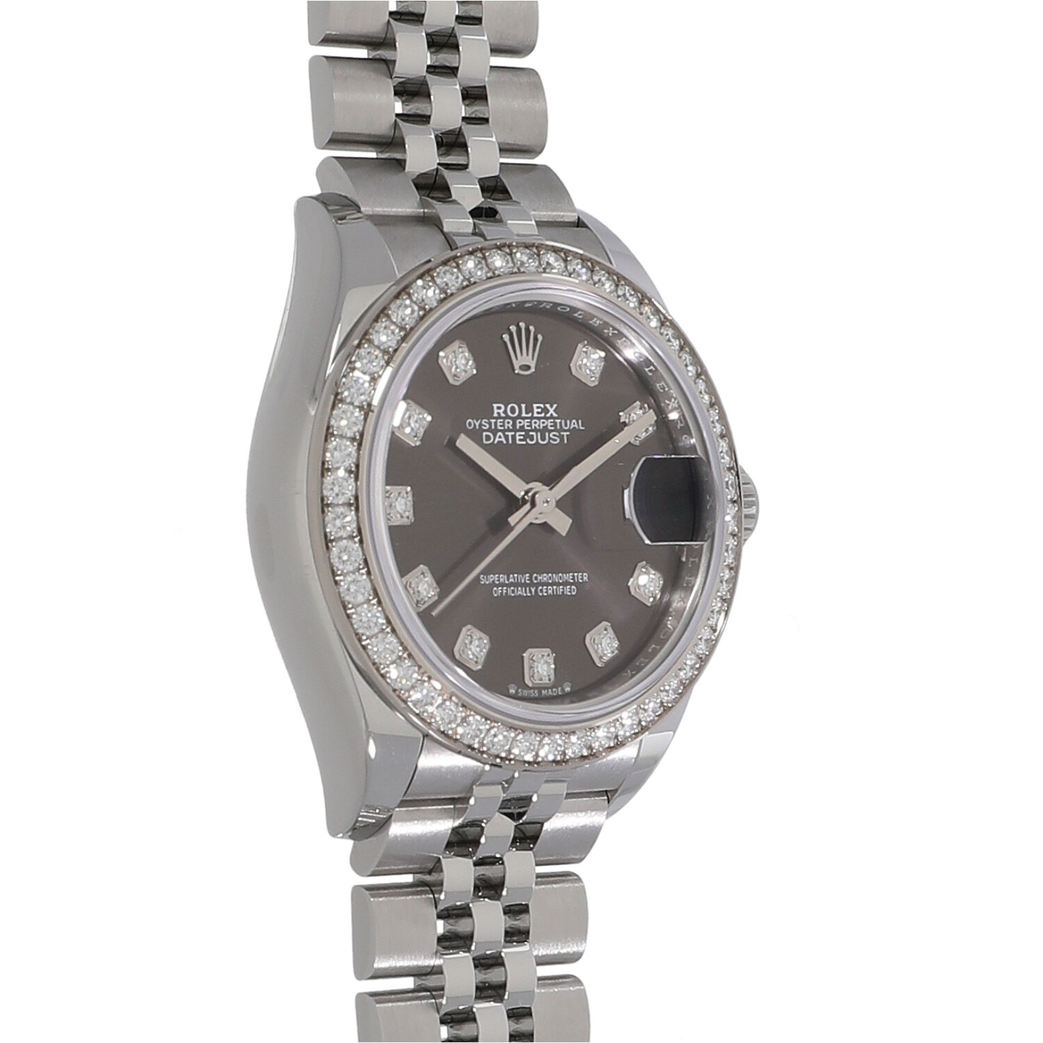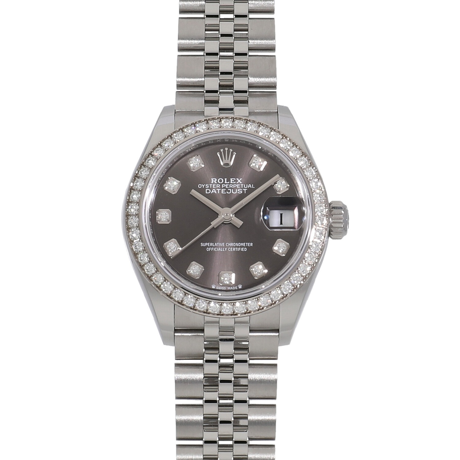 | モデルについて / Features | 1940年代に誕生したデイトジャスト。流行に左右されることのない普遍的なデザインは、いつの時代も女性の憧れの時計として高い人気を誇ります。これまでデイトジャストの定番サイズは直径26mmでしたが、新たに28mmサイズが追加されました。ケース径のサイズ変更に合わせてブレスレットのコマの厚みが薄くなり、装着感が向上しました。文字盤の色は落ち着いたシックな印象を感じるダークグレー、インデックスとベゼルにはダイヤモンドが輝いています。 |