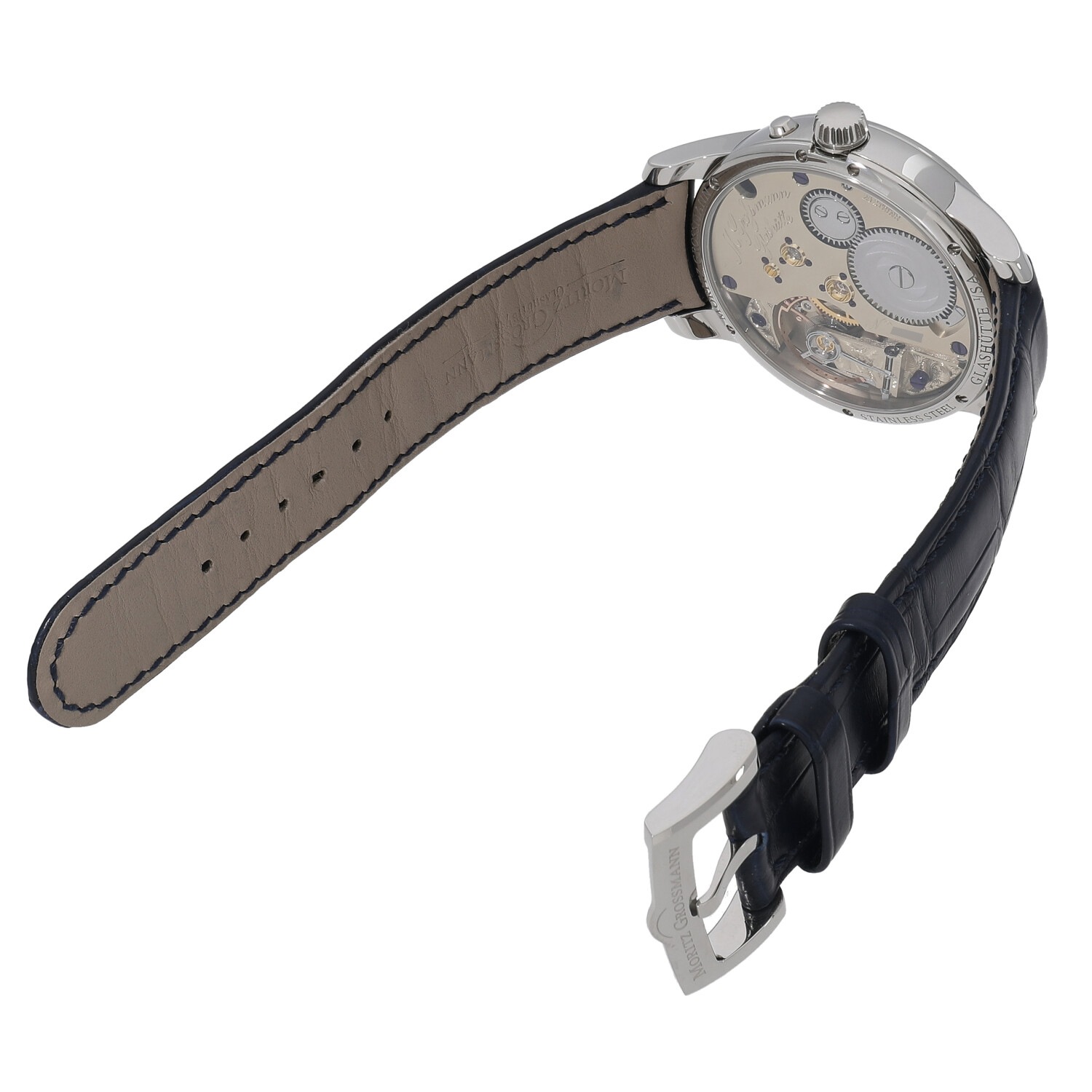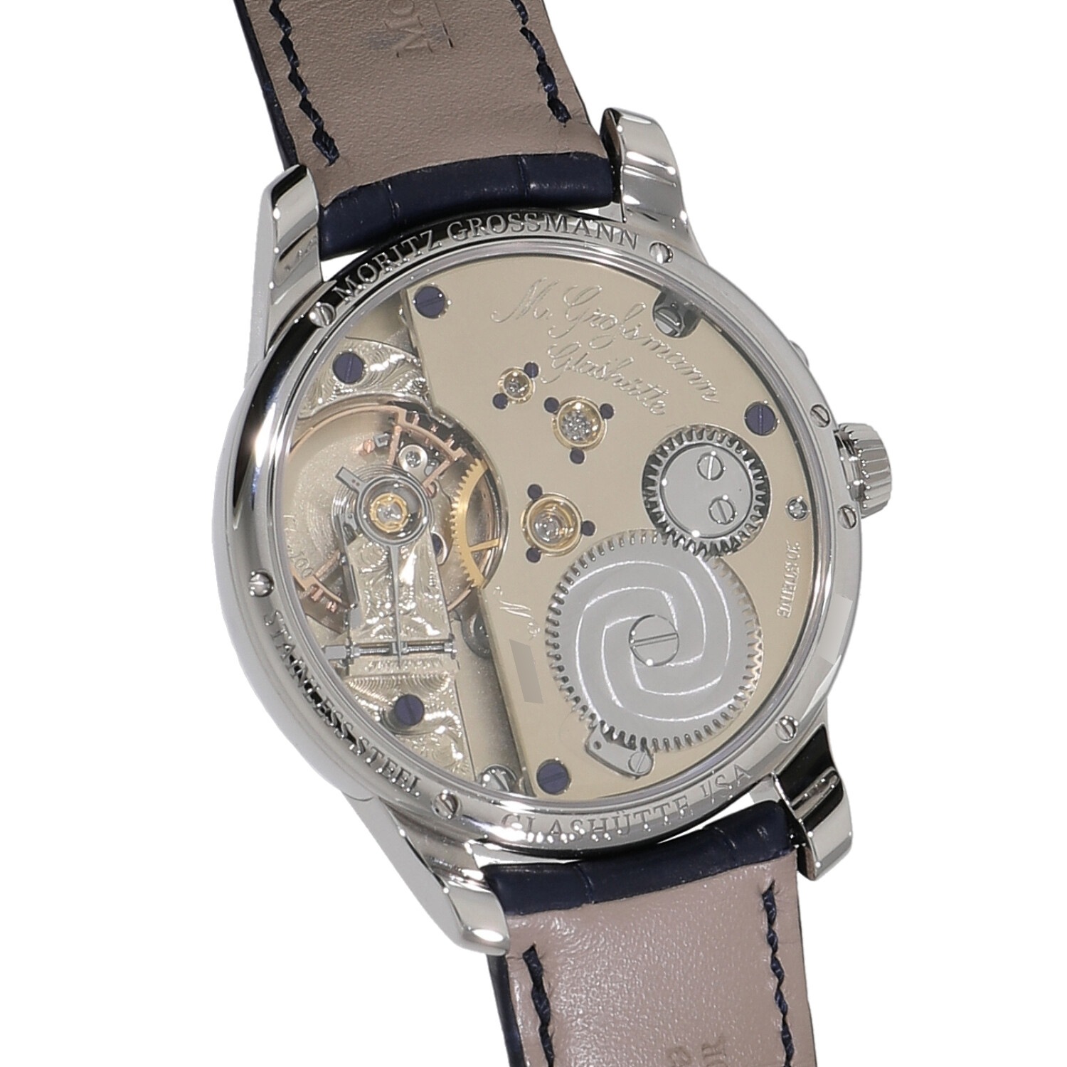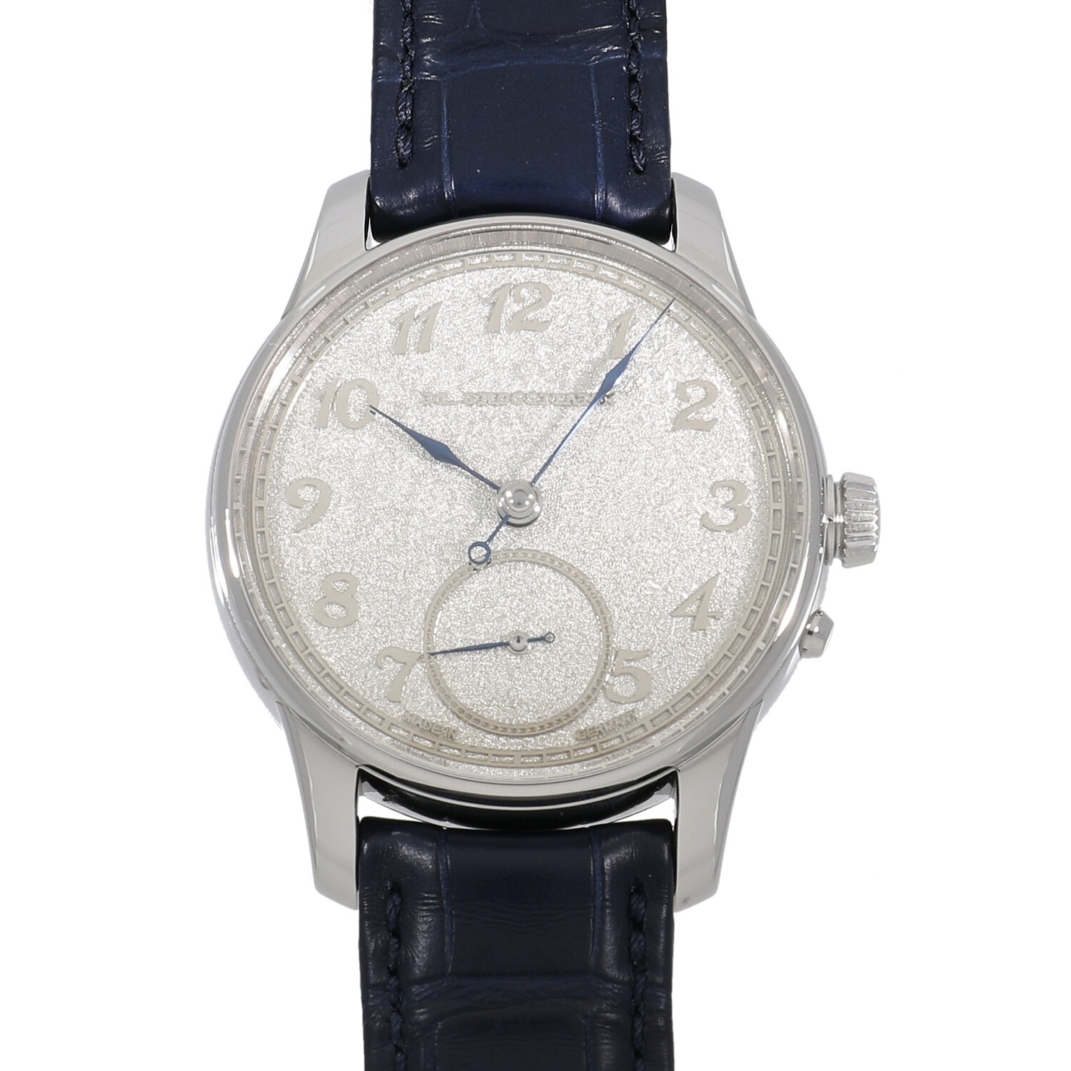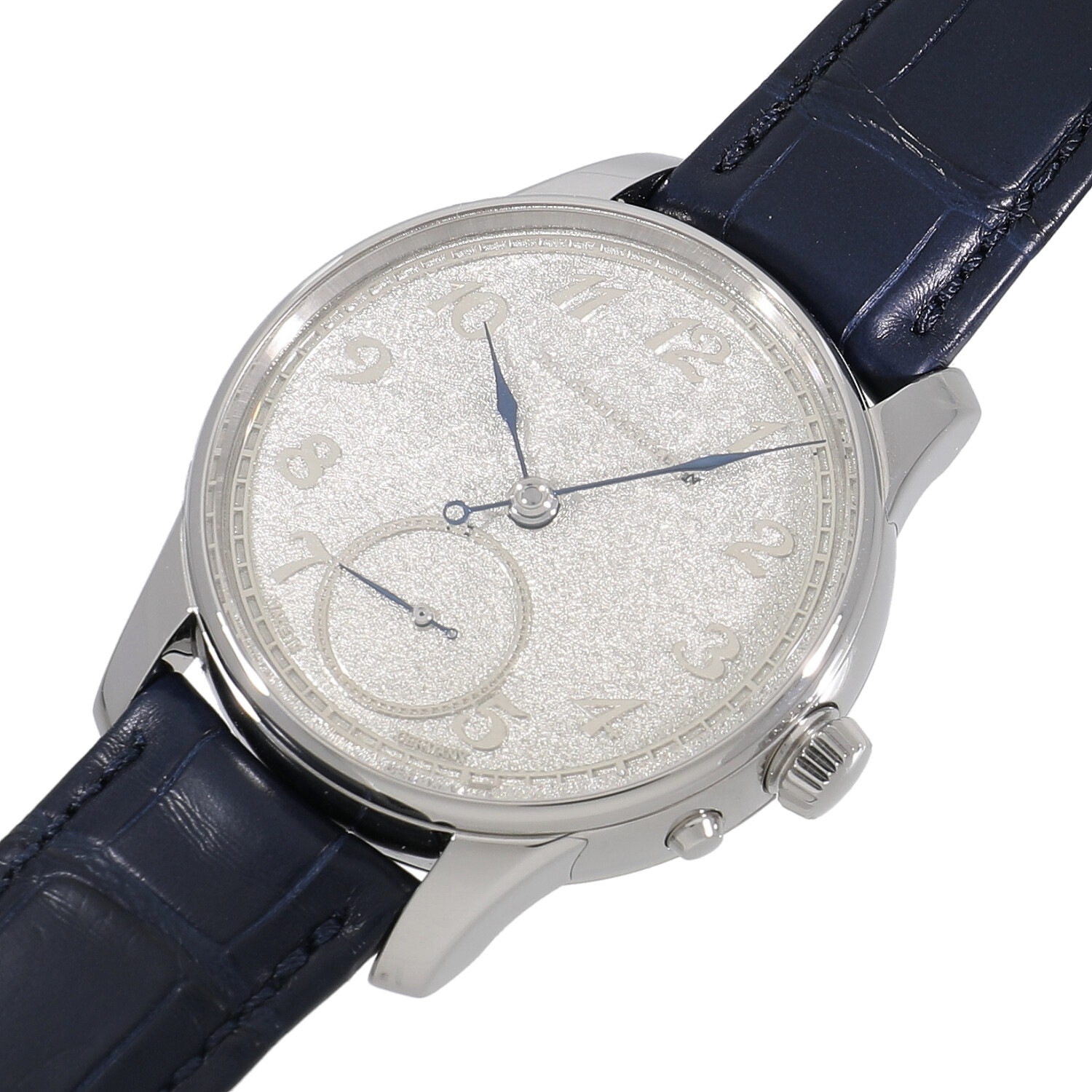 | モデルについて / Features | 2021年の新作 ドイツのドレスデン産まれのモリッツ・グロスマン氏は、1854年に友人のランゲ&ゾーネ創始者アドルフ・ランゲ氏の勧めで自らの工房をグラスヒュッテに設立。1855年に若くしてこの世を去り工房も解体しますが、時計師クリスティーネ・フッター氏と多くの時計愛好家の支援により2008年に伝説のブランドが復活を遂げます。不死鳥の意味を持つベヌーと名付けれ、ブランド復活の象徴とも言えるコレクションです。創業13周年を記念した誕生したベヌーは、ジャーマンシルバーにトレンブラージュという精緻なハンドエングレービングが施された特別なコレクションです。リューズを引き出してから時刻操作をする点は他の時計と共通ですが、時刻を合わせた後は4時位置のボタンを押すことで、再びムーブメントが動き出す仕様となっています。 |