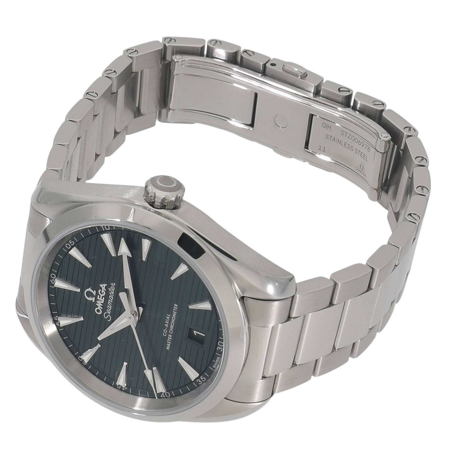 | モデルについて / Features | 2024年の新作 チークコンセプトと呼ばれる豪華ヨットのウッドデッキを連想させる横縞のダイヤルが特徴的なシーマスターアクアテラ。ロジウム仕上げ針とインデックスにはホワイトのスーパールミノヴァが塗布され、6時位置には日付表示が備えられています。こちらはケース径38mmのモデルで、サンブラッシュ仕上げのグリーンのPVDダイアルが美しい一本です。 |