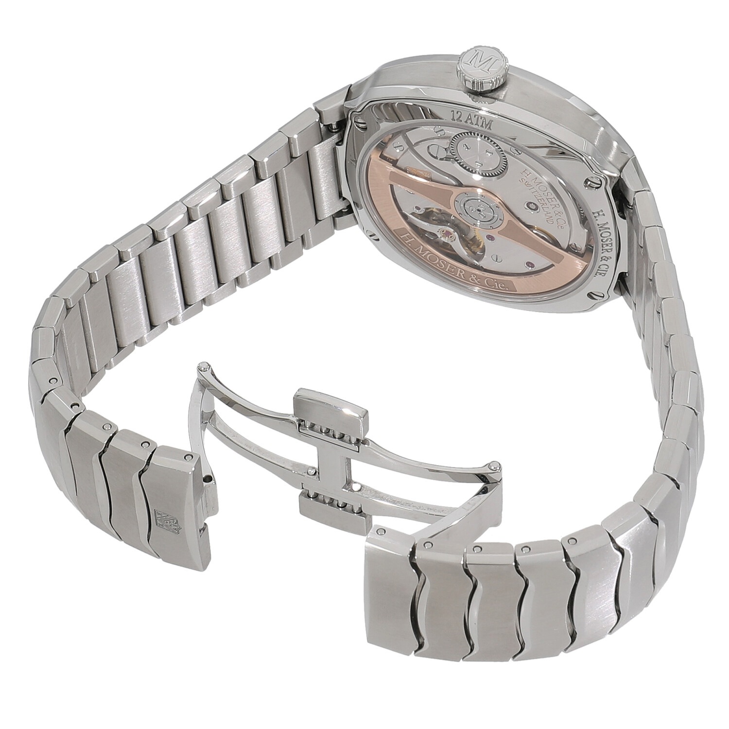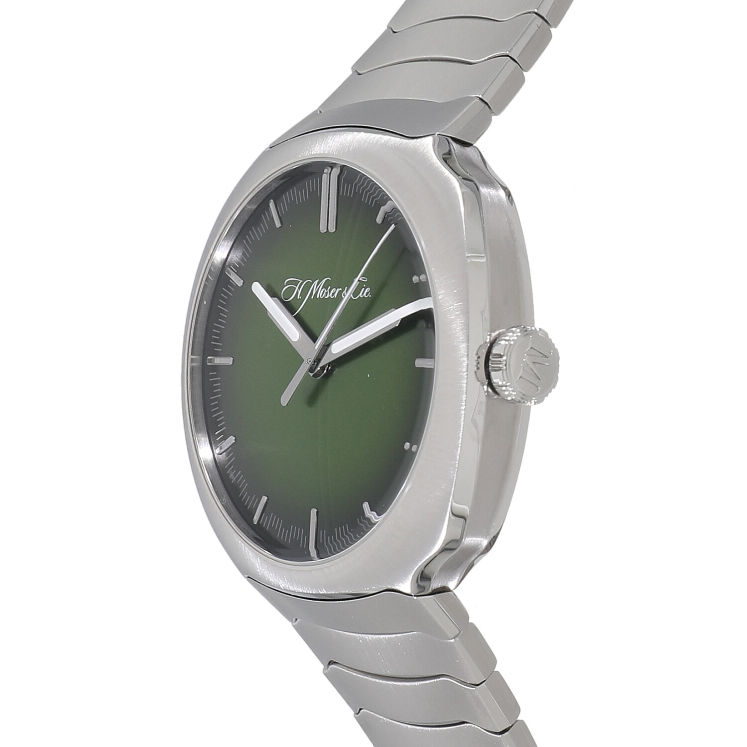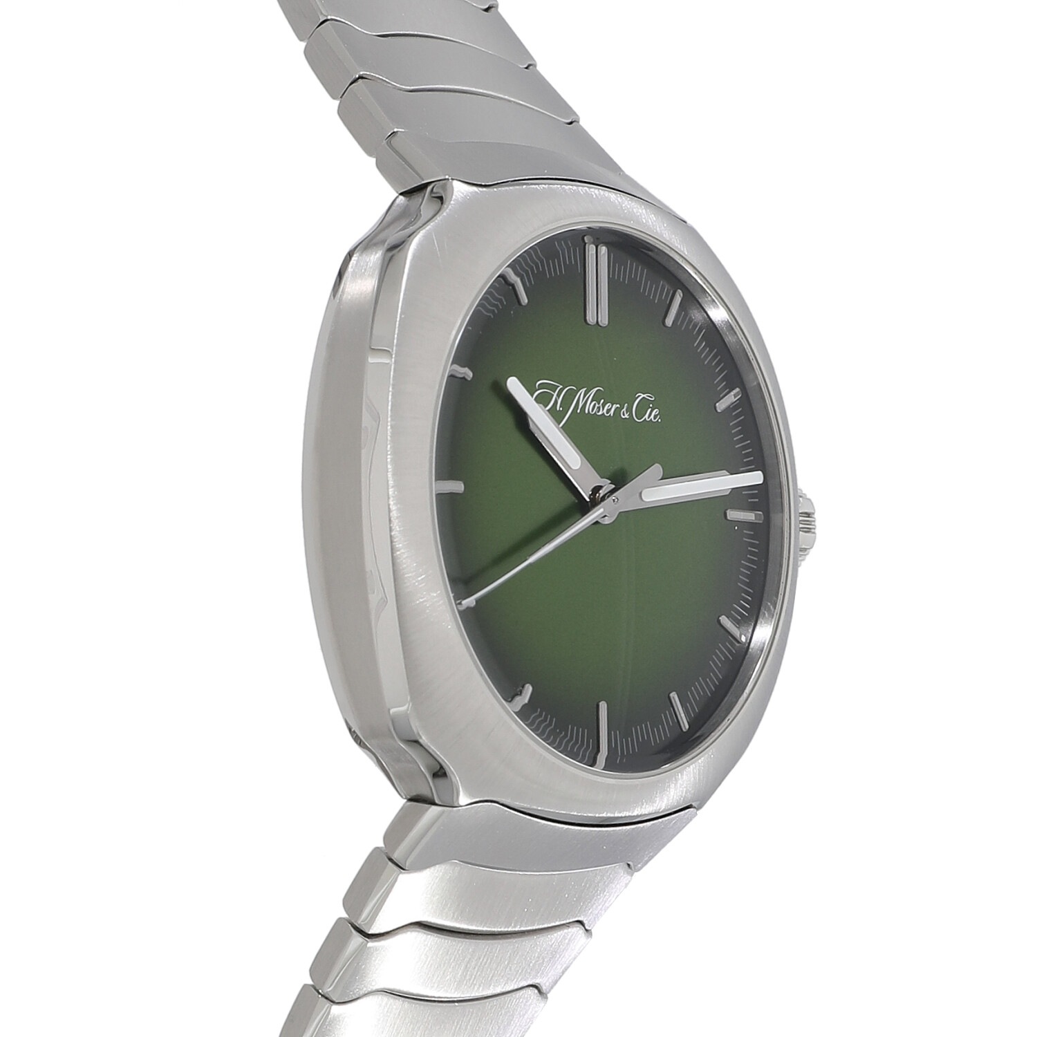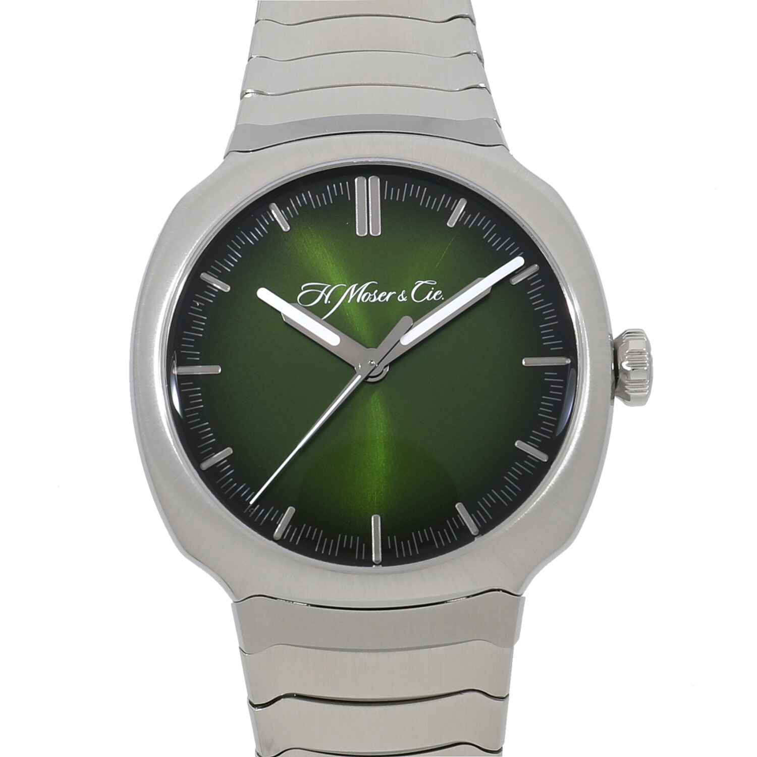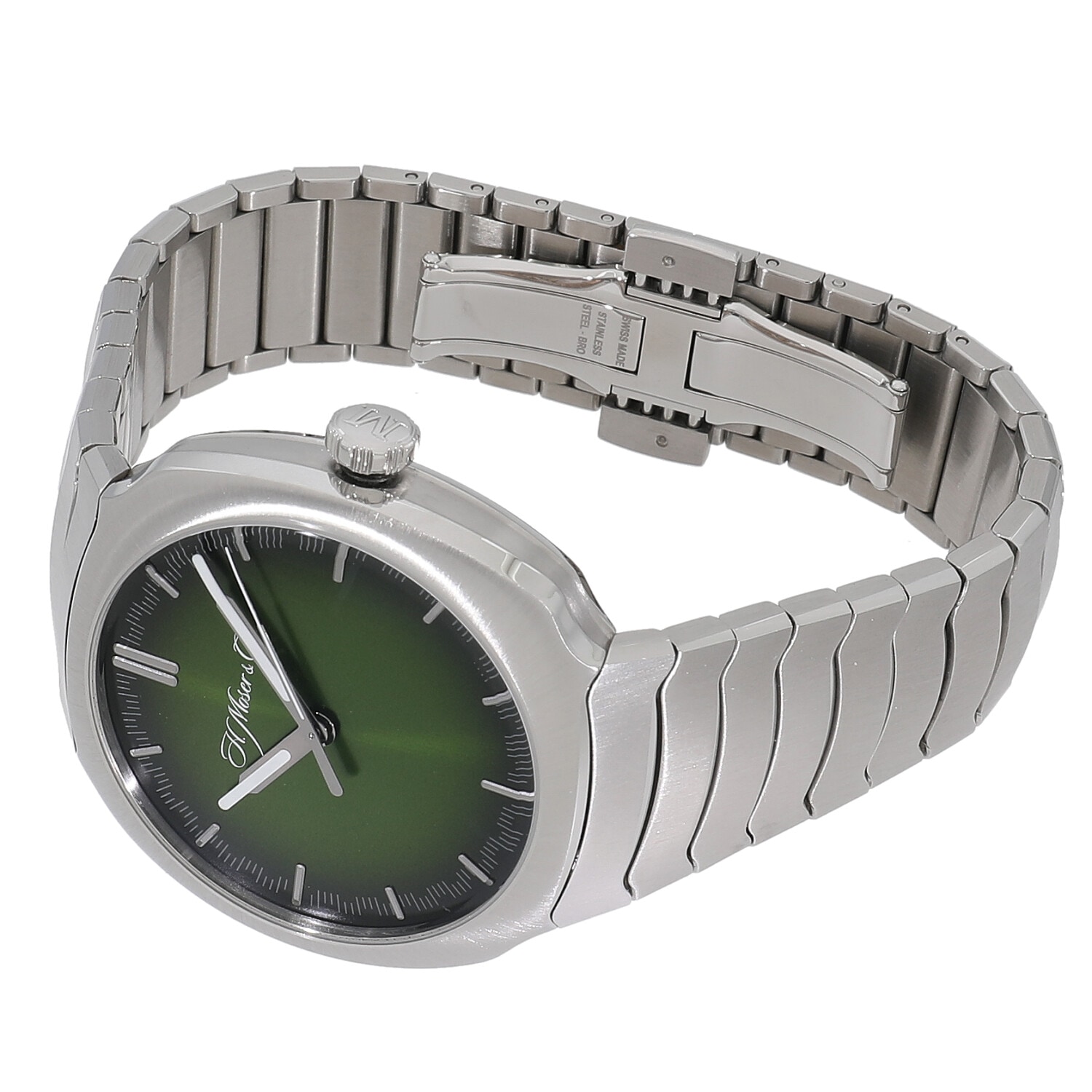 | モデルについて / Features | ドイツ・シャフハウゼンに産まれたハインリッヒ・モーザーが19世紀初頭の1928年に創設した歴史あるブランド。こちらは1920~30年代にかけて活躍した初の高速鉄道の特徴である美しい流線形に着想を得たモデルです。ラグを廃したケースと完全に一体化されたSSブレスレットは、H. モーザー社ならではの滑らかなデザインになっており、シンプルに時間だけを表示します。また文字盤はマトリックスグリーンのフュメダイヤルとなっており、H.モーザーらしさを感じられます。 |