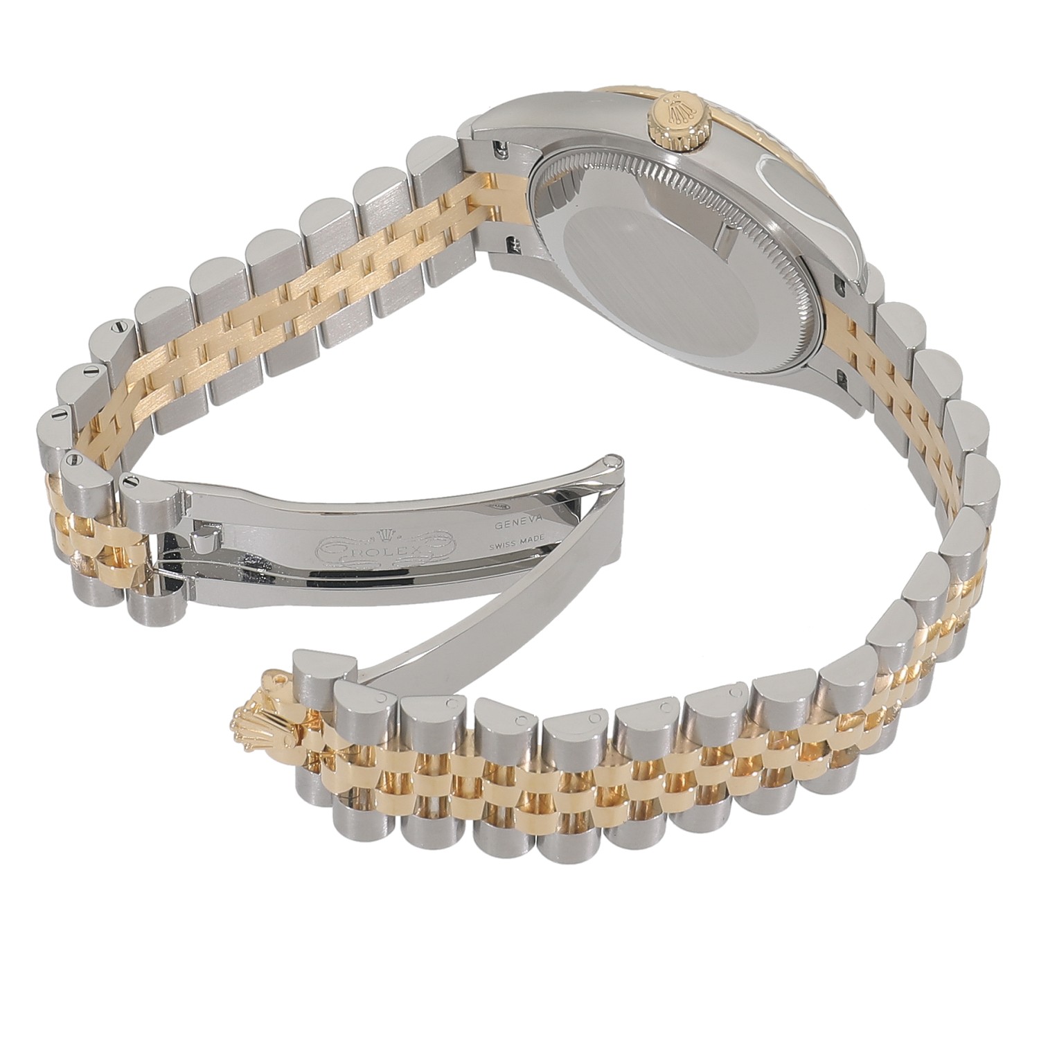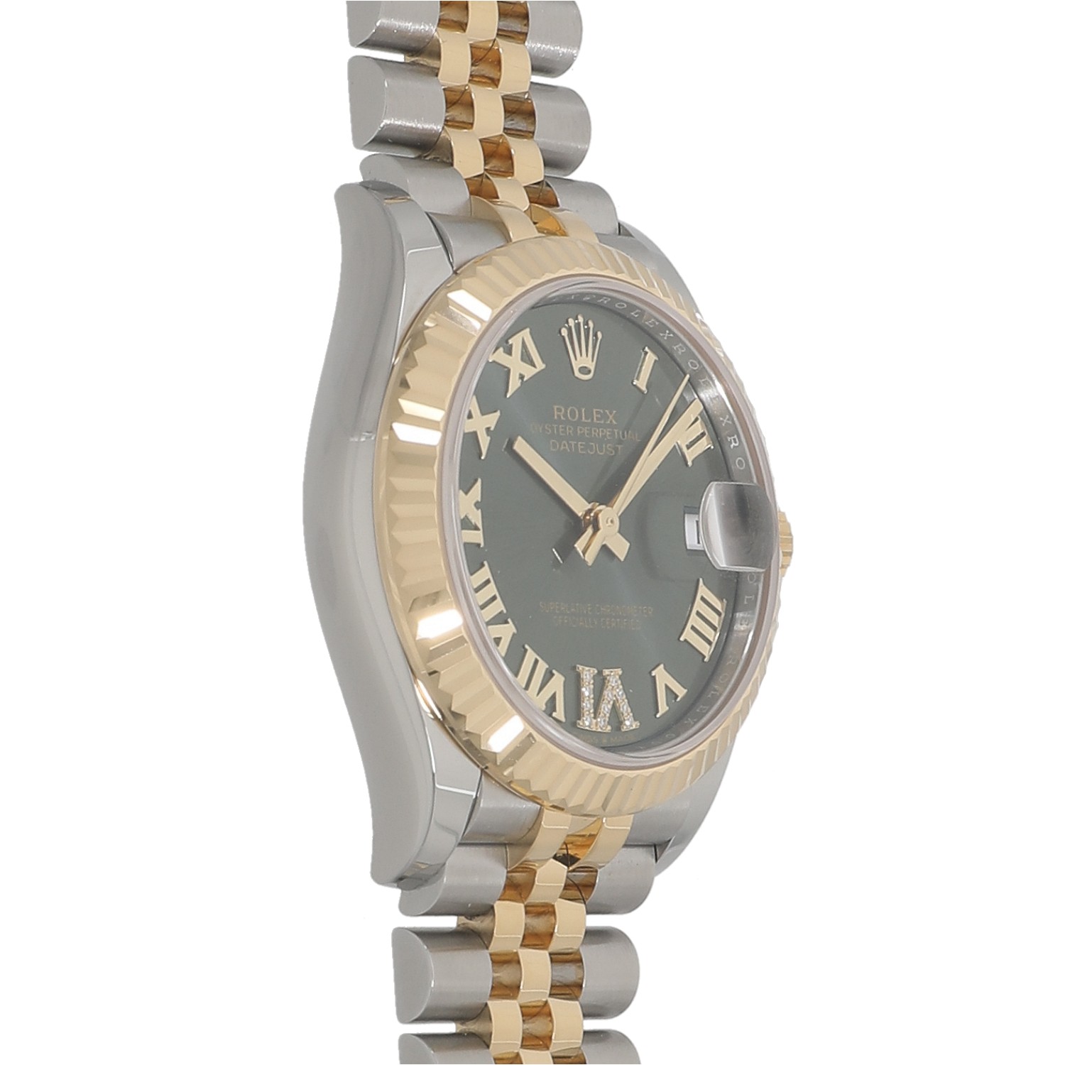 | モデルについて / Features | 1945年の誕生以来、ロレックスのアイコニックなコレクションとしてラインナップを続け、多くの男女に愛されるデイトジャスト。文字盤カラーや素材の組み合わせなど幅広い組み合わせも魅力。光を取り込みキラキラと光る美しいカッティング加工が施されたフルーテッドベゼルが目を惹き、ジュビリーブレスレットとの組み合わせが上品で高級感を醸し出しています。55時間のパワーリザーブを誇り、より高精度となった新型キャリバー2236を搭載しています。6時位置のローマンインデックスにはダイヤモンドがセットされており、エレガントさが際立っております。 |