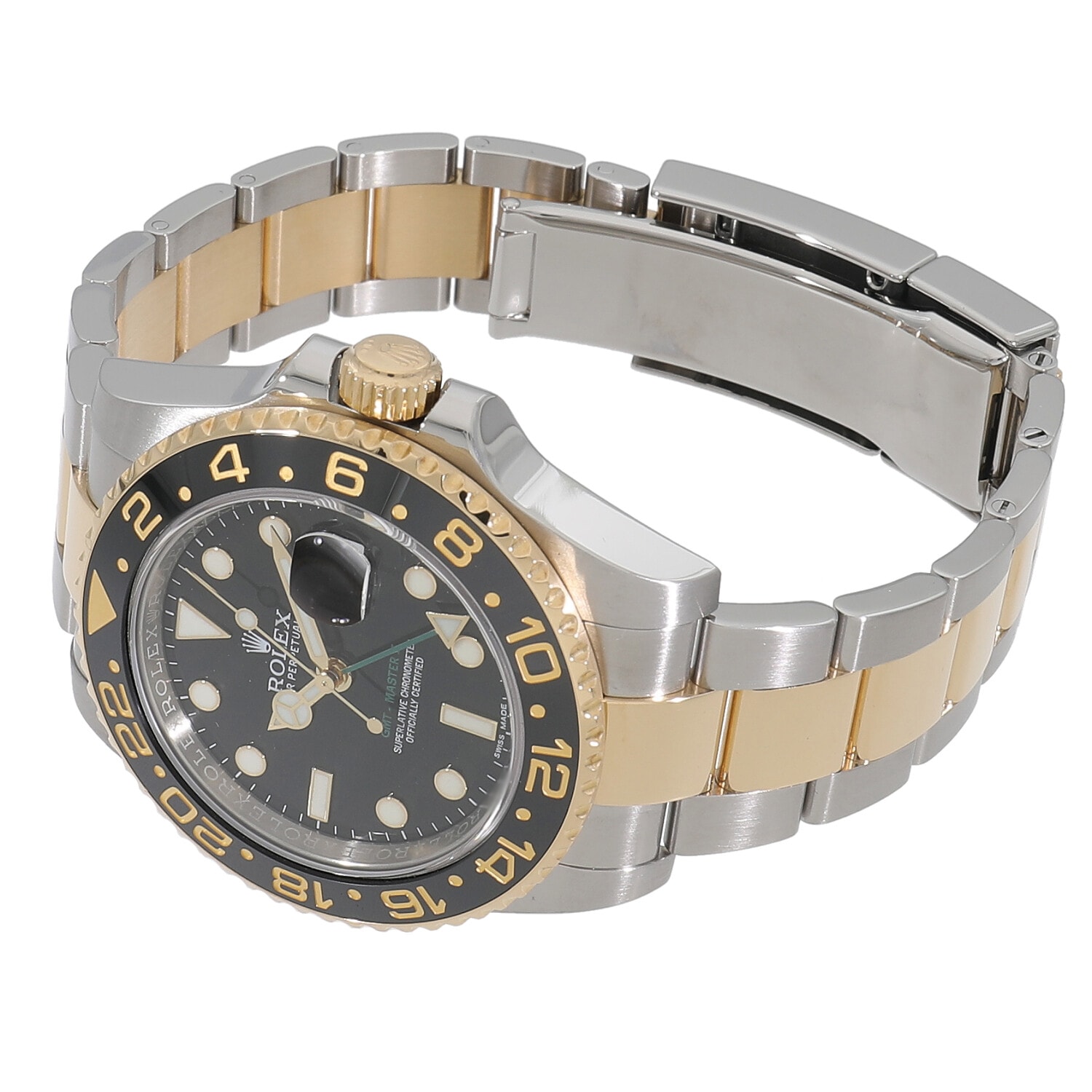 | モデルについて / Features | 24時間針と両方向に回転するベゼルを駆使する事で、3か国の時間帯を同時に読み取る事ができるGMTマスターⅡ。2007年に発表されたモデルより、ベゼルディスクは傷が付き難いセラミック製へ、ラグ幅はより太く変更され、全体的に高級感と堅牢性そして実用性が格段に向上しました。ステンレスとイエローゴールドのロレゾール仕様でラグジュアリーさを感じさせます。GMT針はロレックス社のコーポレートカラーであるグリーンが採用されています。ポリッシュ仕上げとヘアライン仕上げを巧みに組み合わせており、スポーツモデルながらエレガントさも感じられます |