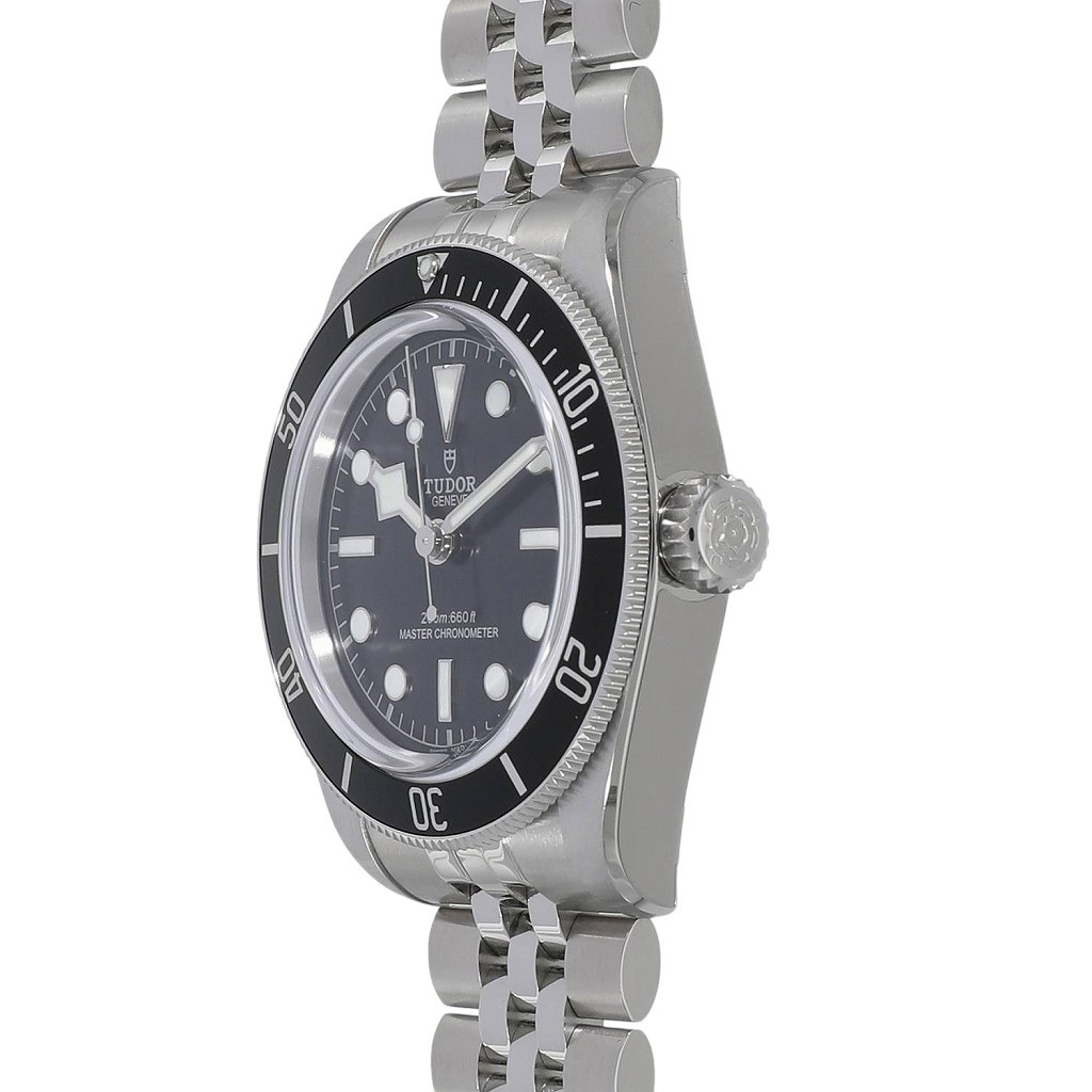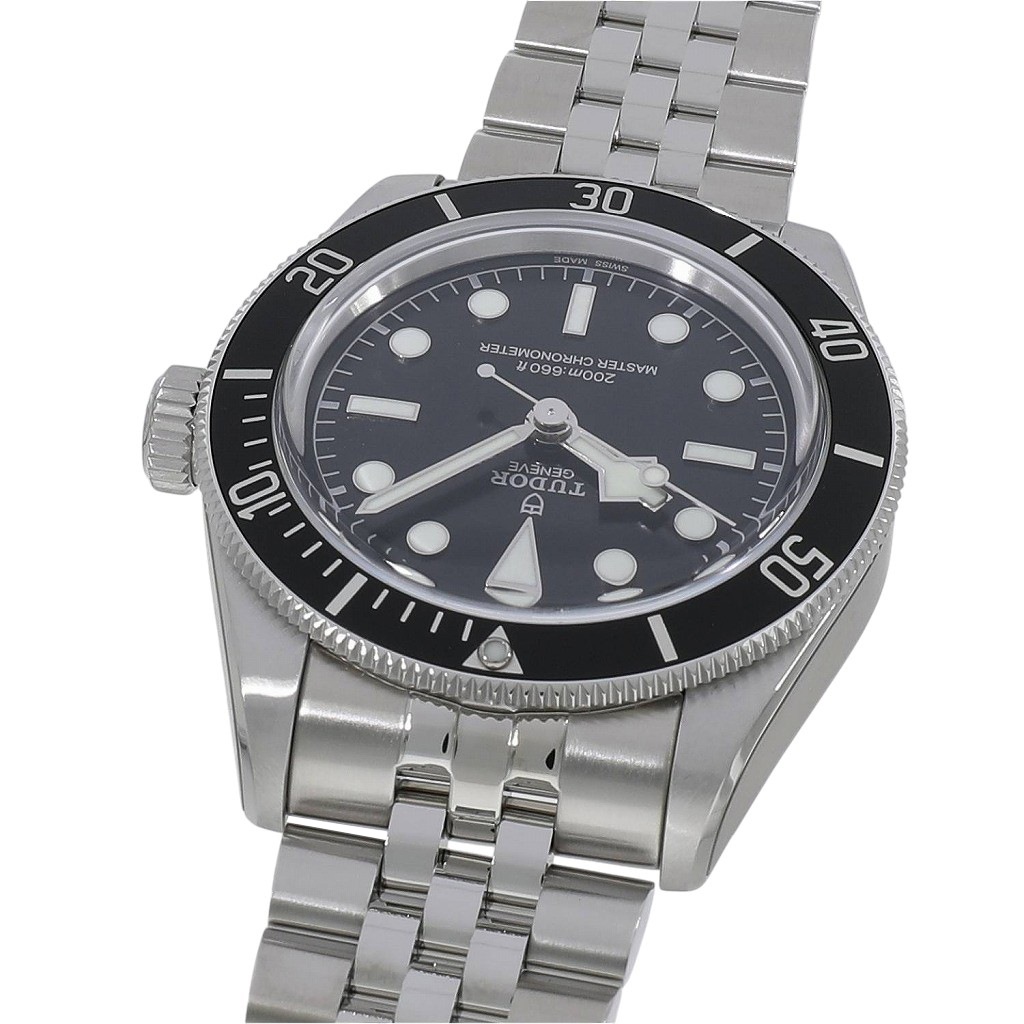 | モデルについて / Features | 2024年の新作 1950年代中頃に誕生したチューダーの初代ダイバーズウォッチであるRef.7922のデザイン意匠を忠実に受け継ぎ、ヘリテージコレクションとして2012年に誕生したブラックベイシリーズ。今やチューダーを代表するアイコン的コレクションとなりました。2023年に発表されたバーガンディカラーベゼルに続き、2024年に発表されたブラックベゼル仕様です。ムーブメントはMETASのマスタークロノメーターを認定を受け高い精度を誇り、70時間のパワーリザーブを備えます。8ミリの長さを5段階で簡単に調整できるT-fitクラスプを搭載しています。ヘアラインとポリッシュ仕上げのオーバル(楕円)型のコマを5列に組み合わせたブレスレットを備え、スポーティーな見た目ながら上品さと高級感を醸し出しています。 |