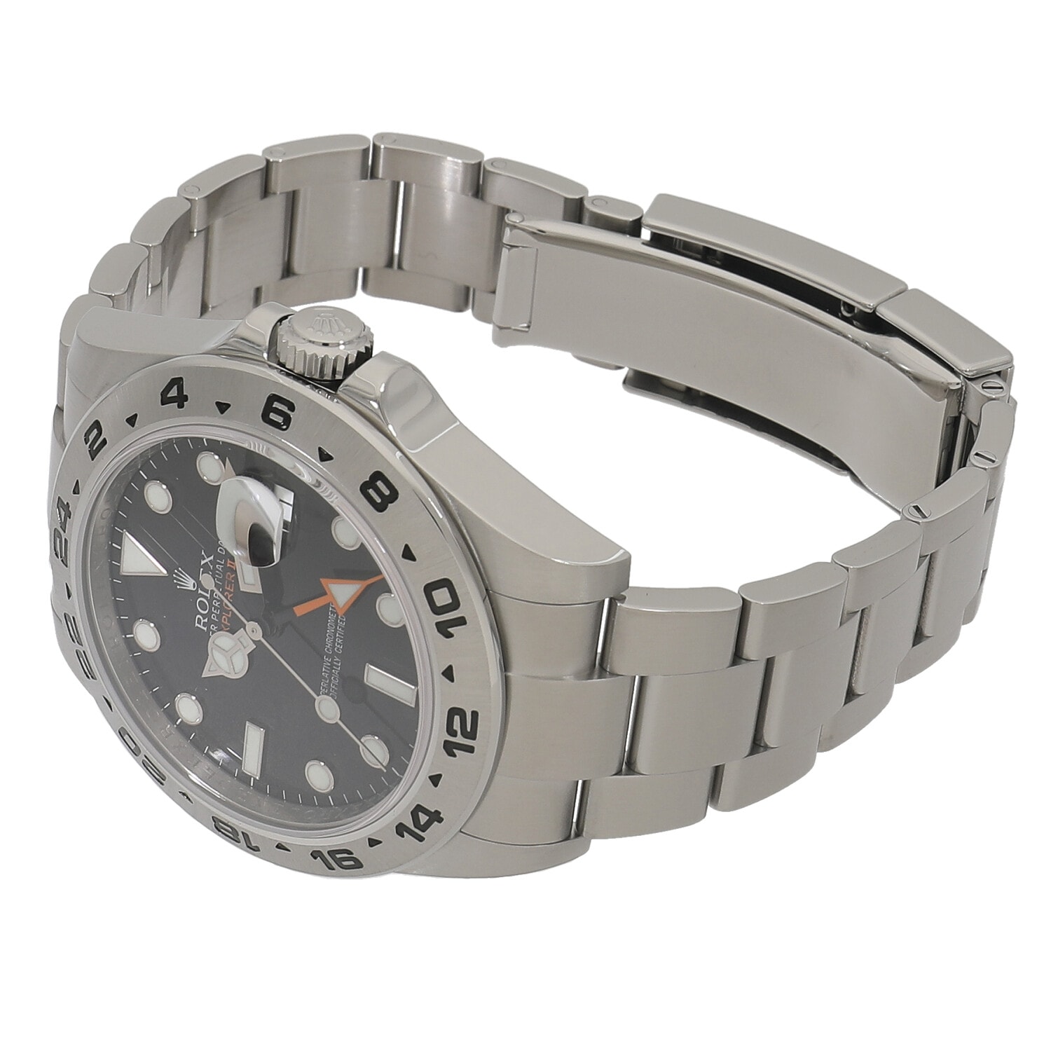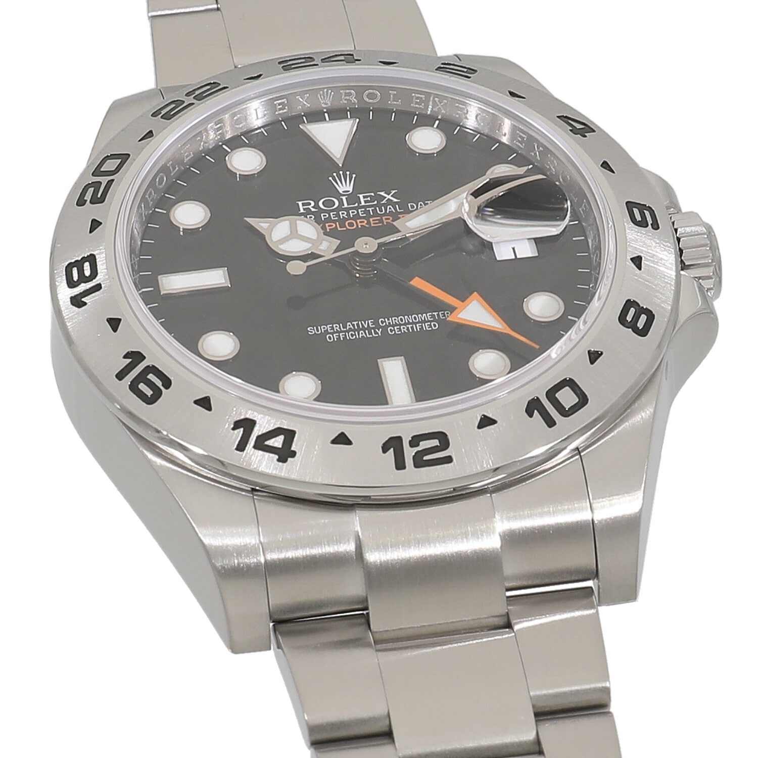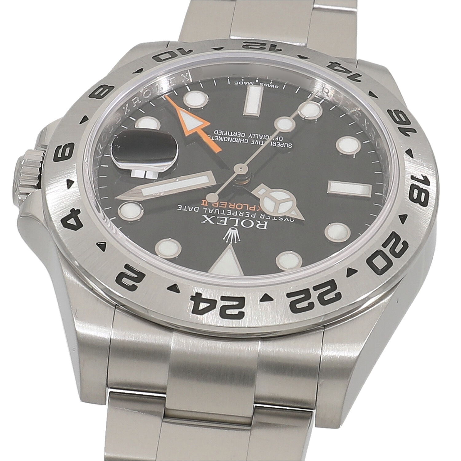 | モデルについて / Features | 1971年に初代モデルが誕生した探検家という意味を持つエクスプローラーII。洞窟などの暗闇の中でも昼夜を判別できるよう、大きく太い視認性の良い各針やインデックスを備えます。矢印型の24時間針は昼夜の判別はもちろんですが、異なる2か国の時刻を同時に読み取る事が出来ます。初代エクスプローラーIIが誕生し40周年を迎えた記念すべき2011年に発表されました。最新モデルらしくケースやブレスレットまたムーブメントも最新の仕様に刷新された事で、堅牢性や実用性が飛躍的に向上しました。 |