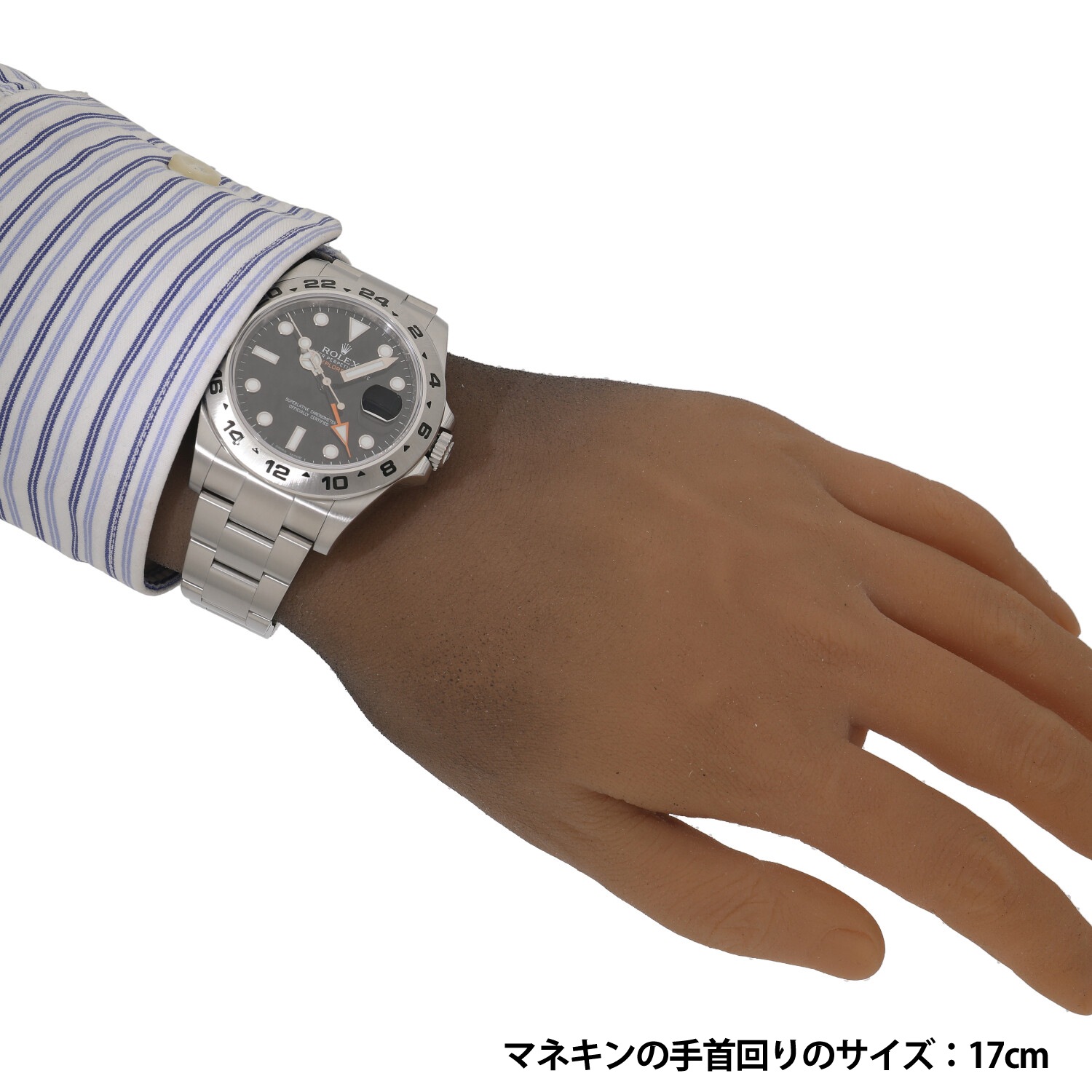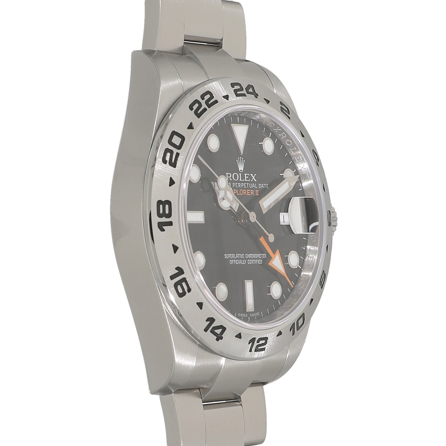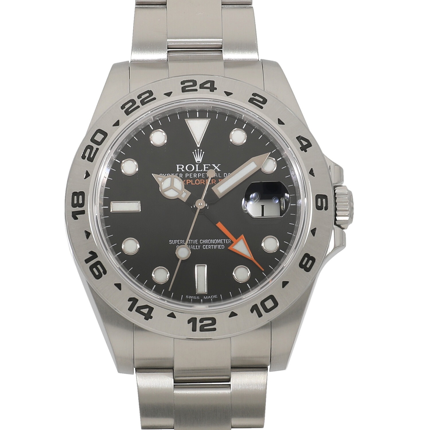 | モデルについて / Features | 1971年に初代モデルが誕生した探検家という意味を持つエクスプローラーII。洞窟などの暗闇の中でも昼夜を判別できるよう、大きく太い視認性の良い各針やインデックスを備えます。矢印型の24時間針は昼夜の判別はもちろんですが、異なる2か国の時刻を同時に読み取る事が出来ます。初代エクスプローラーIIが誕生し40周年を迎えた記念すべき2011年に発表されました。最新モデルらしくケースやブレスレットまたムーブメントも最新の仕様に刷新された事で、堅牢性や実用性が飛躍的に向上しました。 |