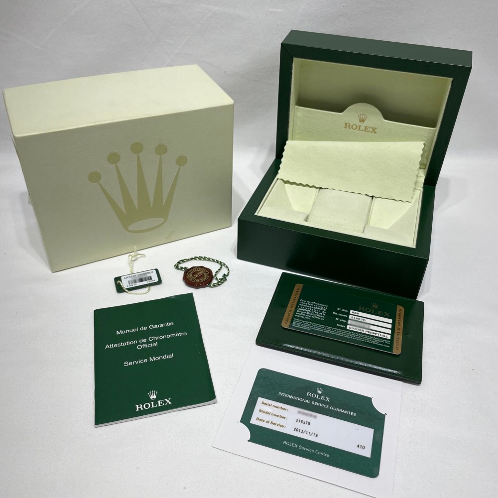 | 付属品 / Accessories | 純正ボックス(外箱少し汚れ) / 国際保証書(海外:2013年6月 ) /日本ロレックス国際サービス保証書(2013年11月)、ギャランティカバー、タグ |