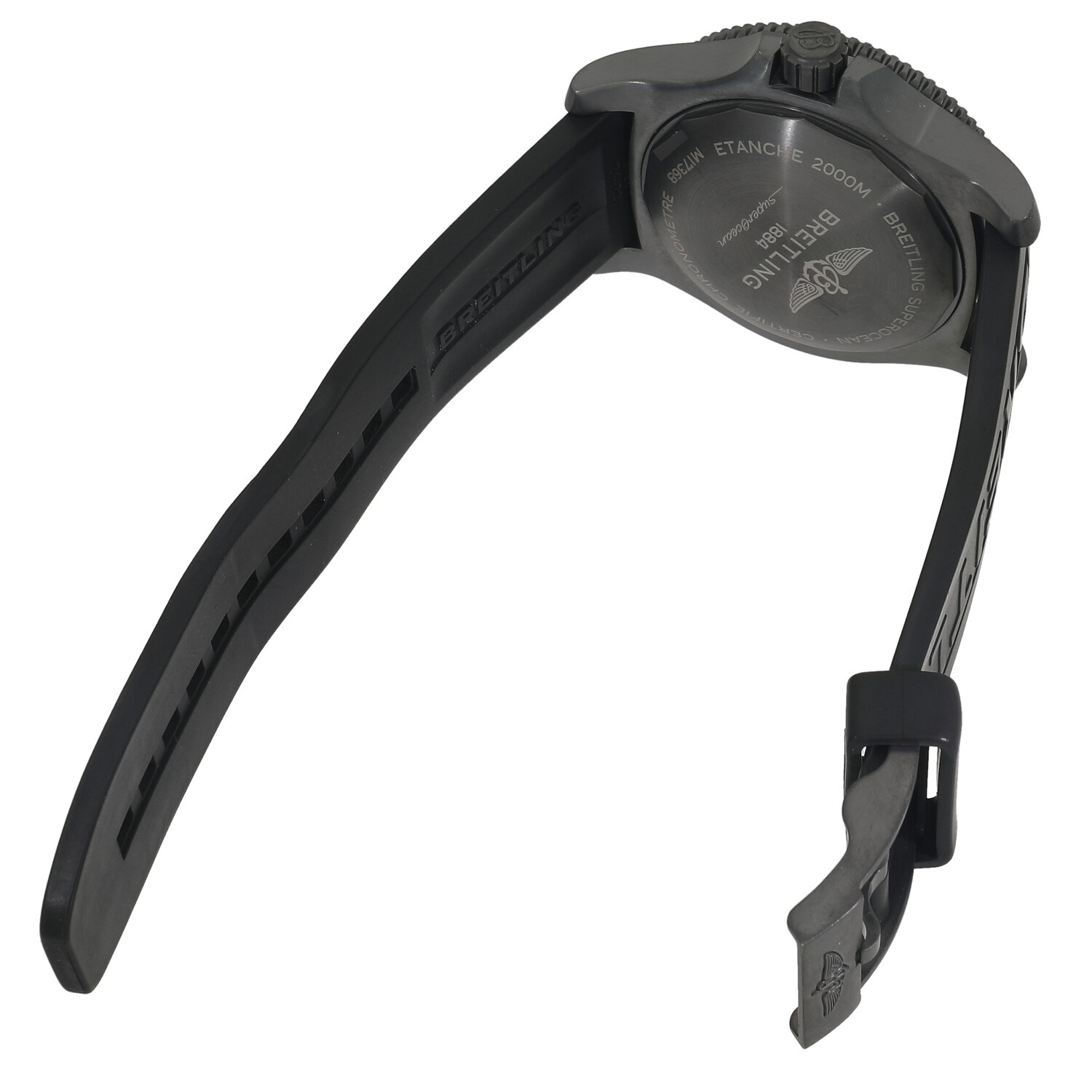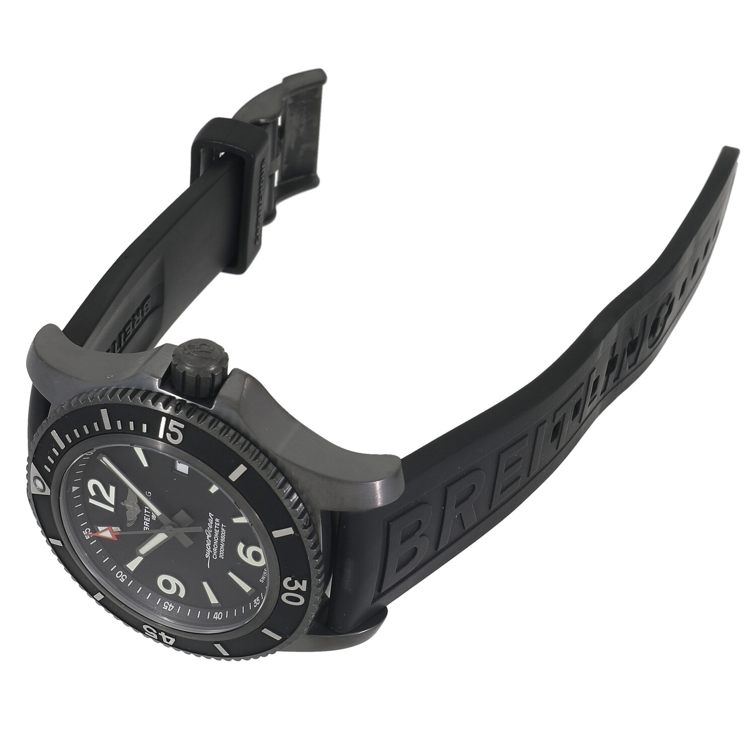 | モデルについて / Features | 1957年に初代モデルが誕生したブライトリングのダイバーズウォッチコレクションであるスーパーオーシャン。迫力と存在感を感じさせる46mmと大ぶりなステンレス製のケースには、艶消しのブラックDLCコーティングが施されています。大きく視認性の良いインデックスにはルミノバ夜光が塗布されており、深海などの暗闇でも時刻の視認性に優れています。ヘリウムエスケープバルブをケースサイドに装備し、飽和潜水にもご使用いただける2000m防水を誇る本格ダイバーズウォッチです。 |