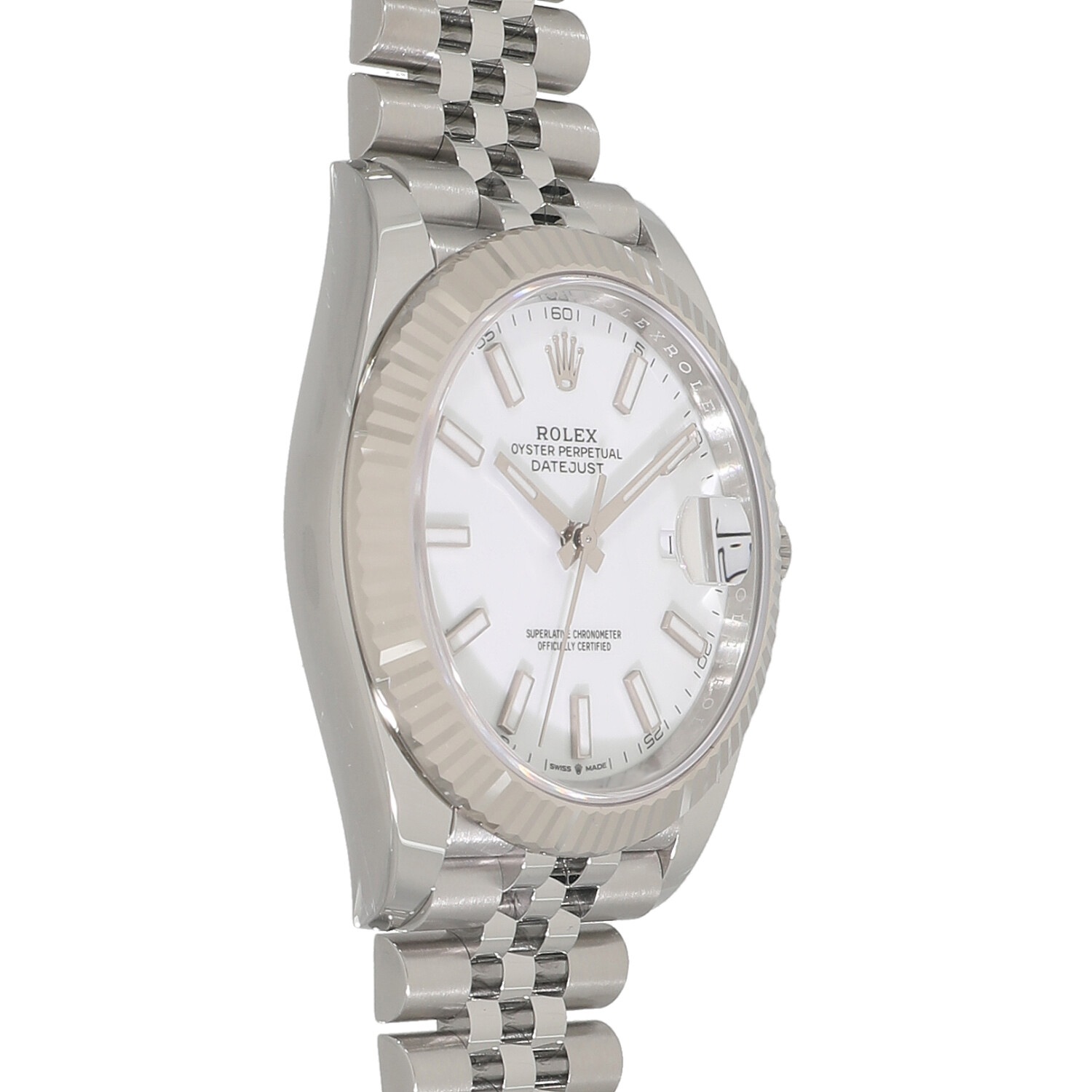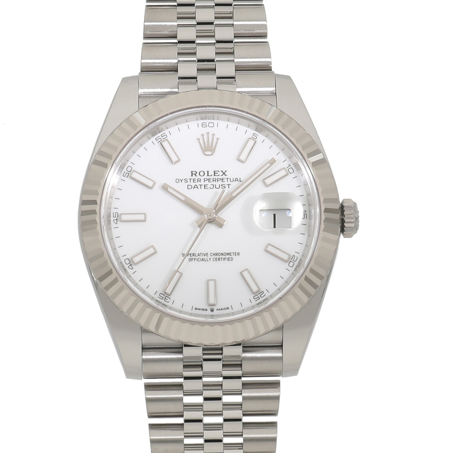 | モデルについて / Features | 1945年に誕生して以来、ロレックスのアイコニックなコレクションとして存在を続けるデイトジャスト。幅広いバリエーションで高い人気を得ているデイトジャスト。2012年にケース径を36mmから41mmへとサイズアップしてデイトジャストIIが誕生し、2017年にはムーブメントを新キャリバー3235へと変更しリファレンスナンバーとモデル名がデイトジャスト41へと変更されました。ホワイトゴールド製のフルーテッドベゼルが光を受けて輝きを放ちエレガントな印象を与えてくれます。新キャリバー3235は、日付変更の禁止時間帯がなく、昼夜問わずいつでも日付の変更が可能となり利便性が向上しました。 |